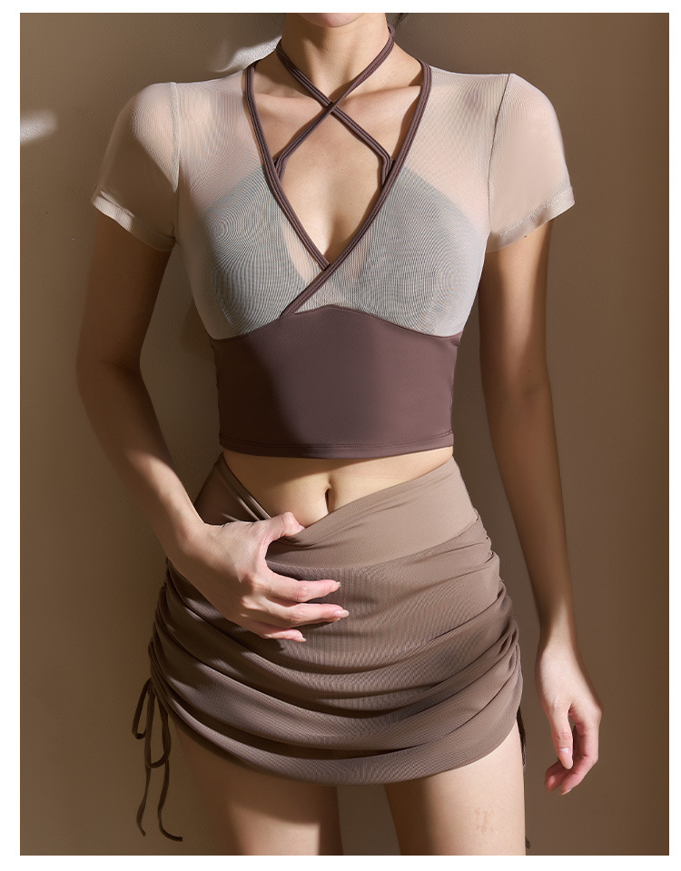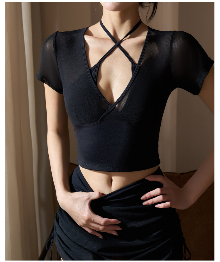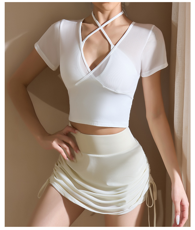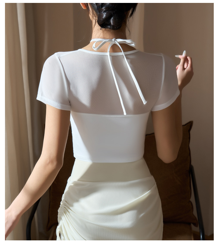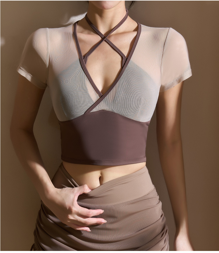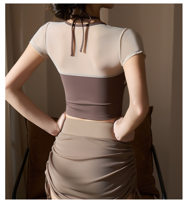 새로운 가짜 투피스 메쉬 요가 세트 반팔 여성 러닝 스포츠 피트니스 세트 탑 할로우 뷰티 백 통기성 티셔츠
