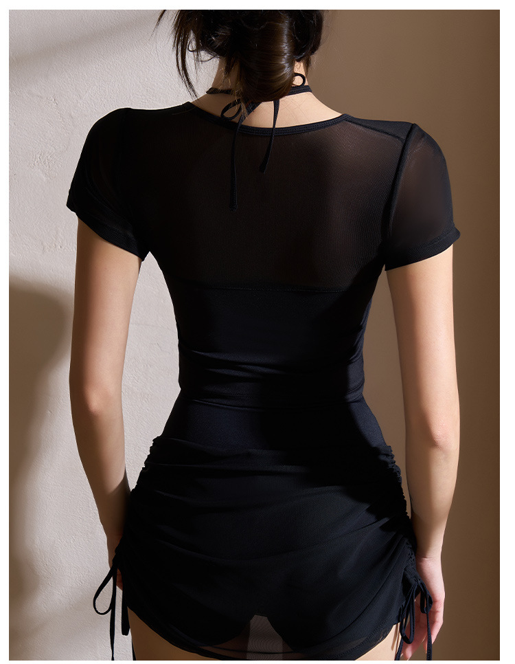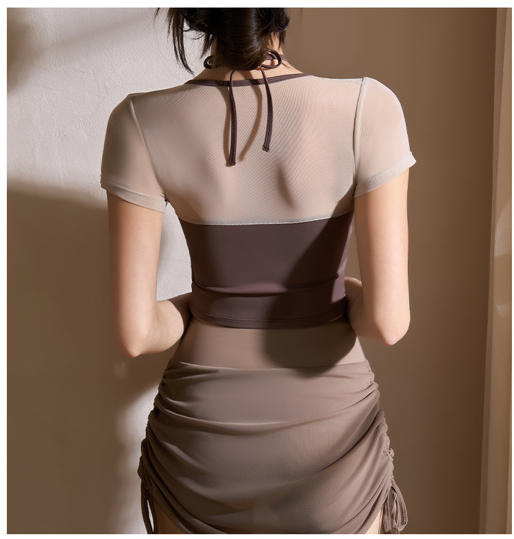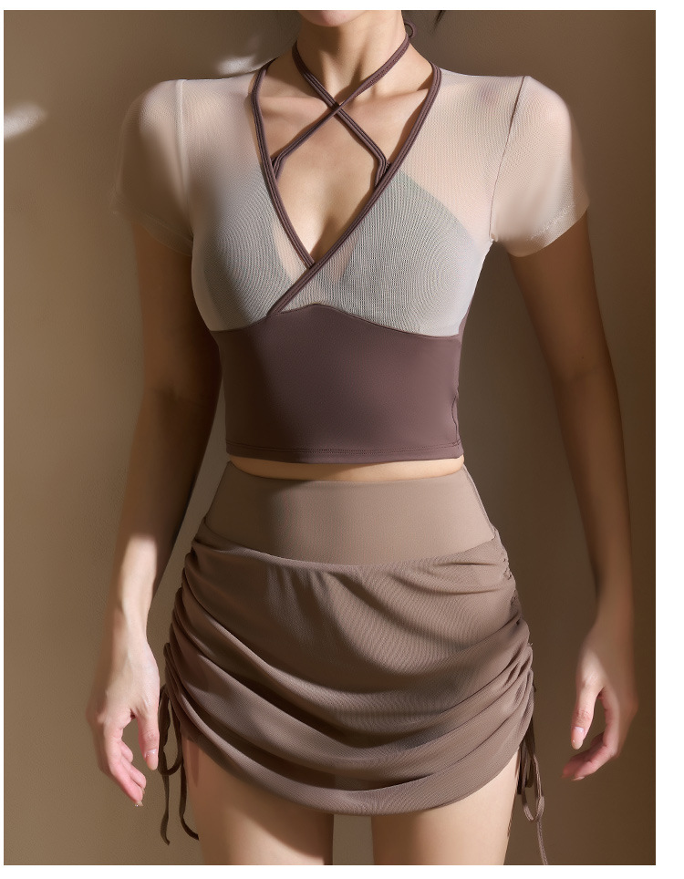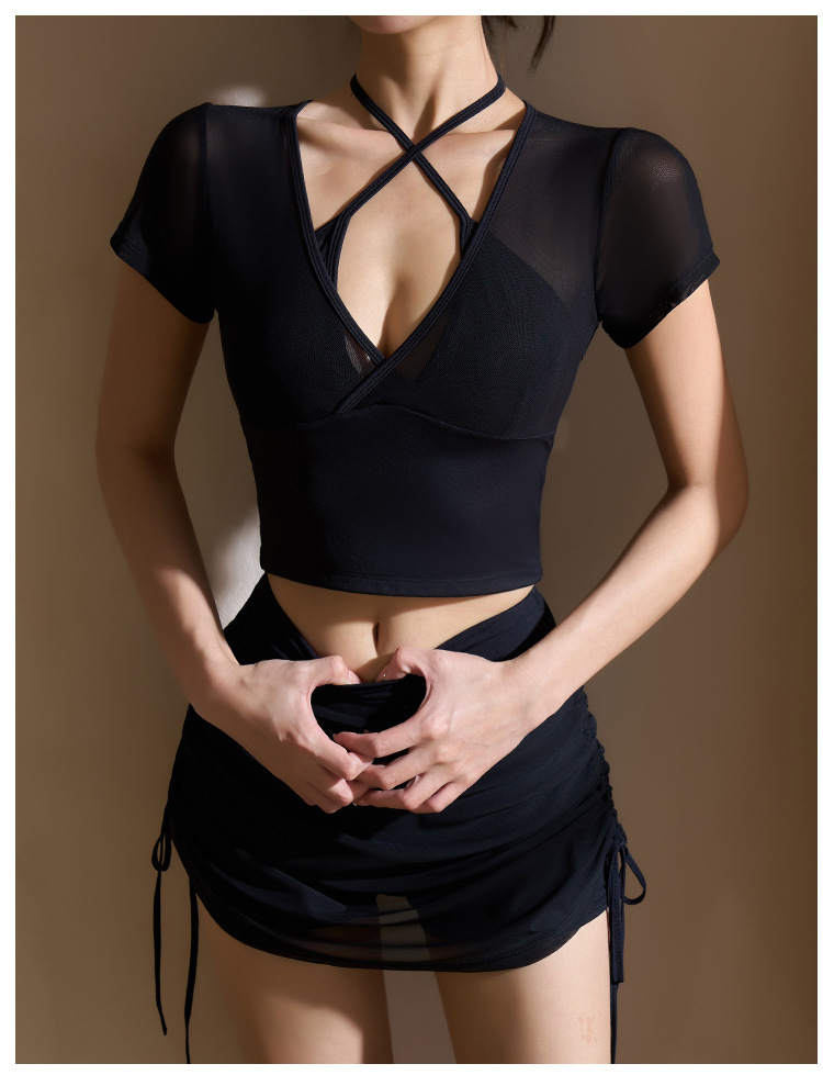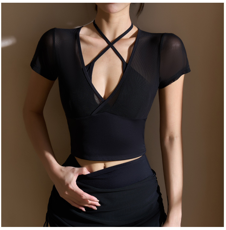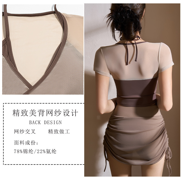 새로운 가짜 투피스 메쉬 요가 세트 반팔 여성 러닝 스포츠 피트니스 세트 탑 할로우 뷰티 백 통기성 티셔츠