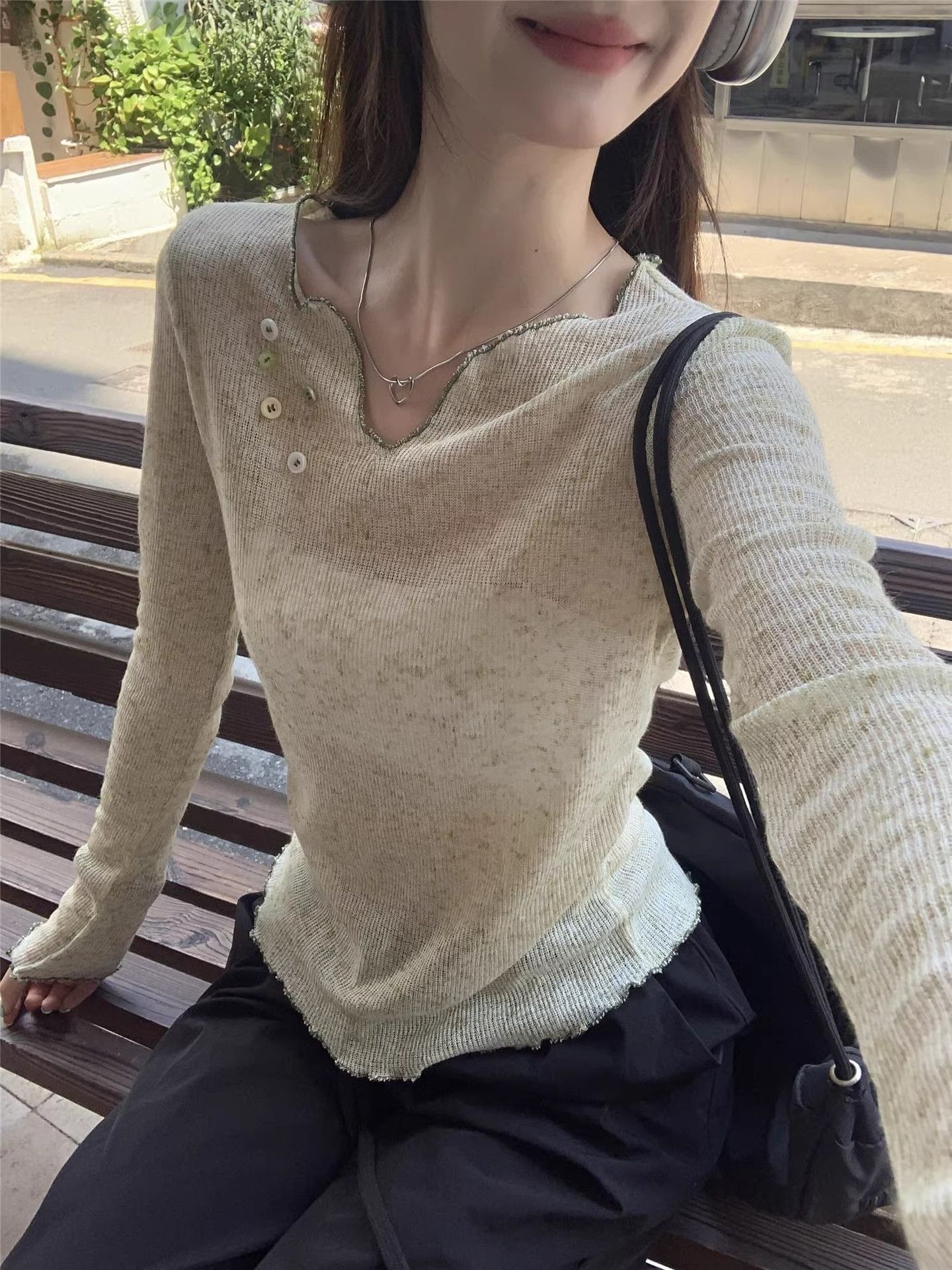 새로운 스타일 게으른 스타일 V 넥 슬림 핏 캐주얼 선스크린 긴팔 티셔츠 여성용 얇은 탑 틈새 에어컨 블라우스스토어 가기