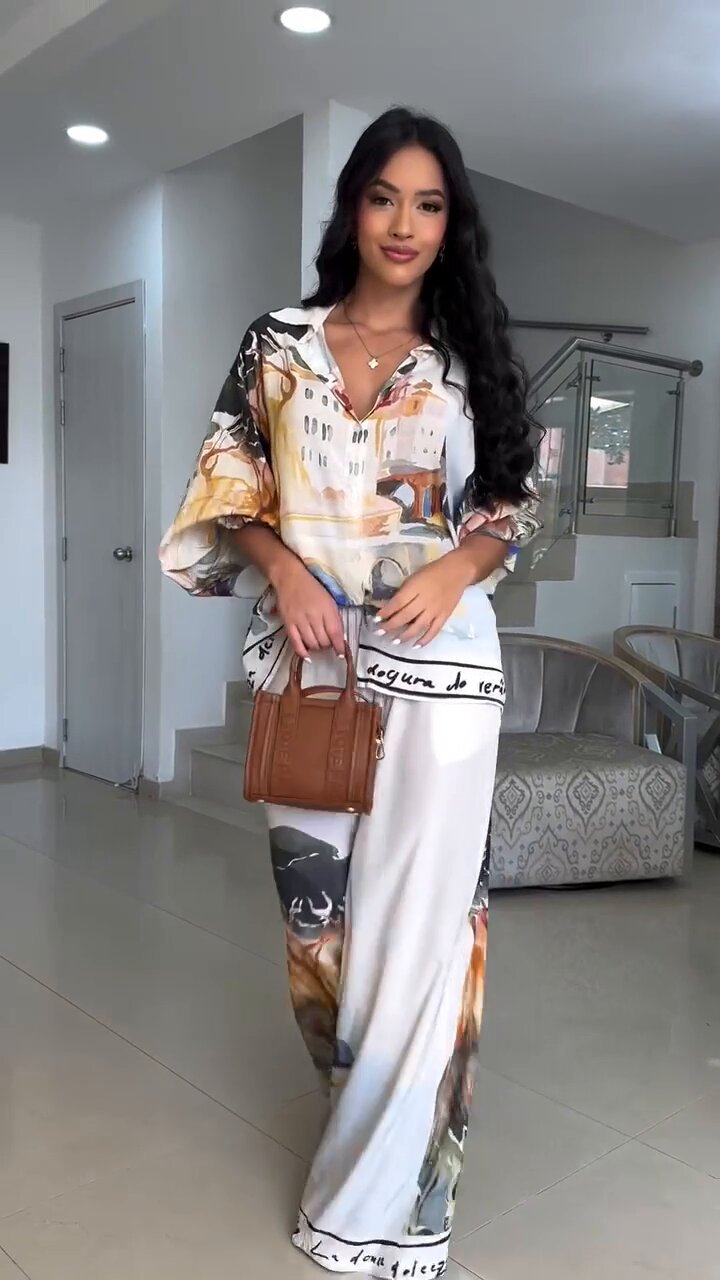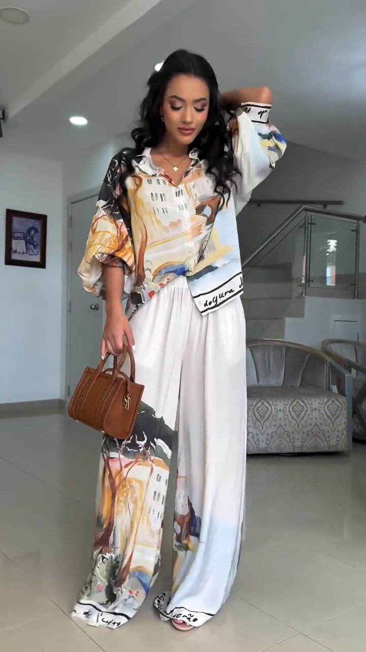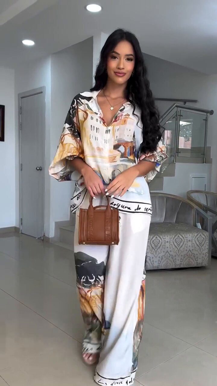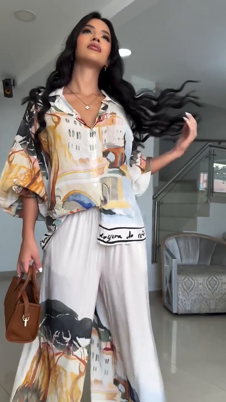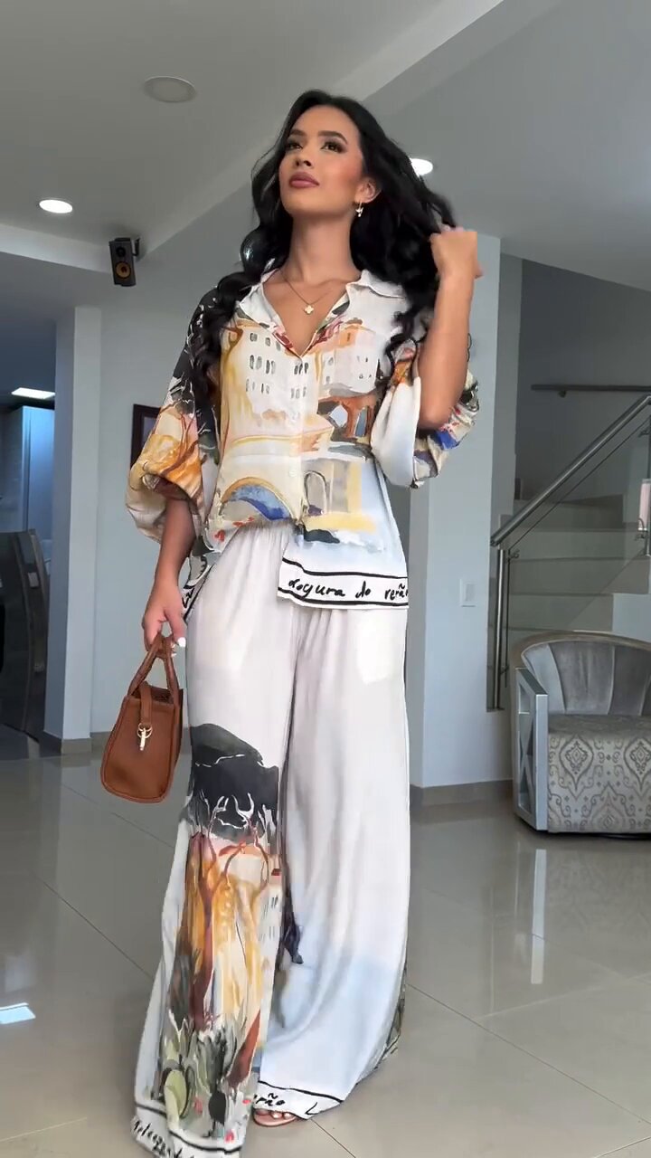 유럽 및 미국 여성복 2025 신상 프린트 루즈핏 패션 랜턴 슬리브 셔츠 와이드 팬츠 투피스 세트