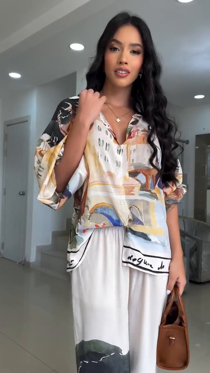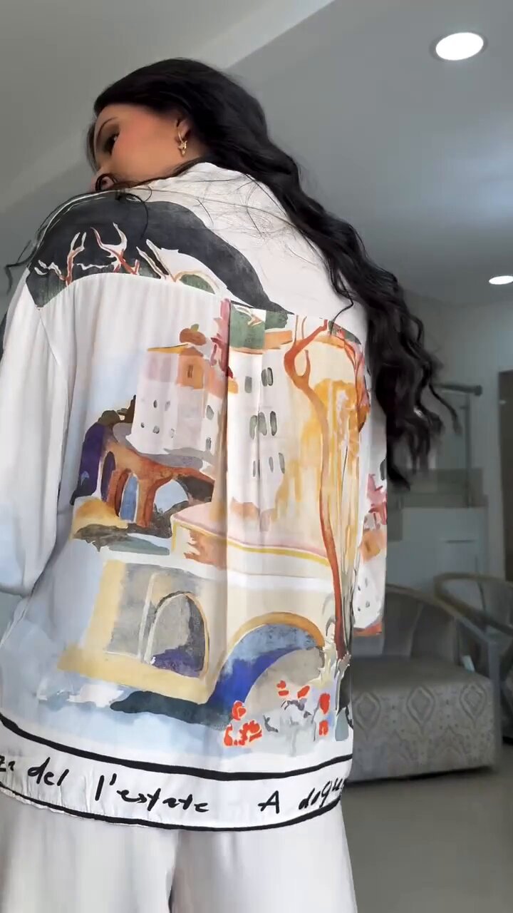 유럽 및 미국 여성복 2025 신상 프린트 루즈핏 패션 랜턴 슬리브 셔츠 와이드 팬츠 투피스 세트스토어 가기