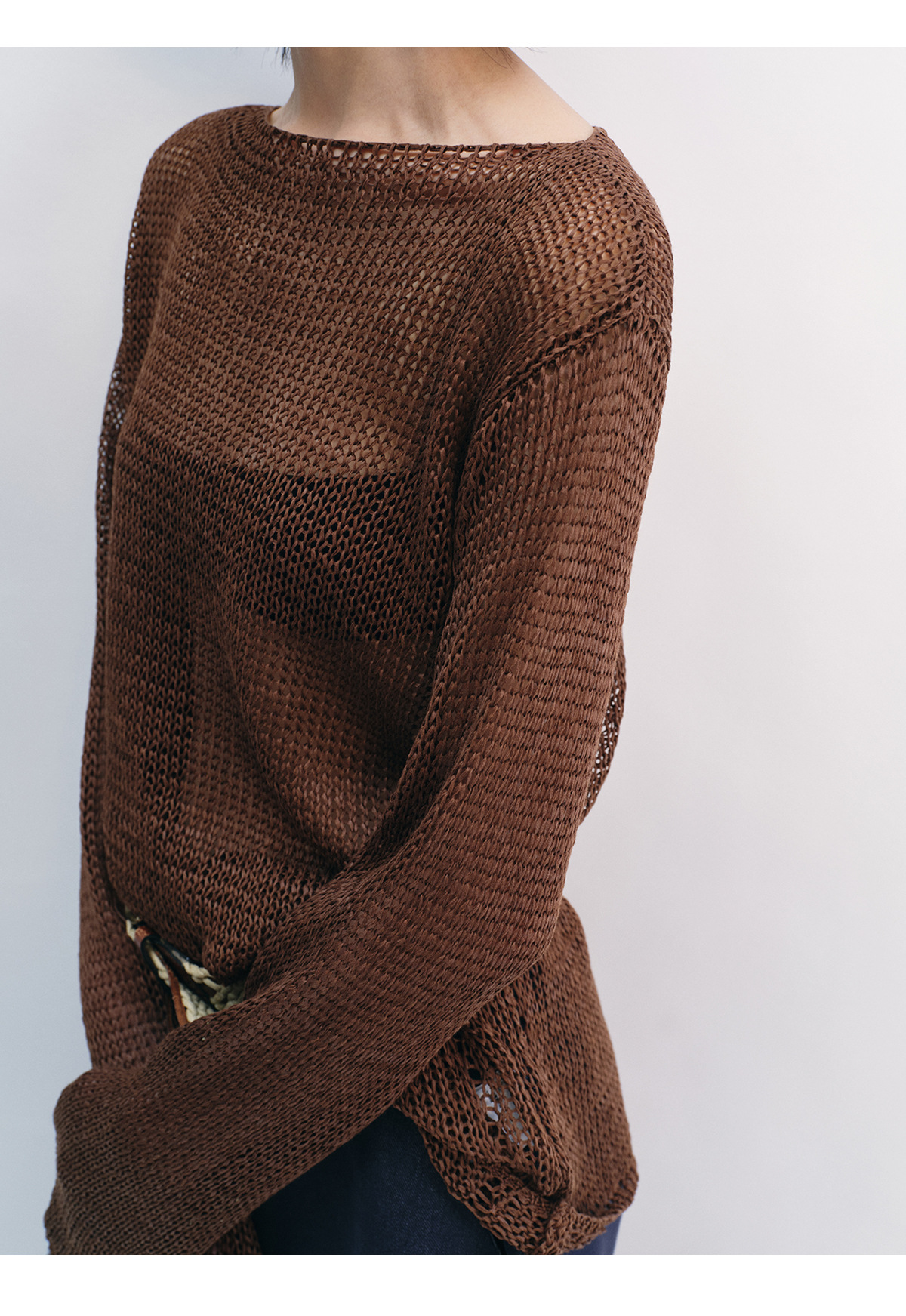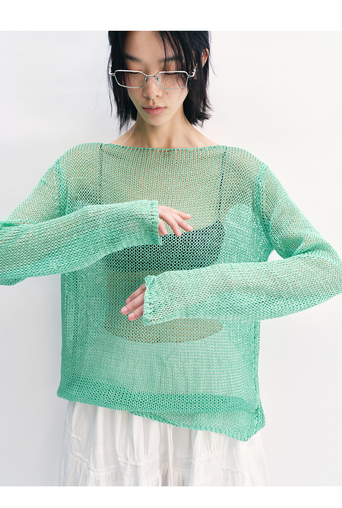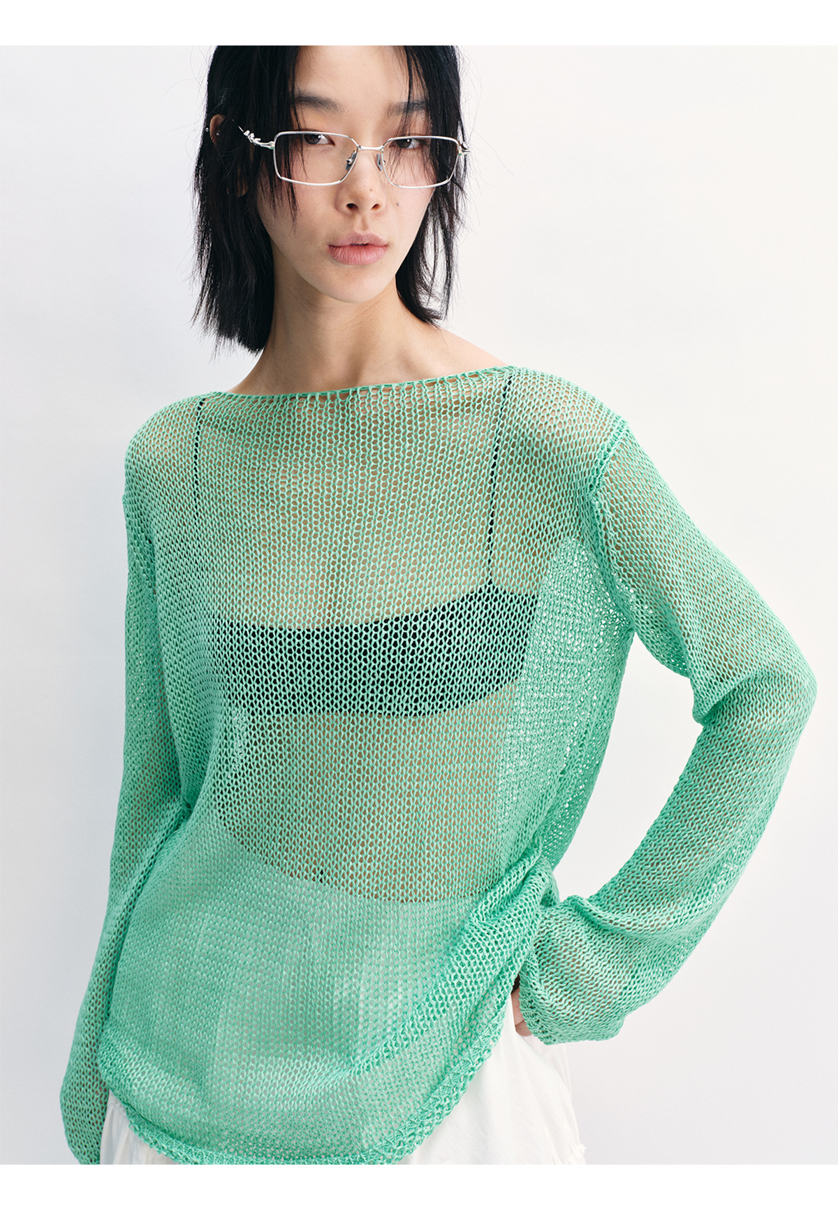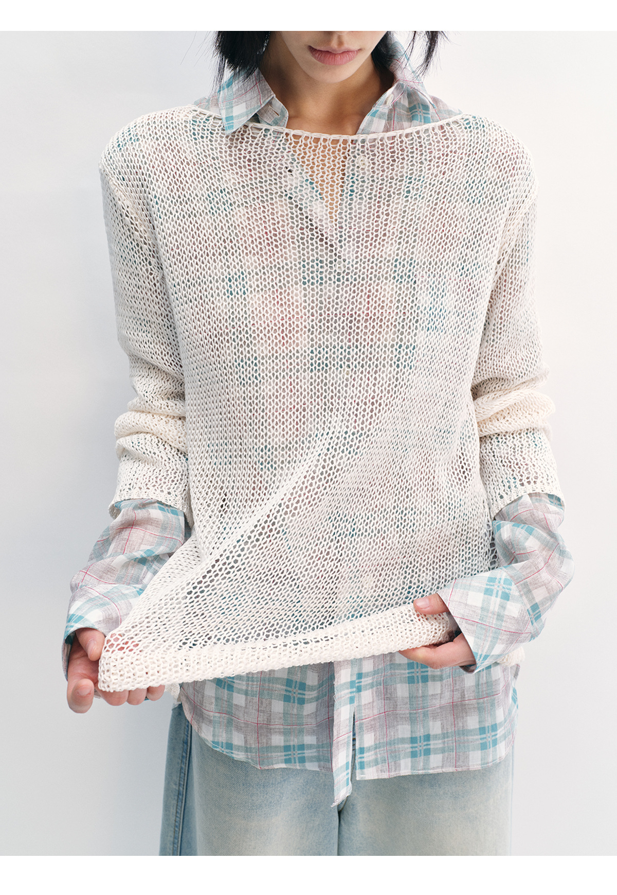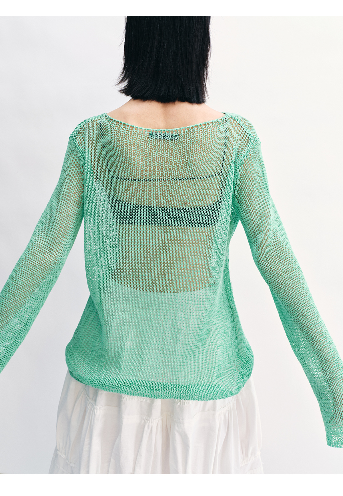 [Shushuang] 새로운 피부 친화적 인 밀짚 원사 니트 할로우 신선한 오버레이 블라우스 크루 넥 긴 소매 재킷 여성 V8704
