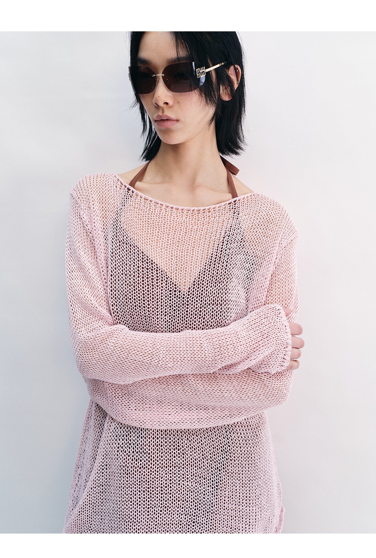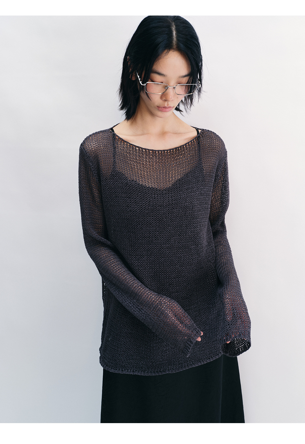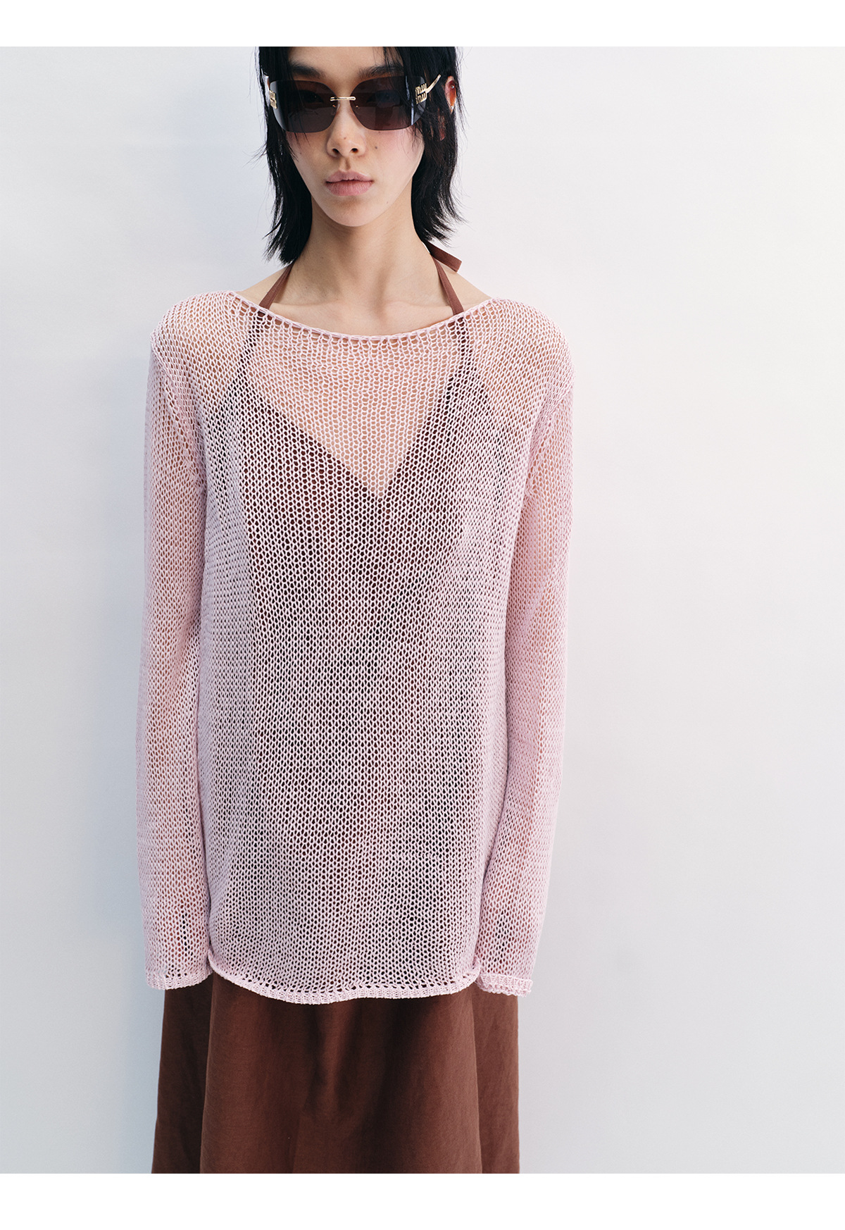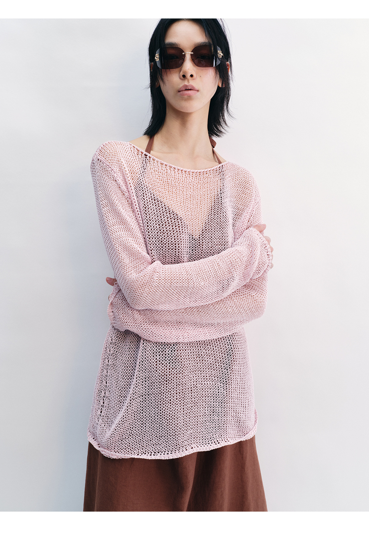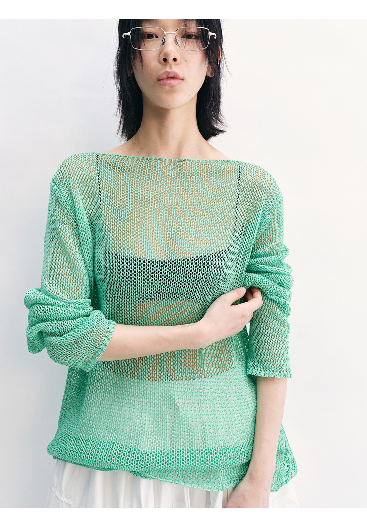 [Shushuang] 새로운 피부 친화적 인 밀짚 원사 니트 할로우 신선한 오버레이 블라우스 크루 넥 긴 소매 재킷 여성 V8704