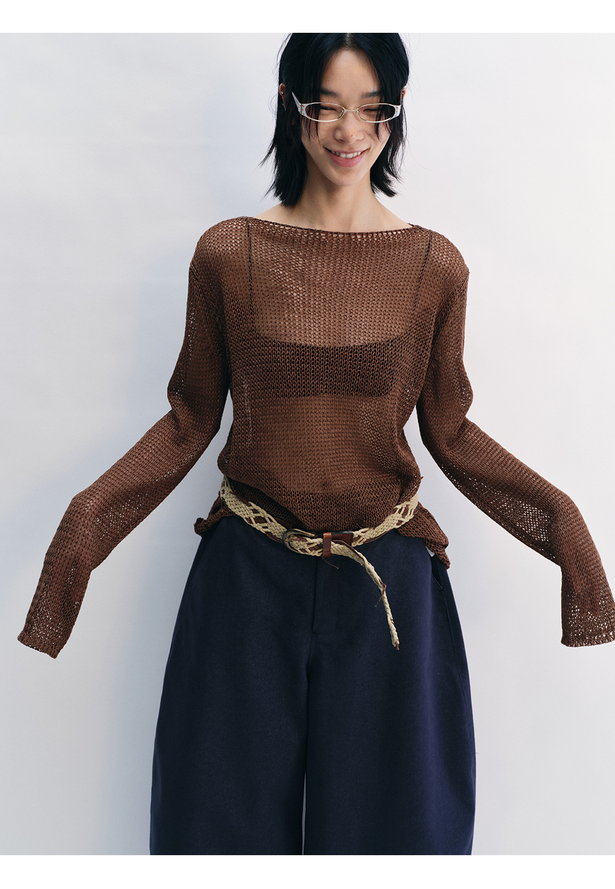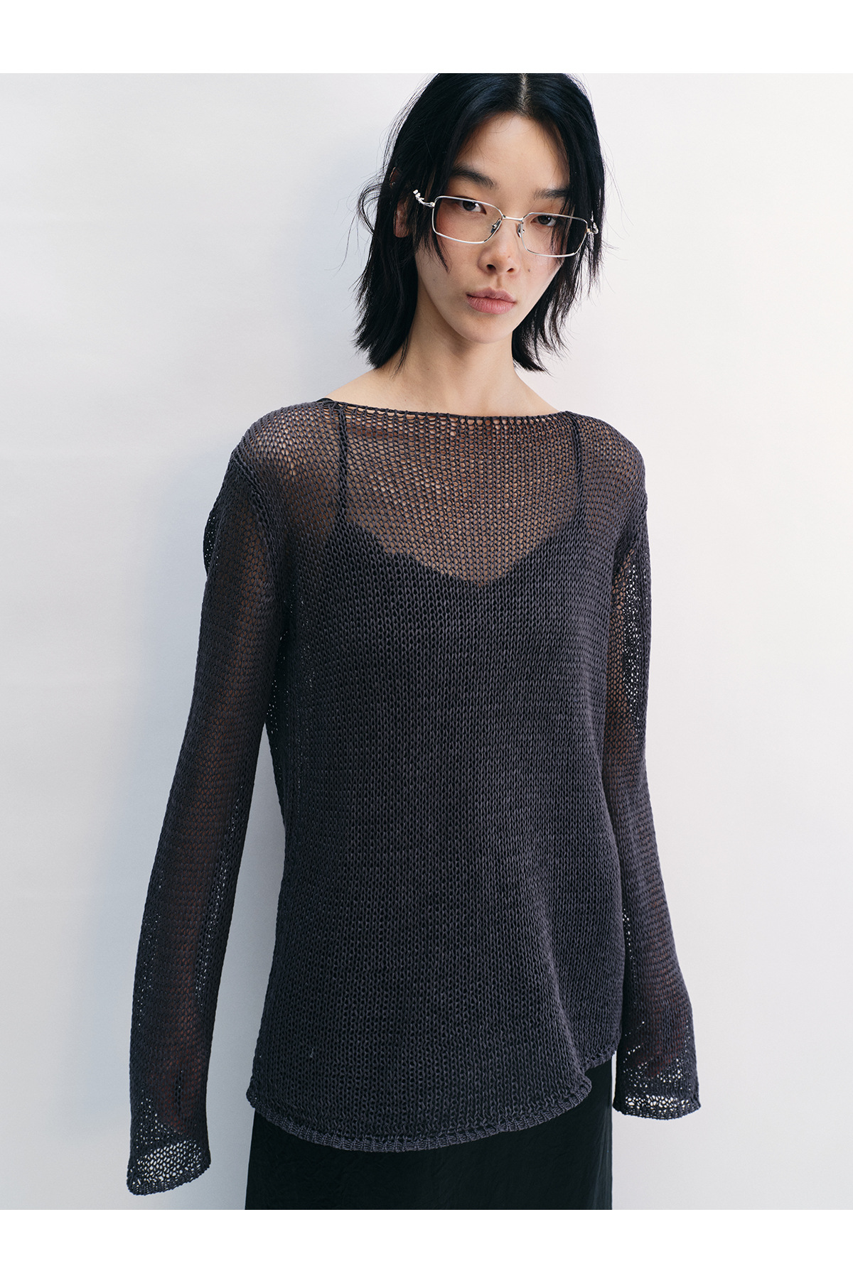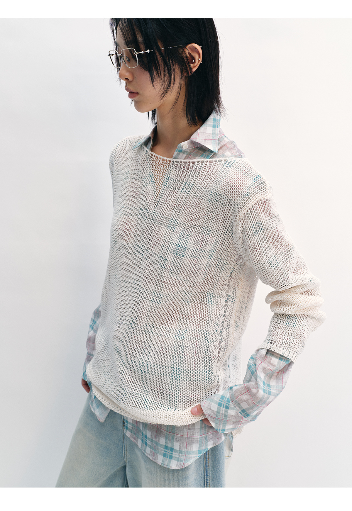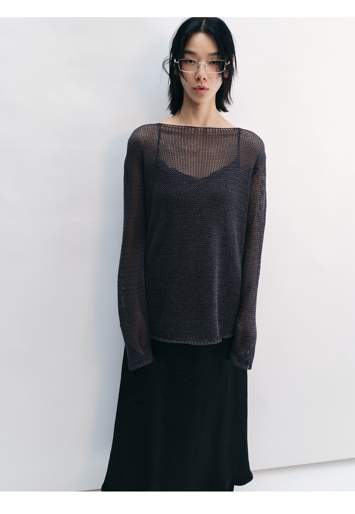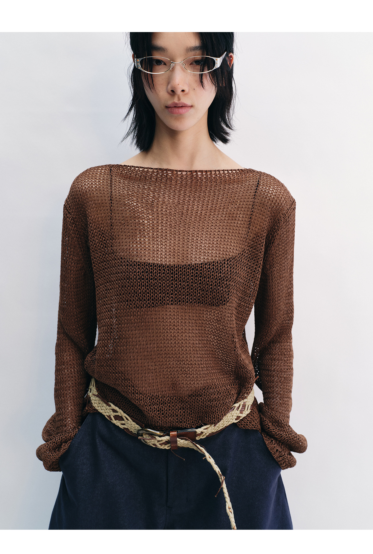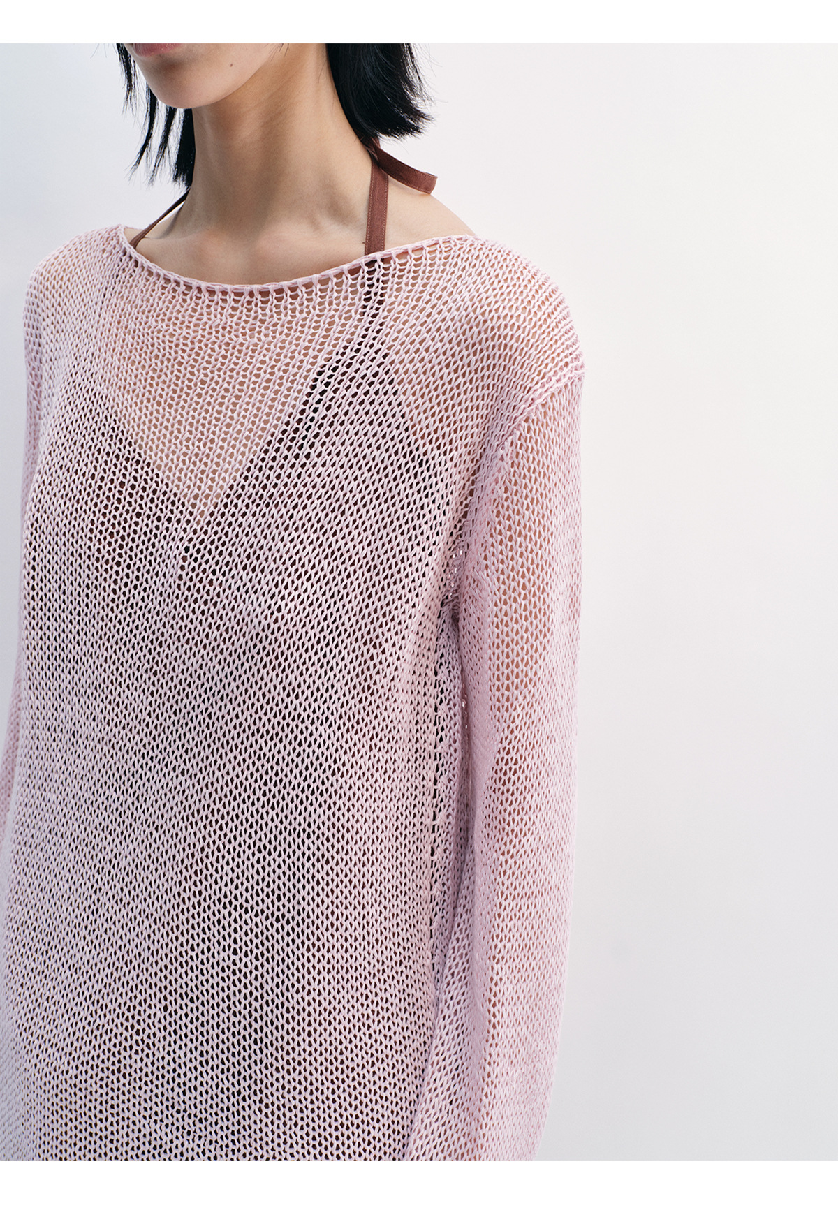[Shushuang] 새로운 피부 친화적 인 밀짚 원사 니트 할로우 신선한 오버레이 블라우스 크루 넥 긴 소매 재킷 여성 V8704