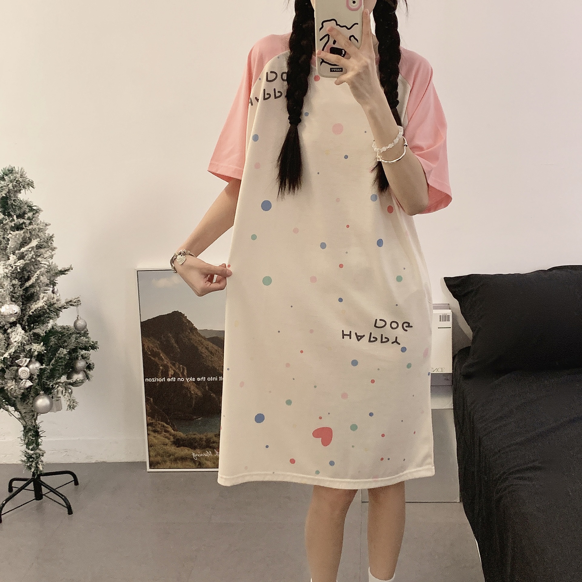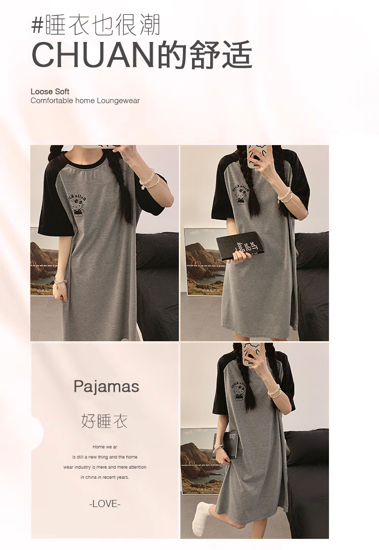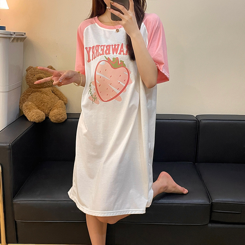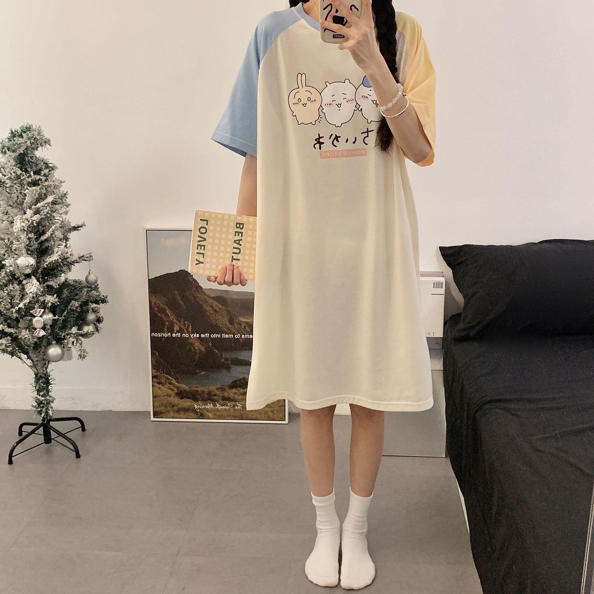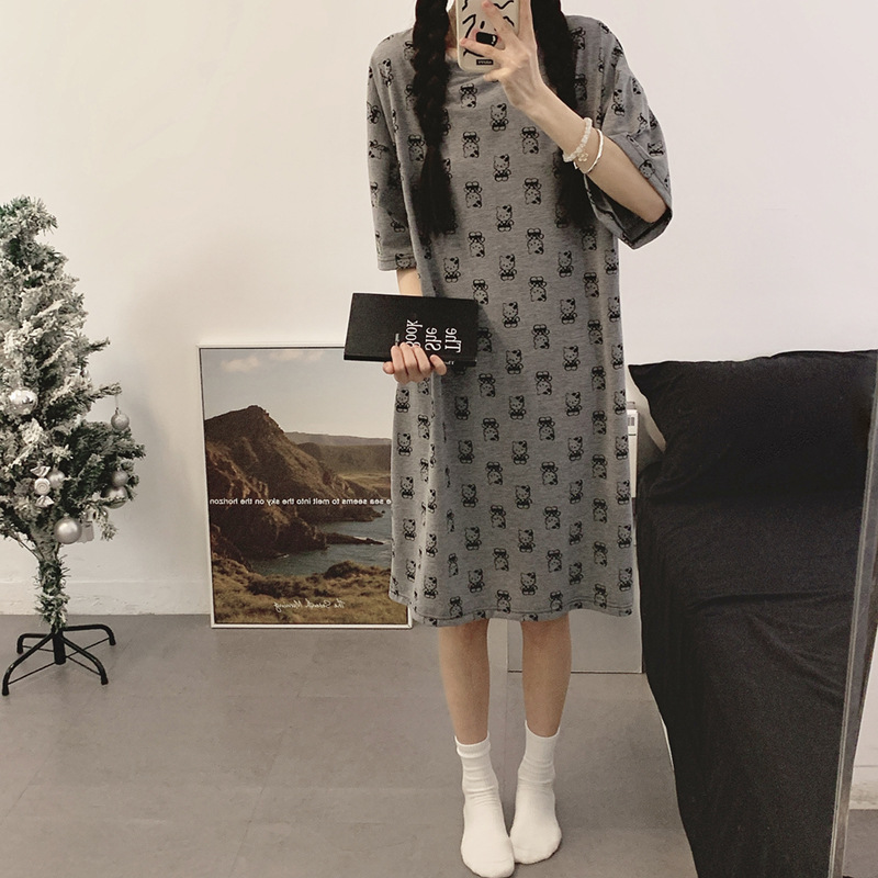 6535 면 잠옷 여성의 달콤한 귀여운 만화 짧은 소매 중간 길이 원피스 느슨한 소녀의 집 옷스토어 가기