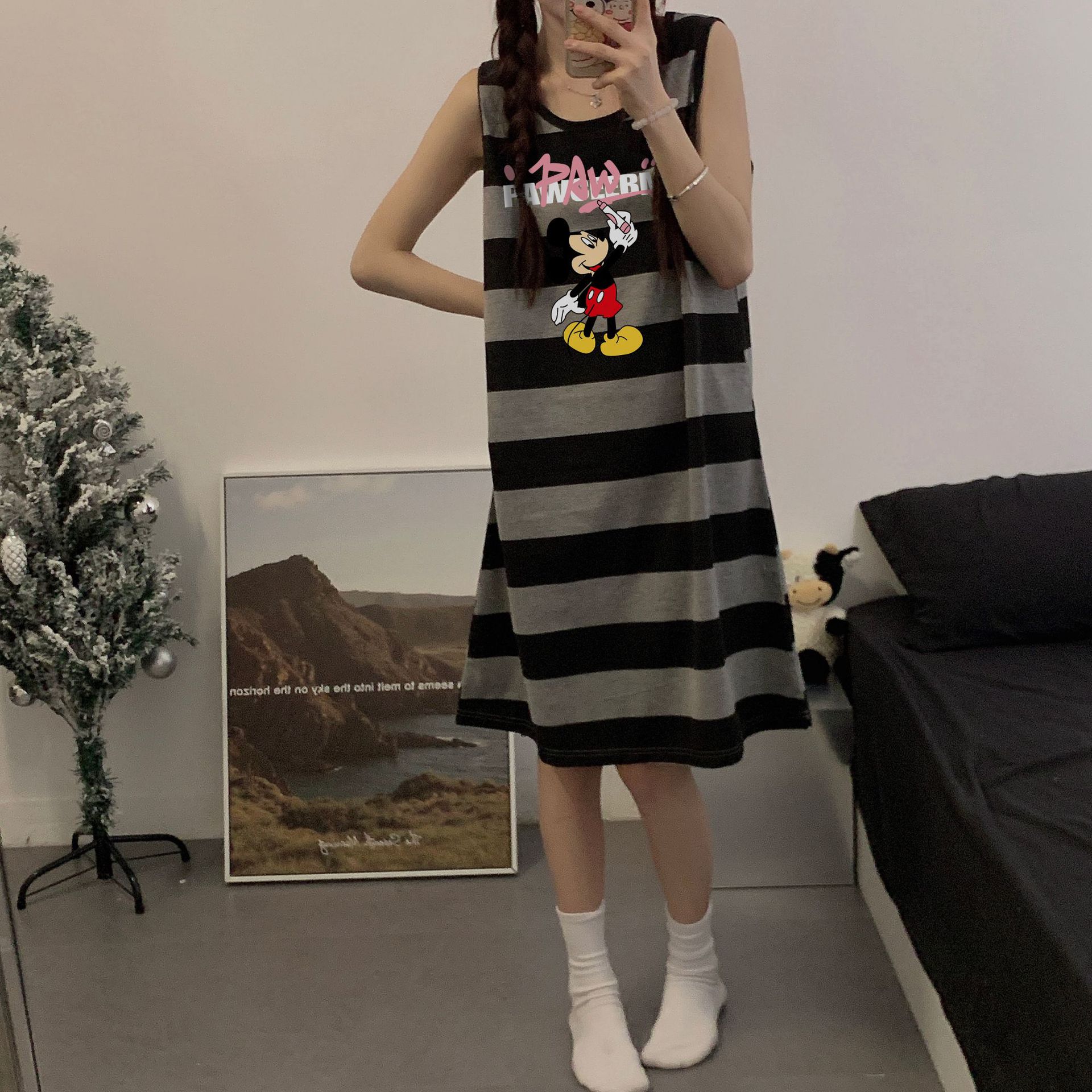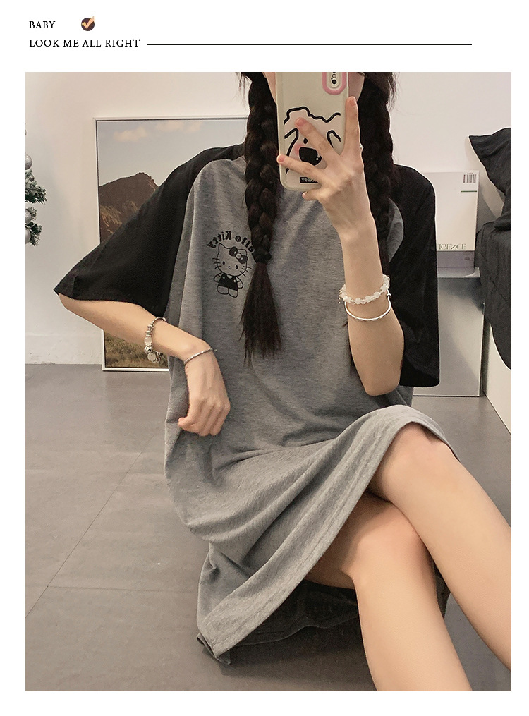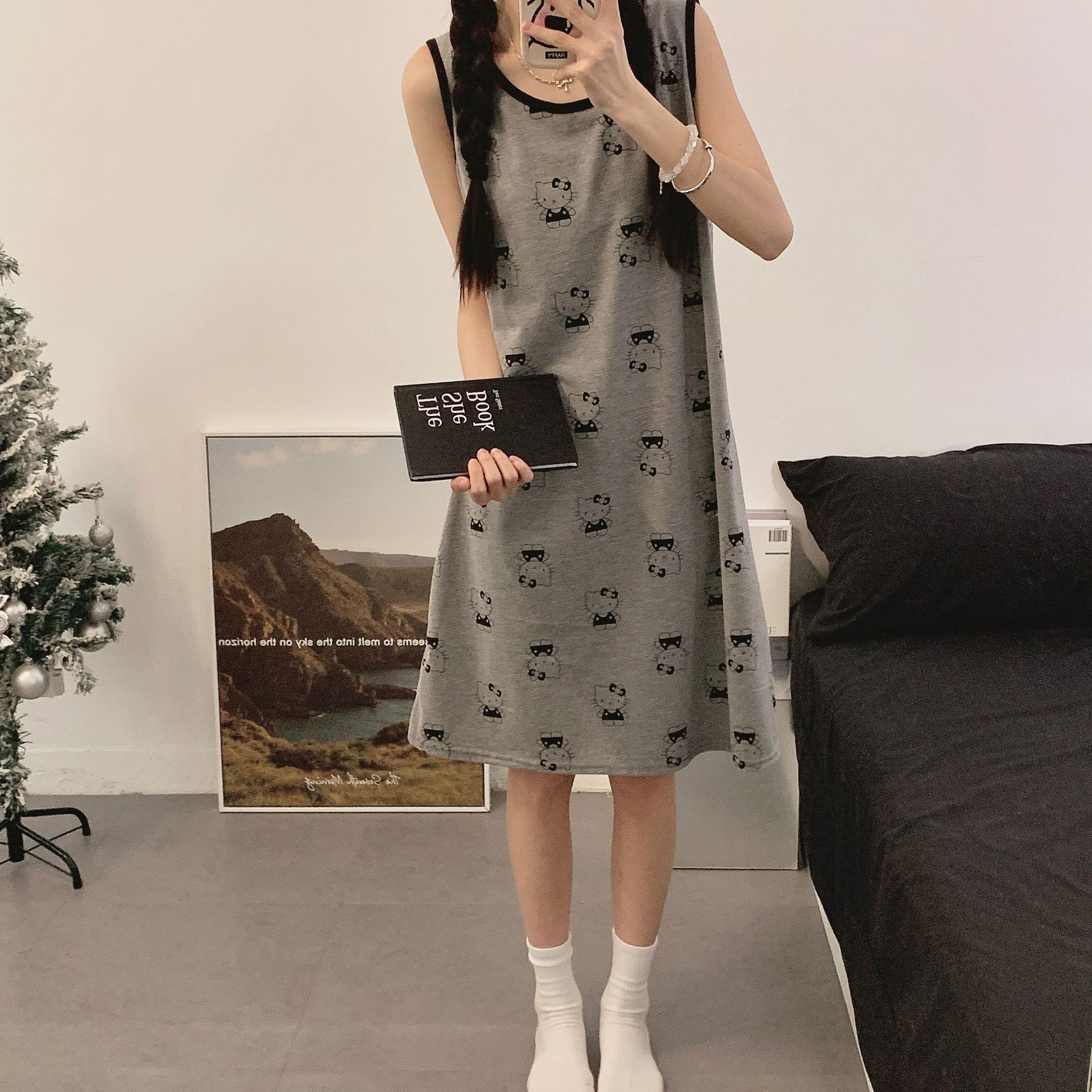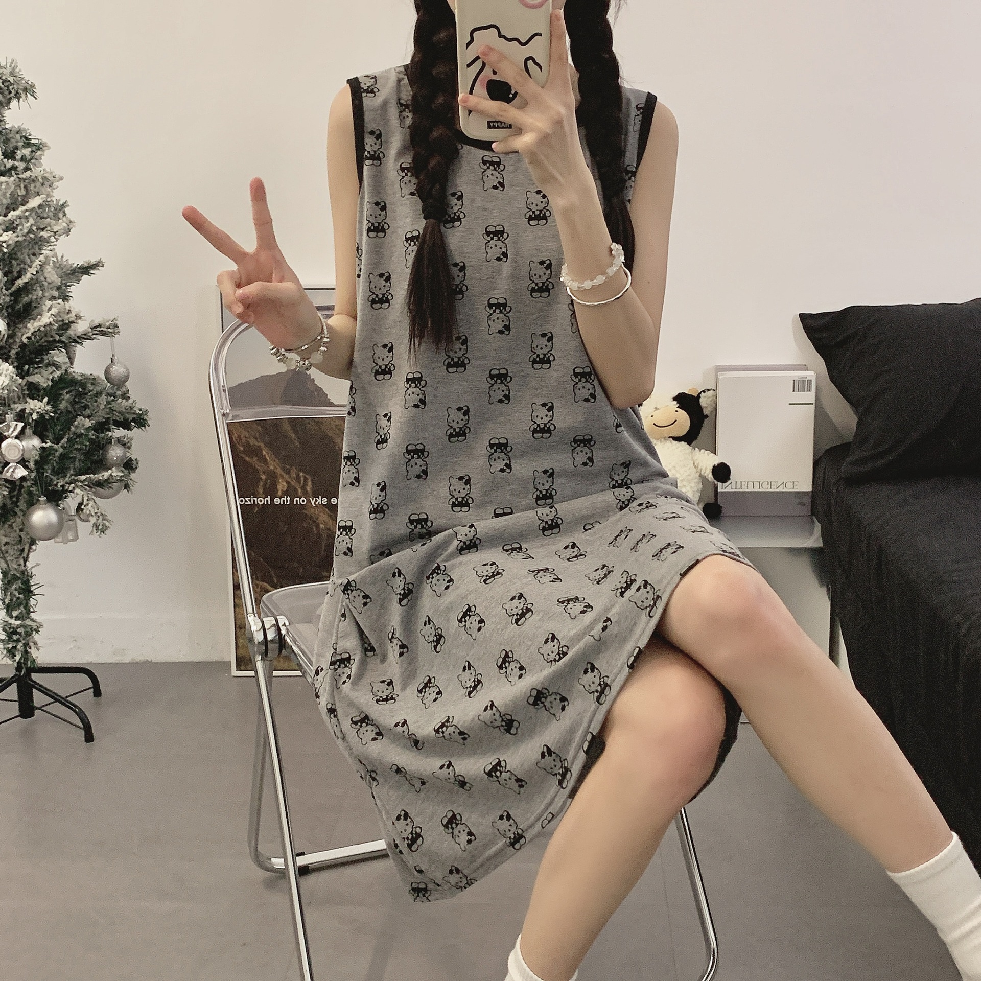 6535 면 잠옷 여성의 달콤한 귀여운 만화 짧은 소매 중간 길이 원피스 느슨한 소녀의 집 옷스토어 가기