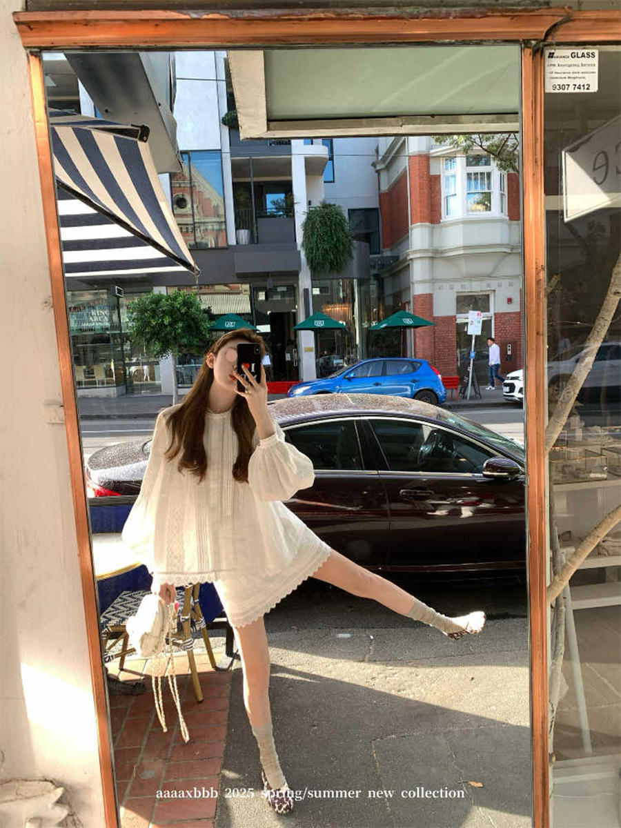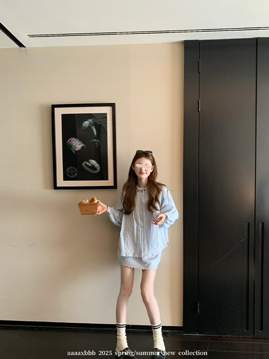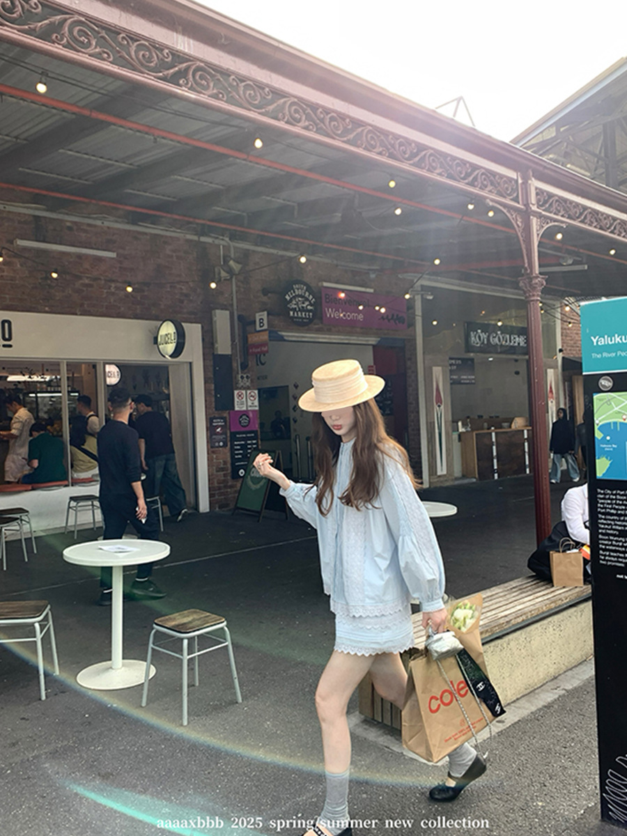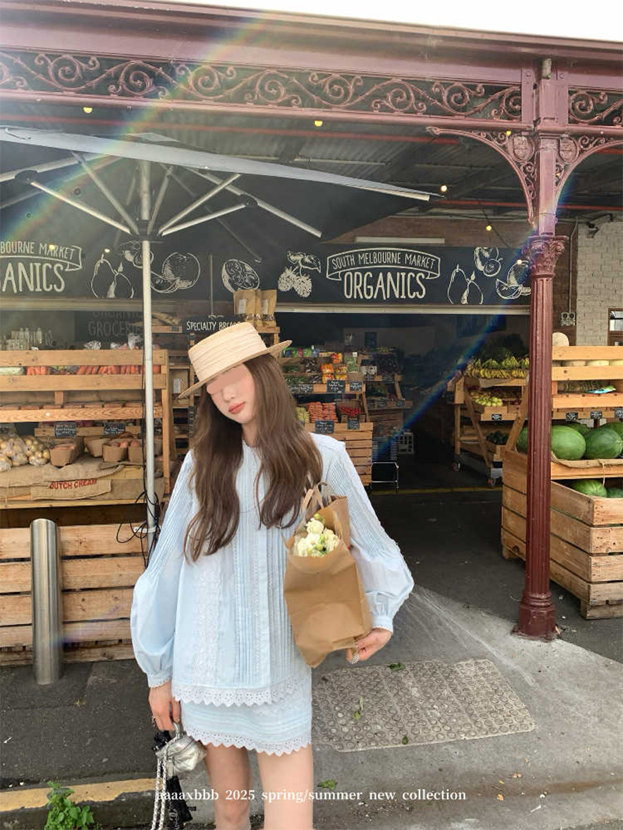 Aaaaxbbb 스노우 탑 실버 소금 잡아 레이스 세트 나이를 줄이는 셔츠 긴 소매 탑 라운드 넥 스커트 스커트스토어 가기