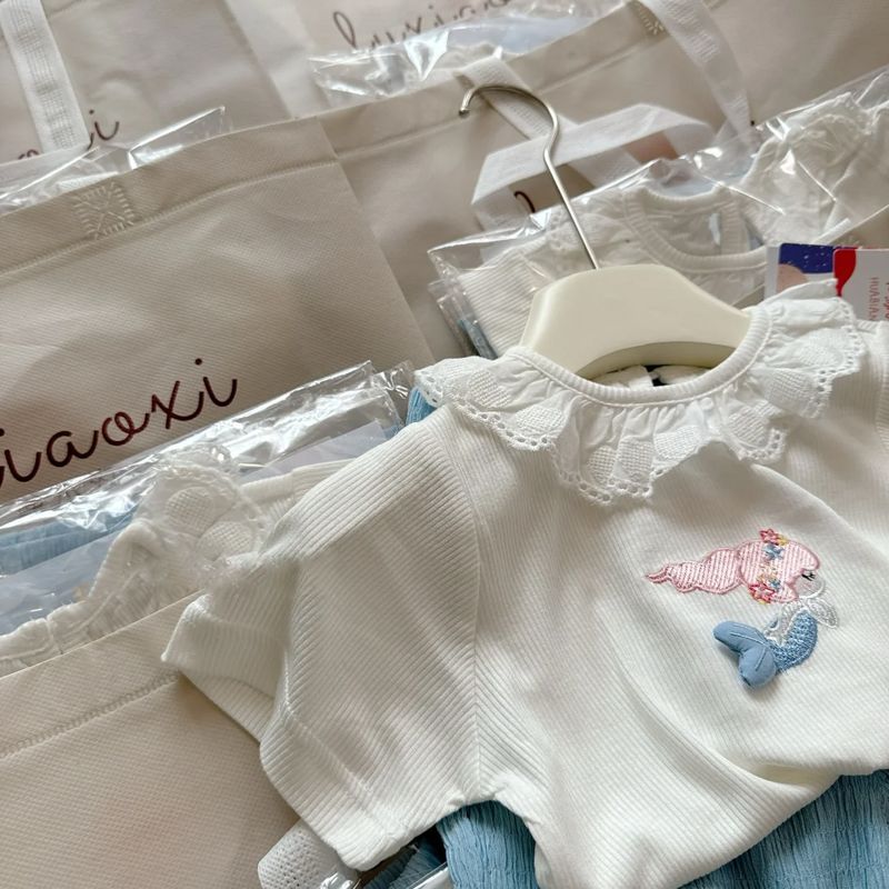여자 한국 스타일 여름 새로운 귀여운 인어 반팔 티셔츠 레이스 플레어 바지 캐주얼 유행 투피스 세트