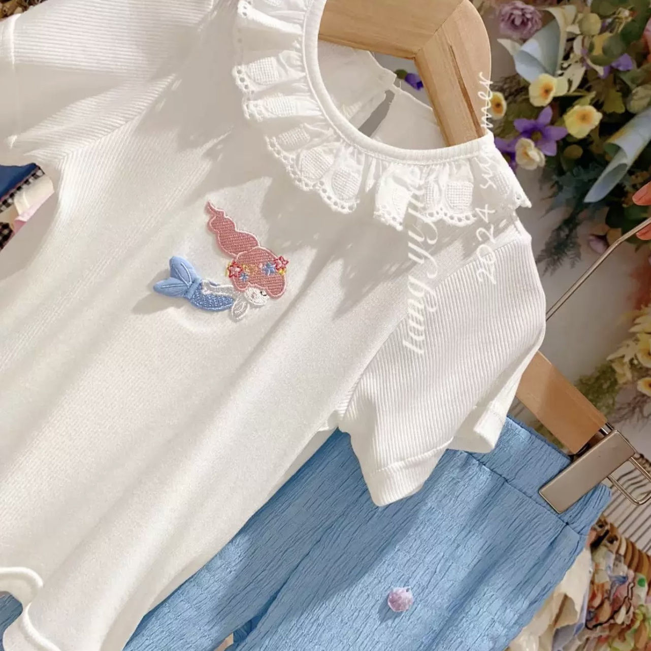 여자 한국 스타일 여름 새로운 귀여운 인어 반팔 티셔츠 레이스 플레어 바지 캐주얼 유행 투피스 세트스토어 가기