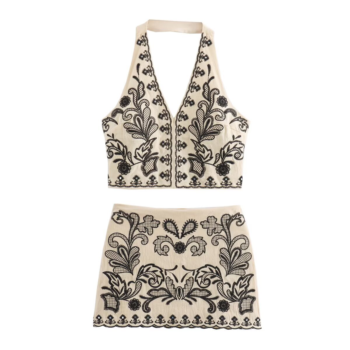 유럽과 미국을위한 국경 간 여성 AliExpress INS 폭발 자수 매달려 넥 칼라 재킷 미니 스커트 세트