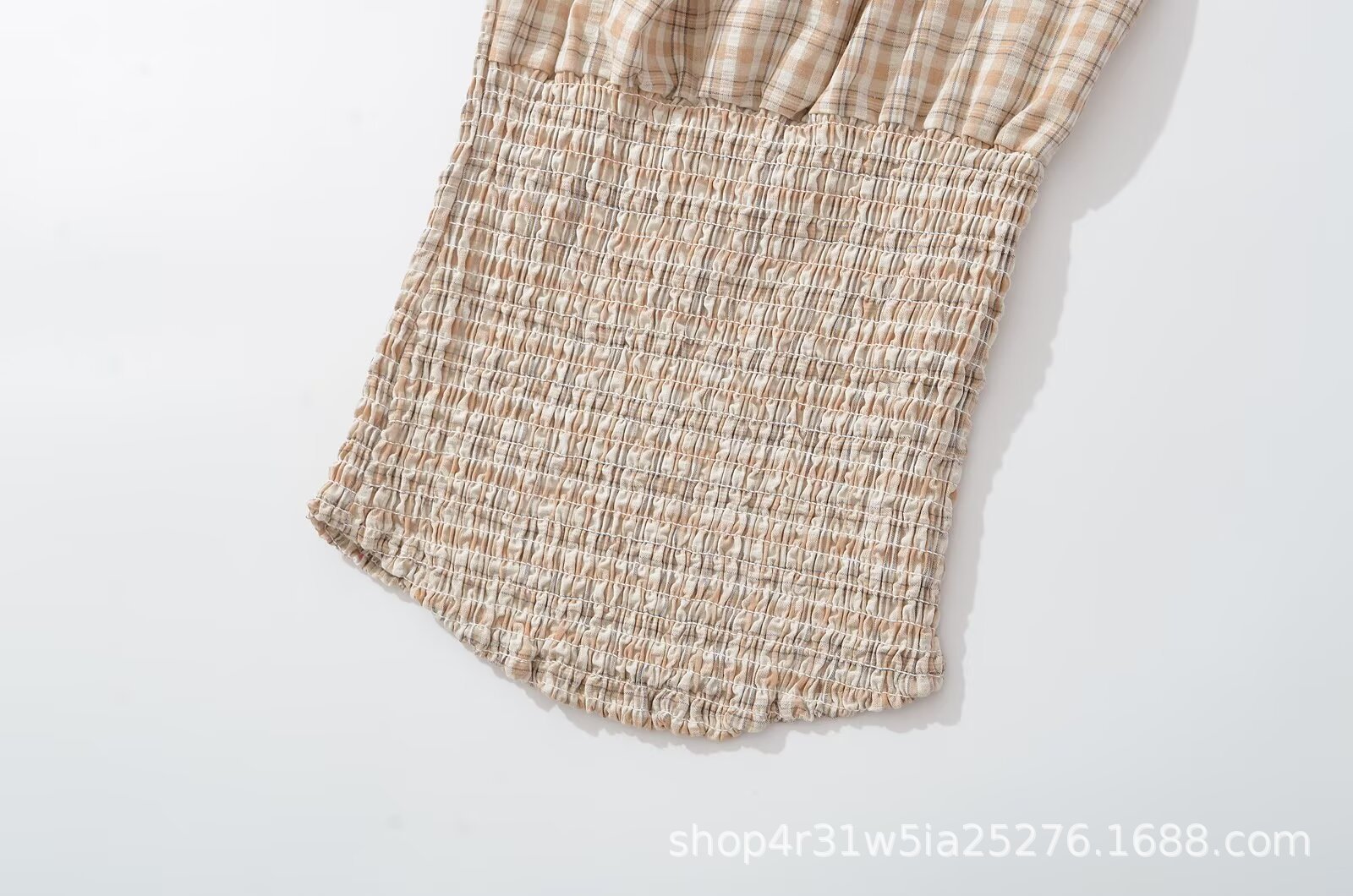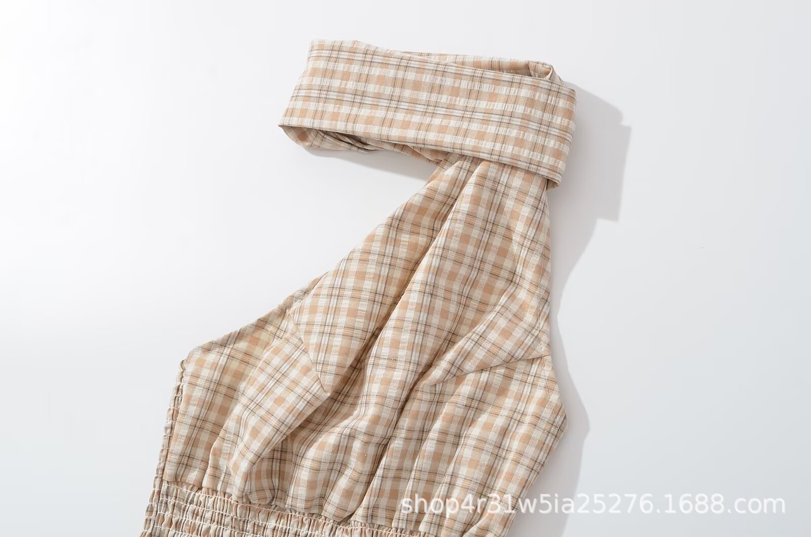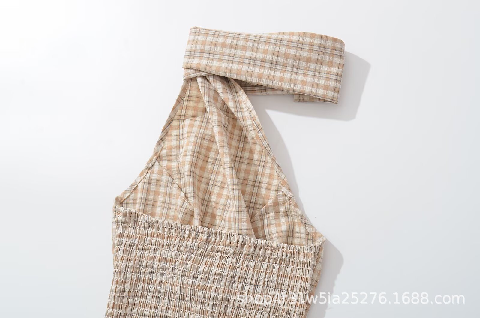 2025 새로운 빈티지 격자 무늬 목 주름 꽉 허리 탑 스트랩 하이 허리 격자 무늬 스커트 투피스 세트스토어 가기