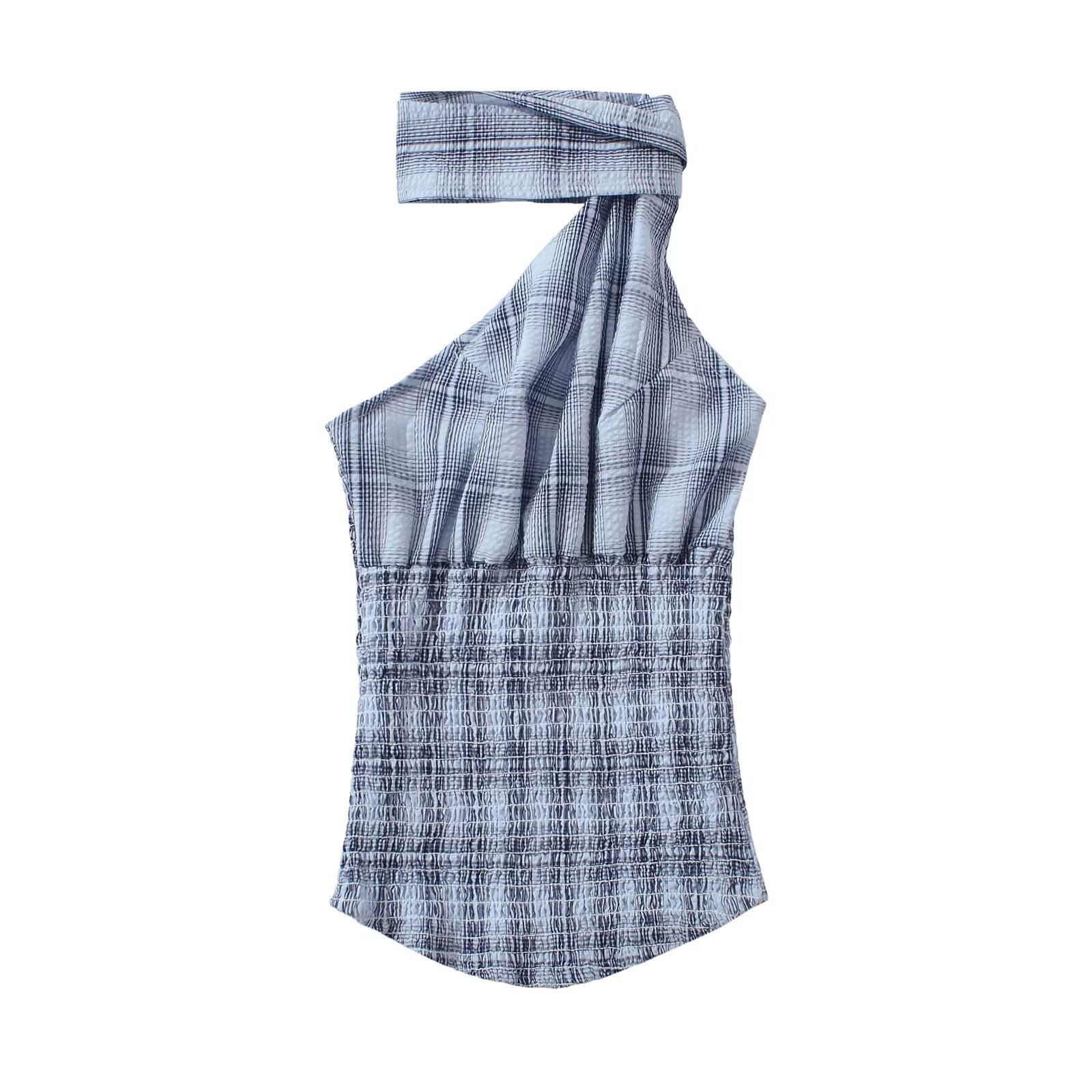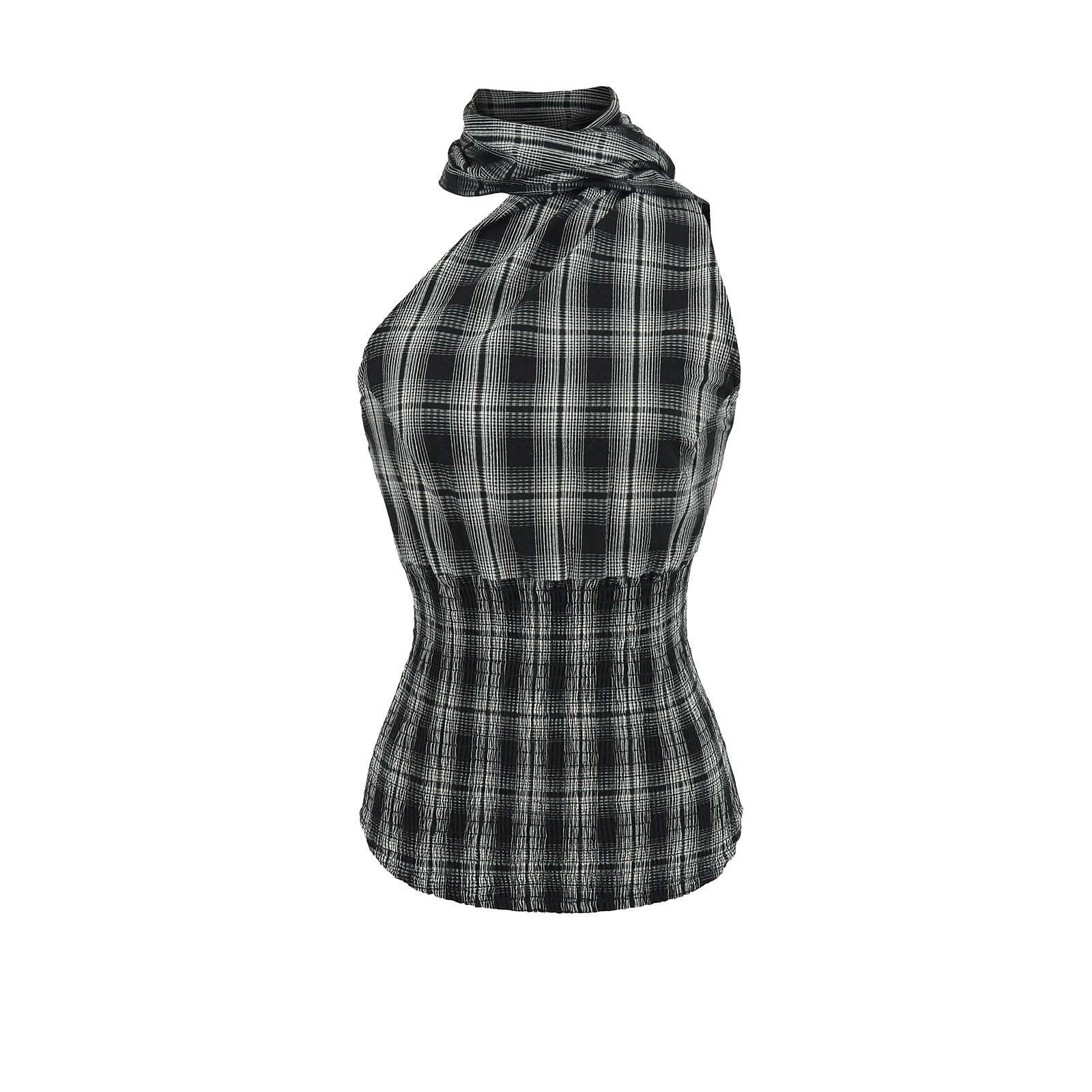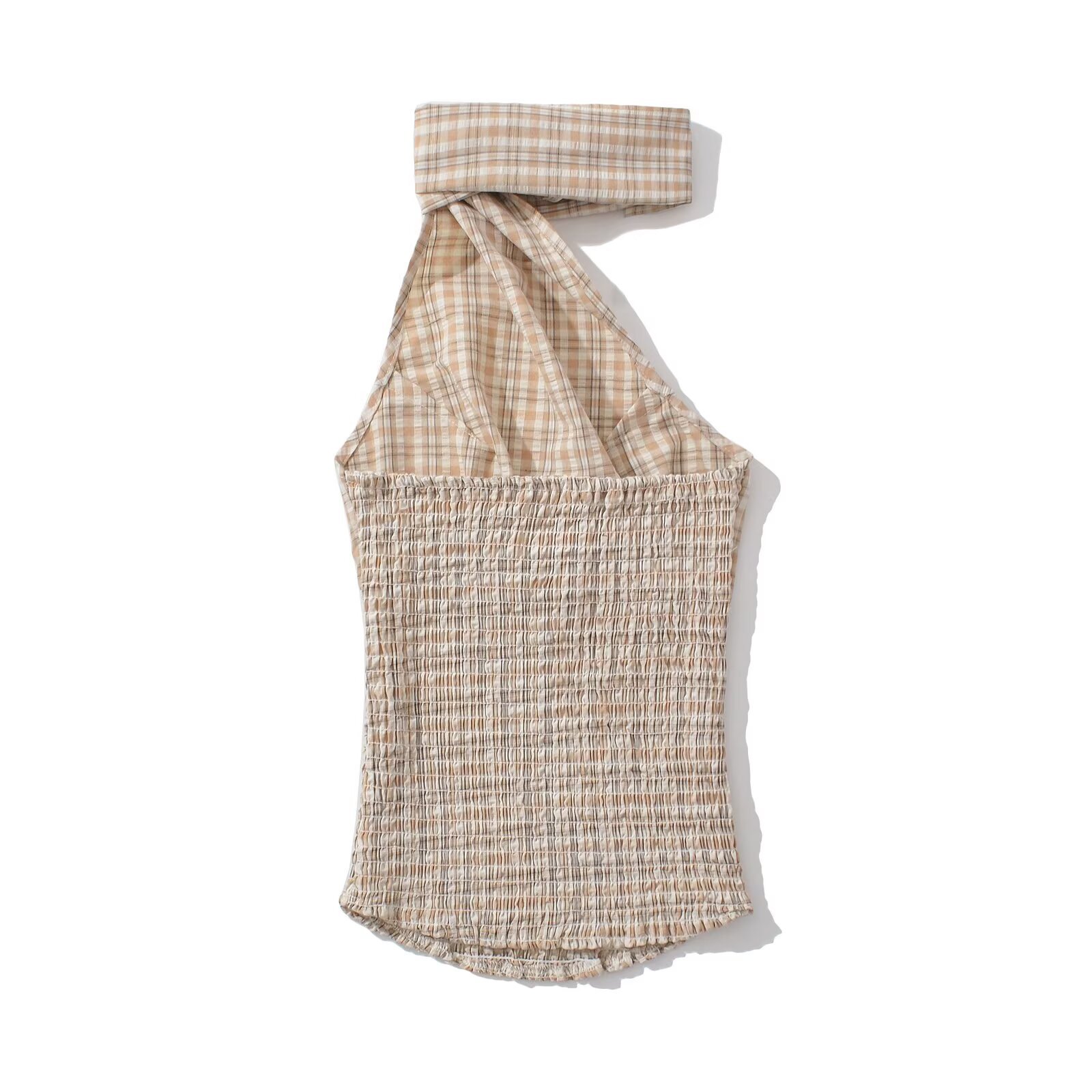 2025 새로운 빈티지 격자 무늬 목 주름 꽉 허리 탑 스트랩 하이 허리 격자 무늬 스커트 투피스 세트스토어 가기