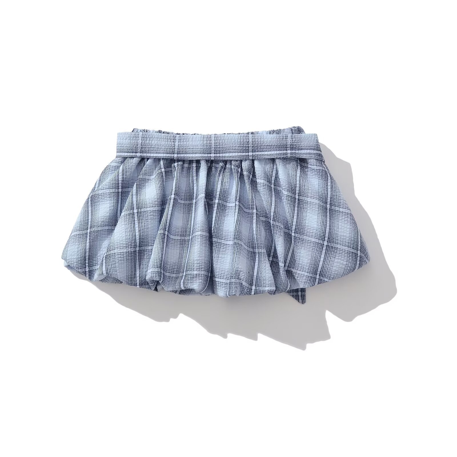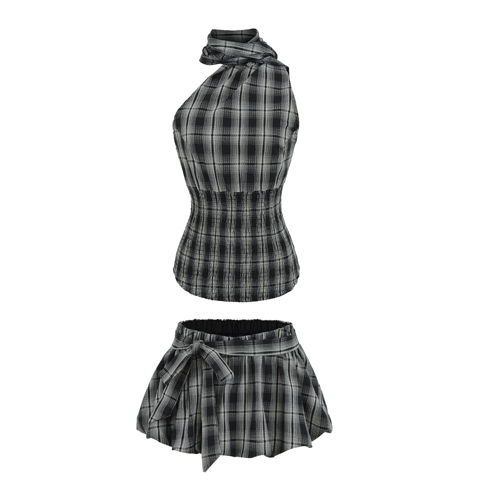 2025 새로운 빈티지 격자 무늬 목 주름 꽉 허리 탑 스트랩 하이 허리 격자 무늬 스커트 투피스 세트