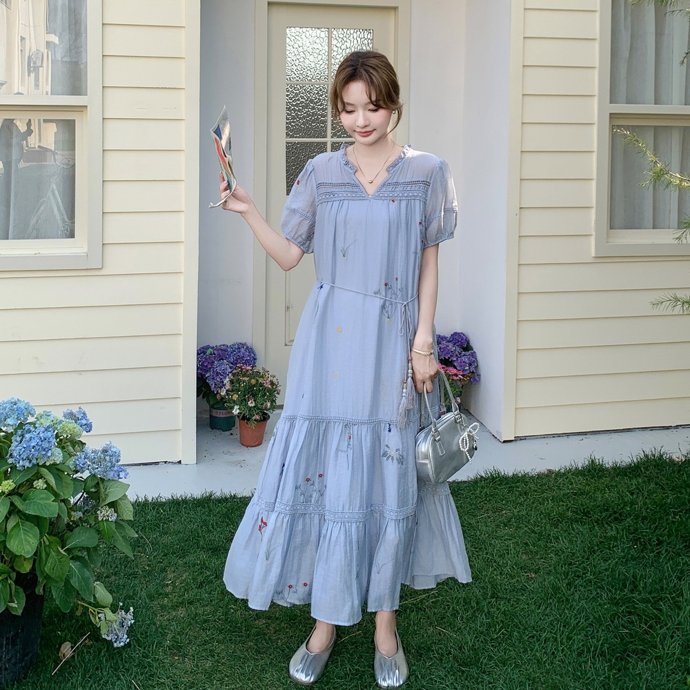 리얼 샷 복고풍 V 넥 헤비 자수 프랑스 원피스 2025 새로운 유행 쾌활한 나무 귀 스티칭 스커트스토어 가기