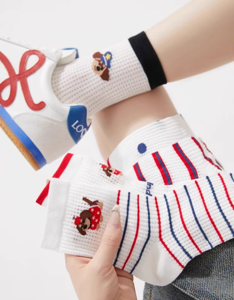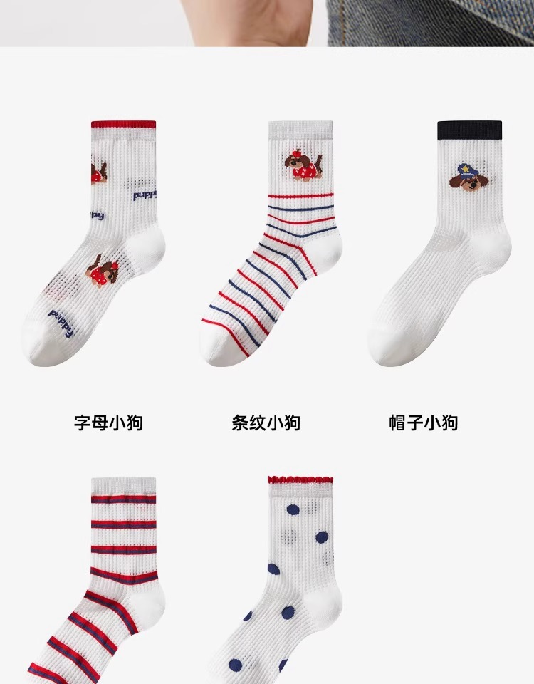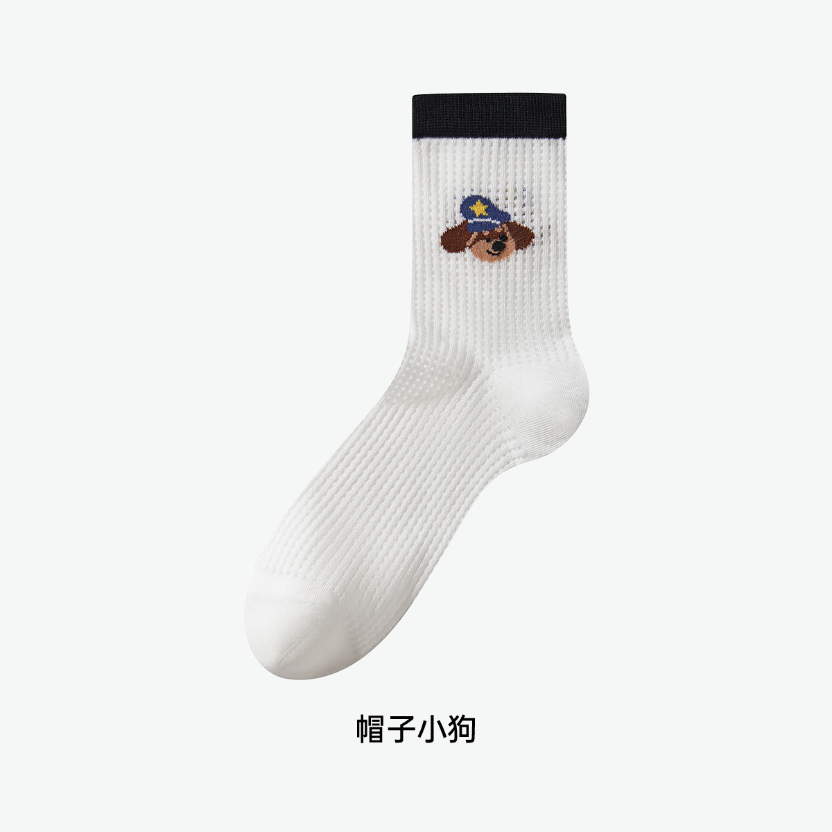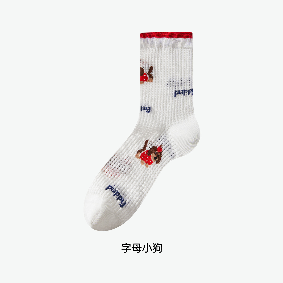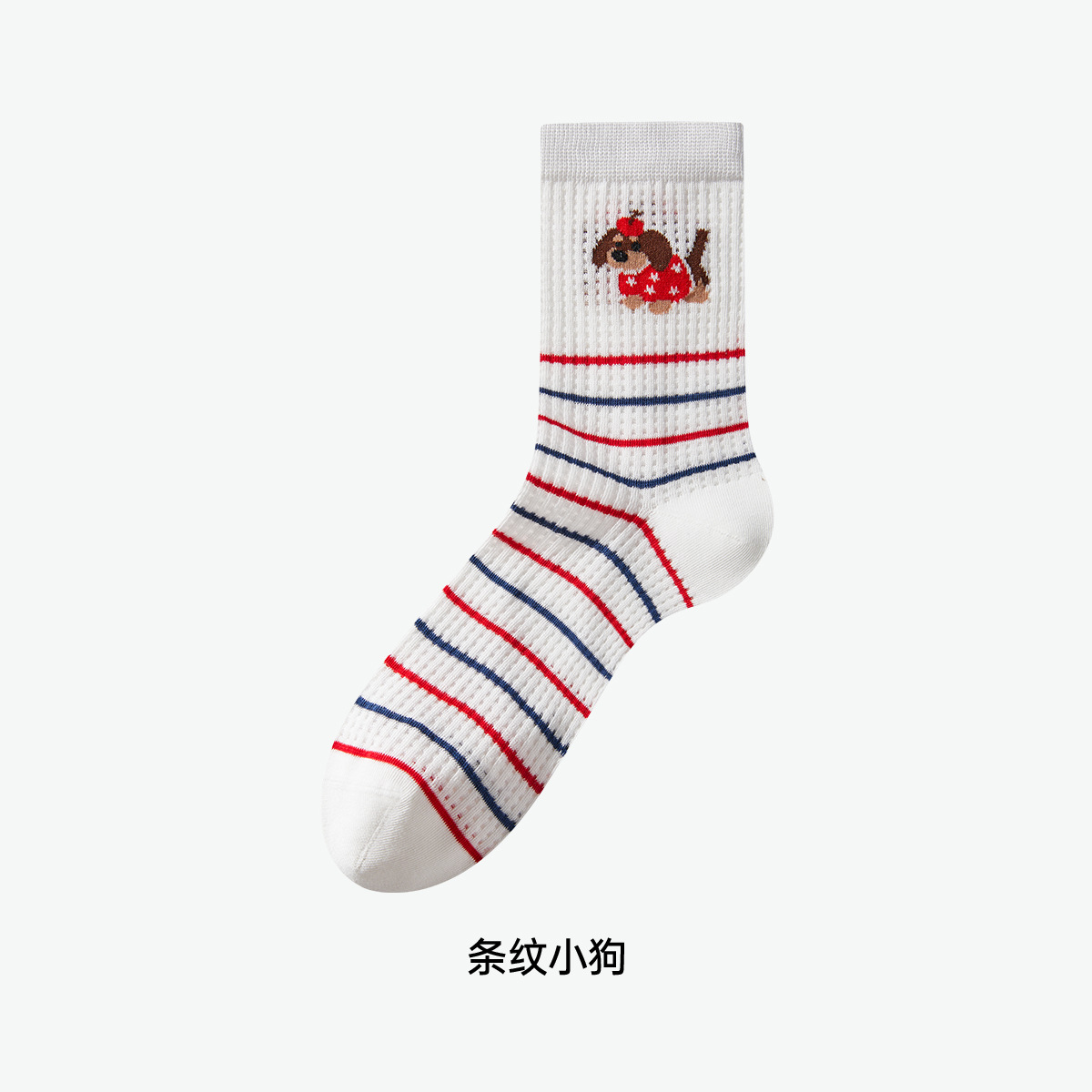 양말 여성의 봄과 여름 얇은 순면 메쉬 줄무늬 만화 강아지 중간 길이 양말 귀여운 긴 긴 여자의 양말