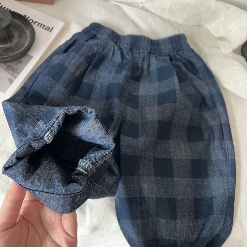 데님 블루 ~ 코튼 앤 리넨 ~ 남학생과 여학생을위한 한국 어린이 격자 무늬 바지 일본 캐주얼 느슨한 할란 바지 서양식스토어 가기