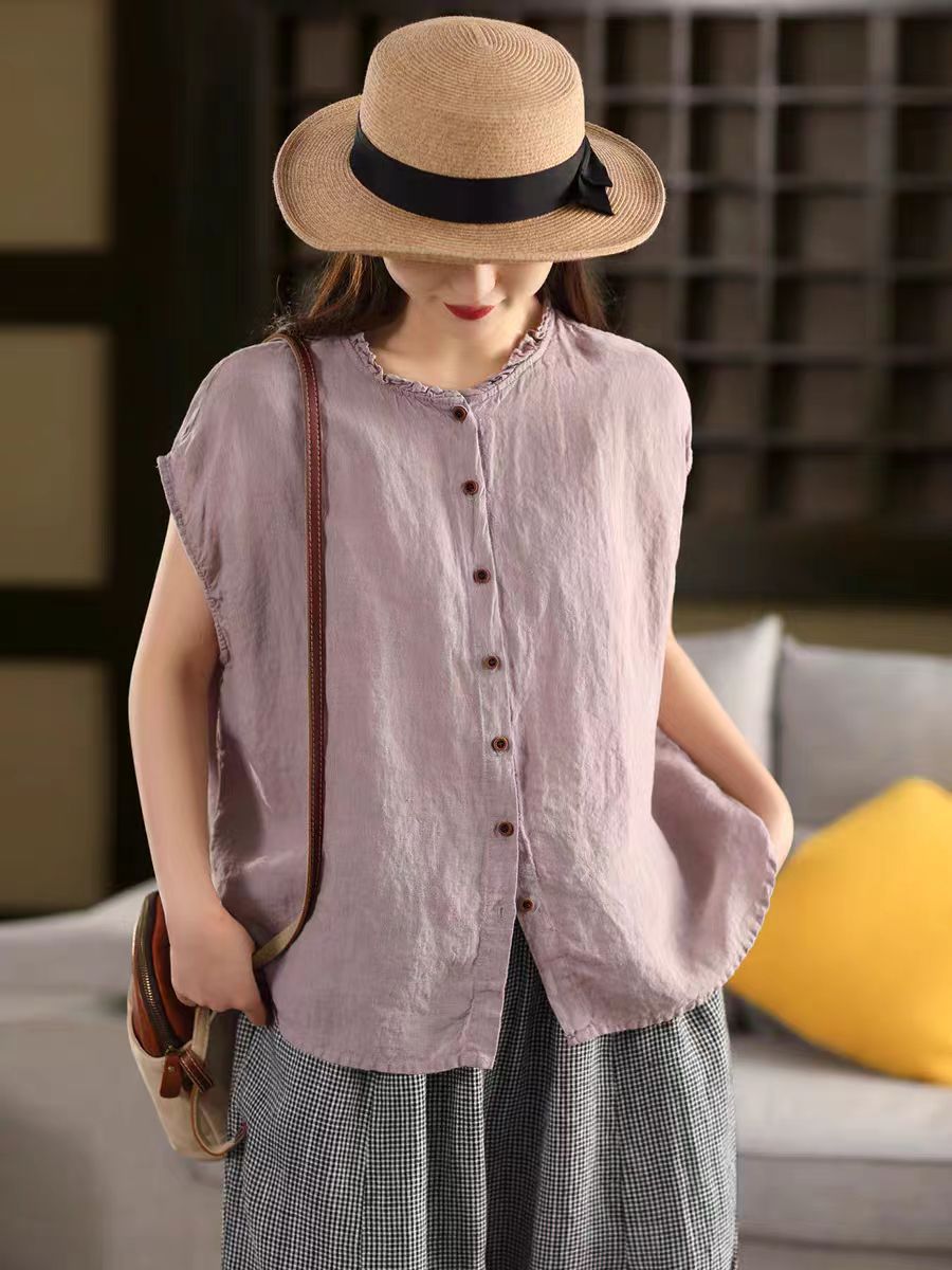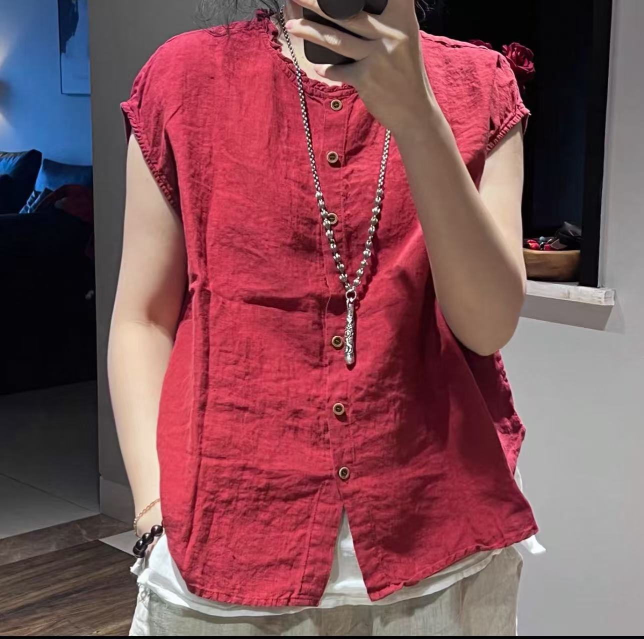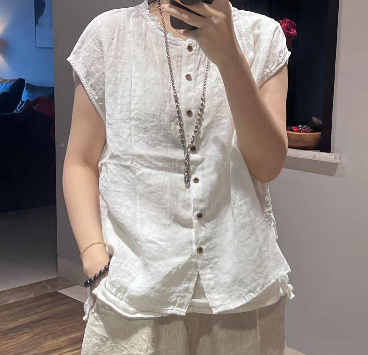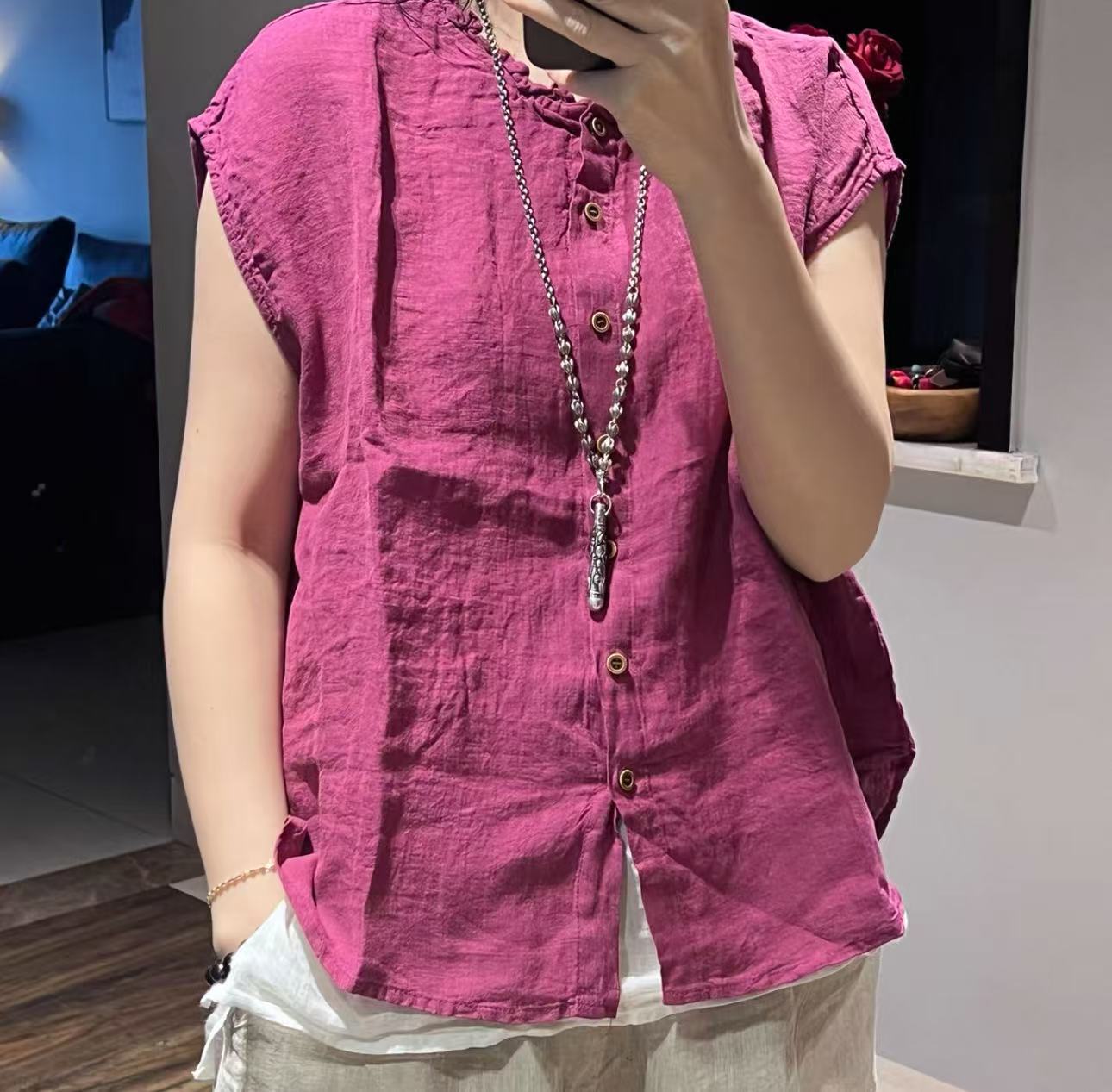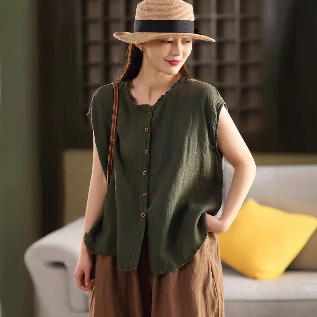 2025 봄 새로운 중공업 프라이드 컬러 리넨 귀 칼라 셔츠 여성용 레트로 민소매 셔츠 싱글 브레스트 카디건 탑