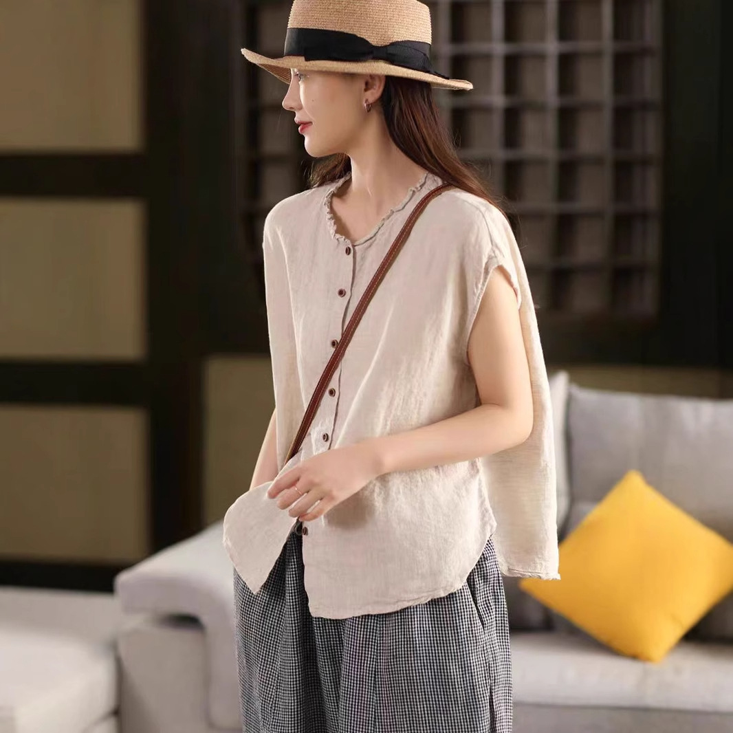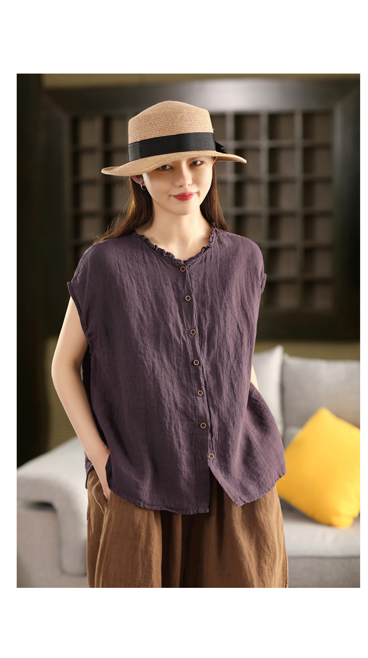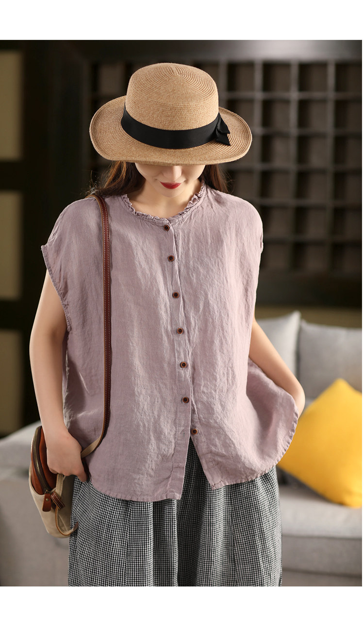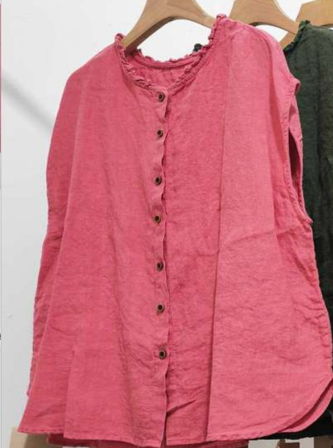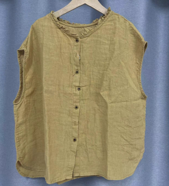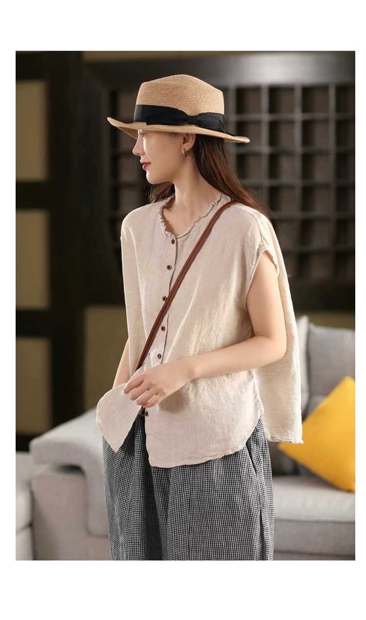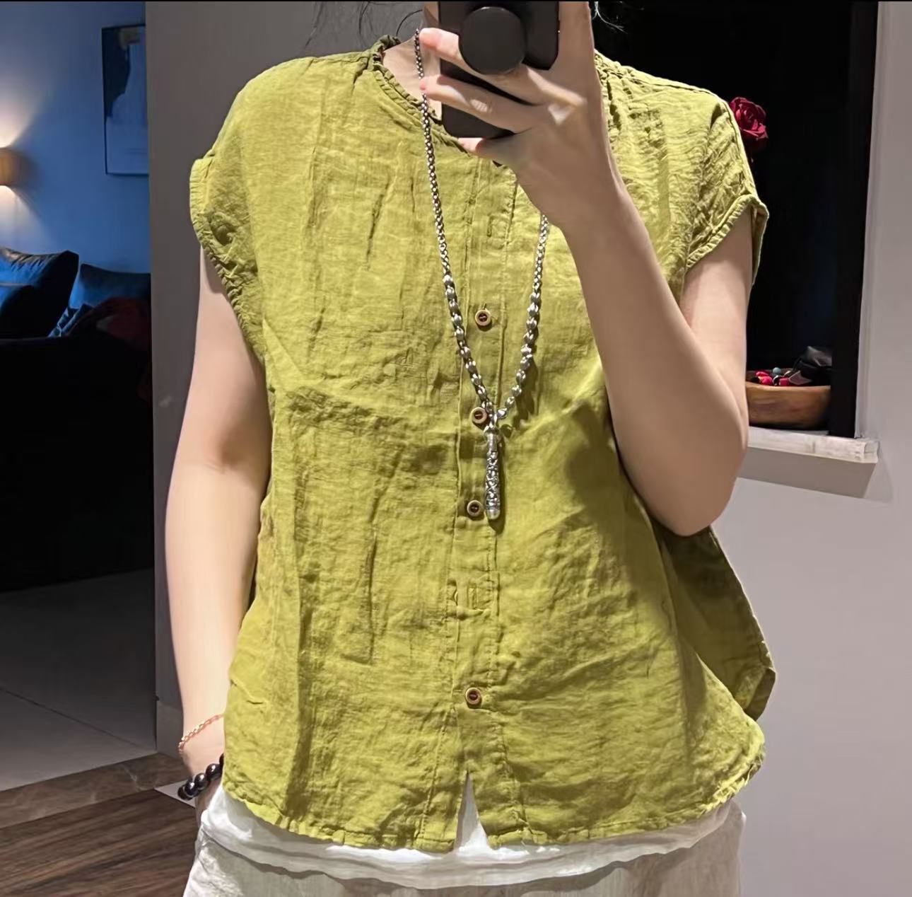 2025 봄 새로운 중공업 프라이드 컬러 리넨 귀 칼라 셔츠 여성용 레트로 민소매 셔츠 싱글 브레스트 카디건 탑