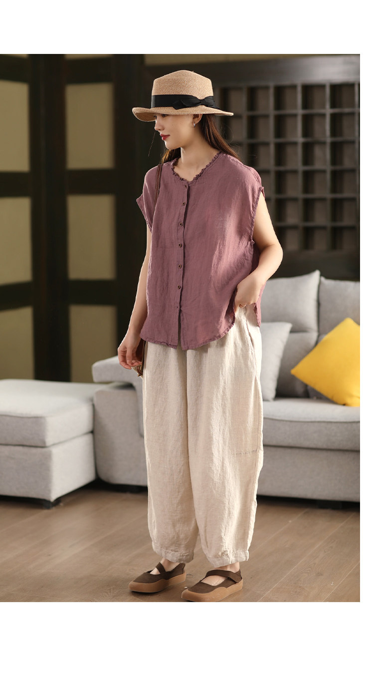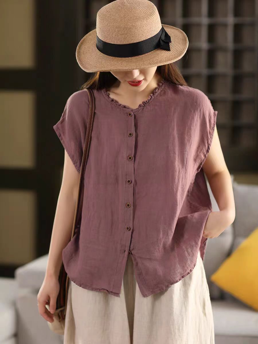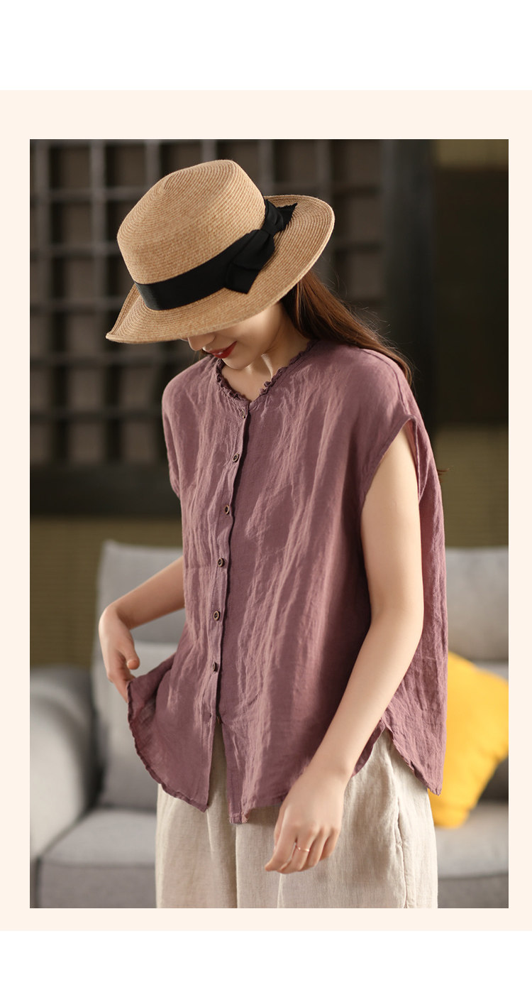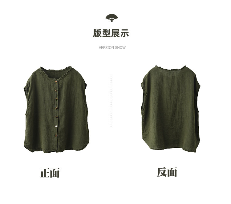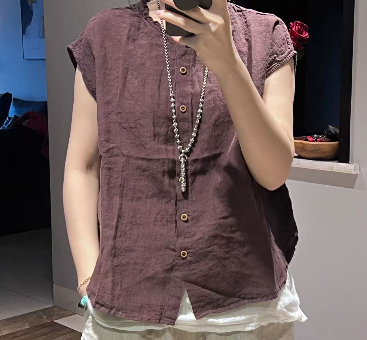 2025 봄 새로운 중공업 프라이드 컬러 리넨 귀 칼라 셔츠 여성용 레트로 민소매 셔츠 싱글 브레스트 카디건 탑