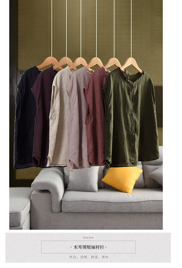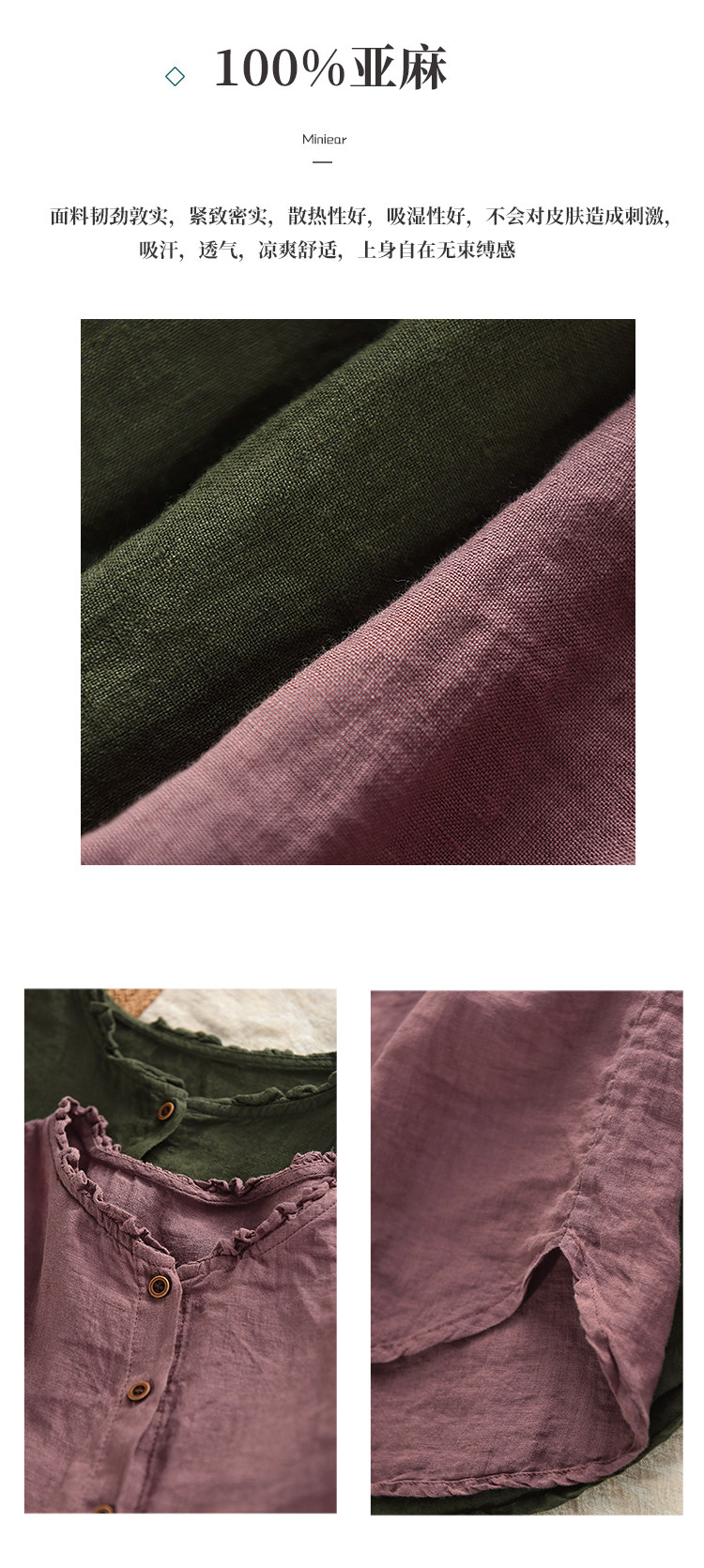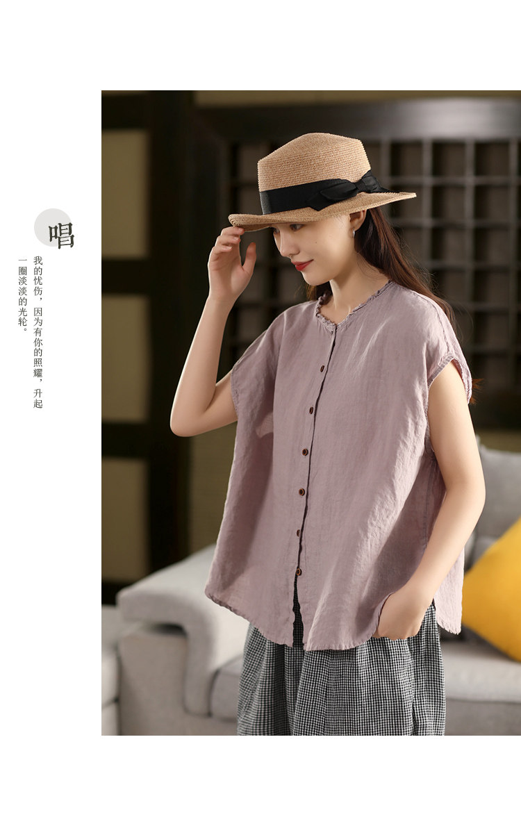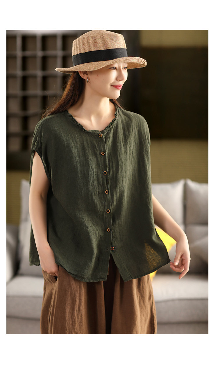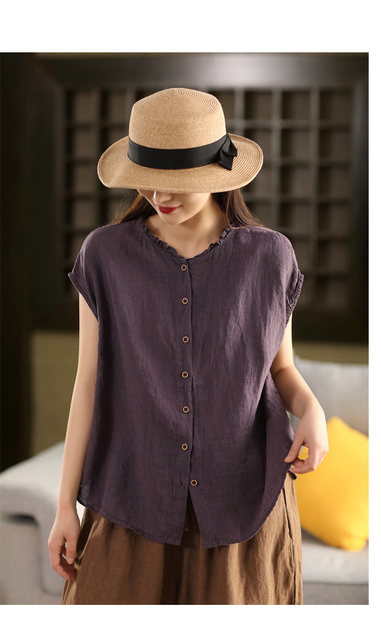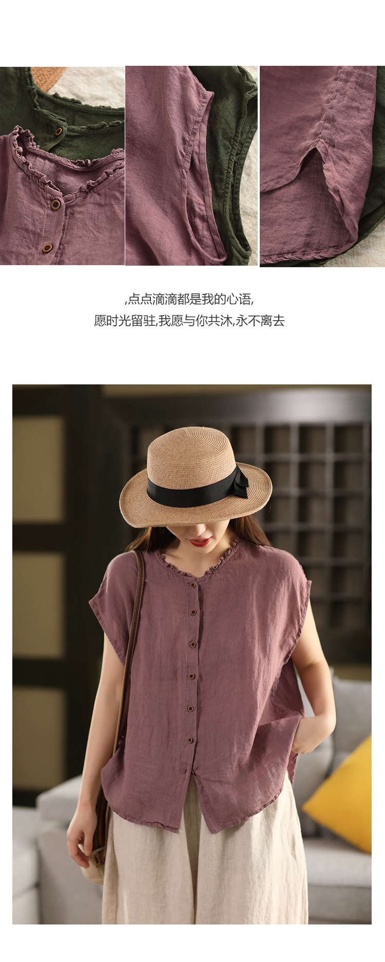 2025 봄 새로운 중공업 프라이드 컬러 리넨 귀 칼라 셔츠 여성용 레트로 민소매 셔츠 싱글 브레스트 카디건 탑