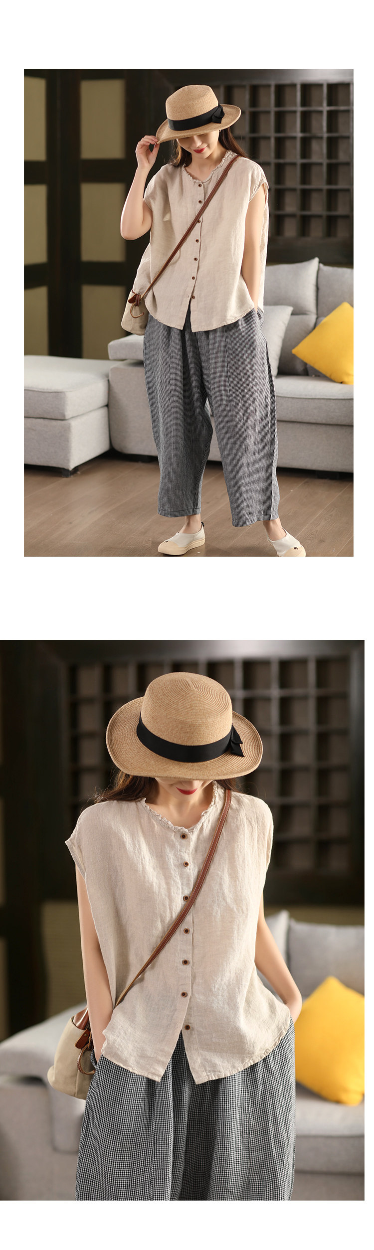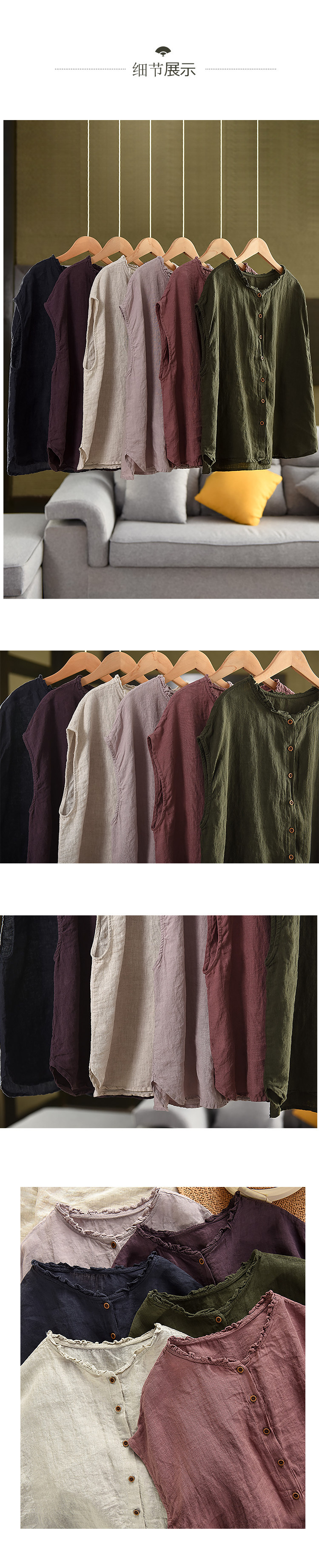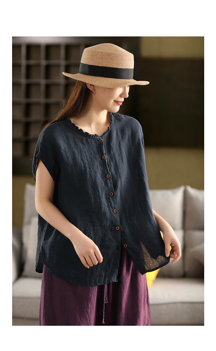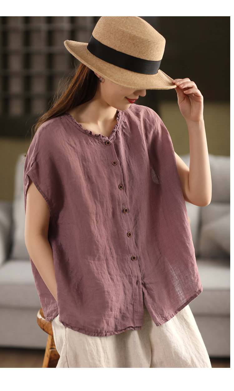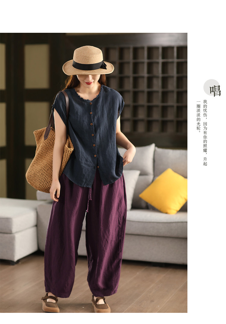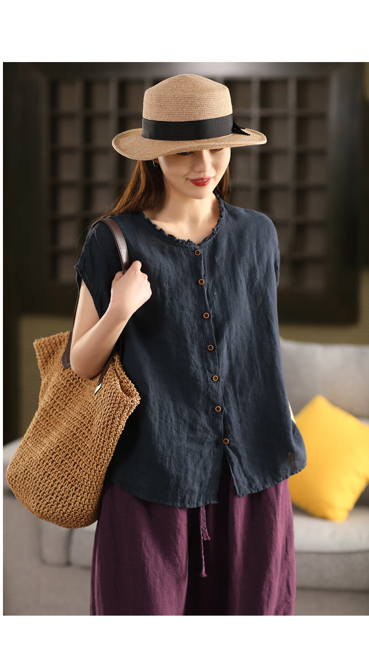 2025 봄 새로운 중공업 프라이드 컬러 리넨 귀 칼라 셔츠 여성용 레트로 민소매 셔츠 싱글 브레스트 카디건 탑