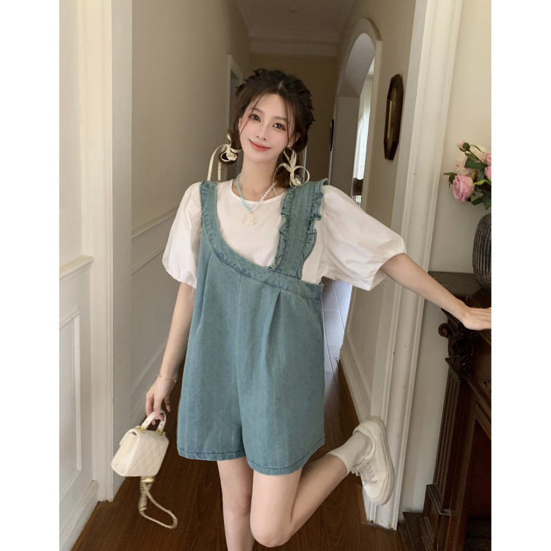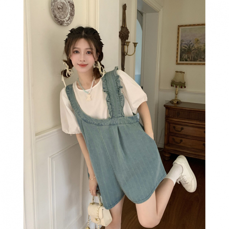 • 데님 멜빵 + 화이트 탑 [투피스 세트]