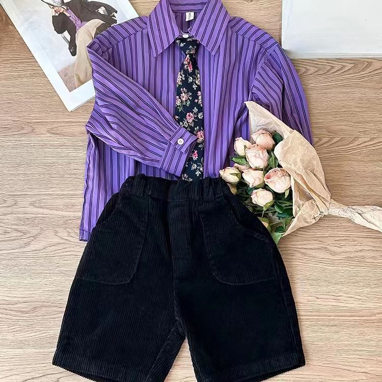 소년 가을 정장 2023 새로운 아기 소년 보라색 긴팔 셔츠 다목적 코듀로이 7 팬츠 투피스 세트