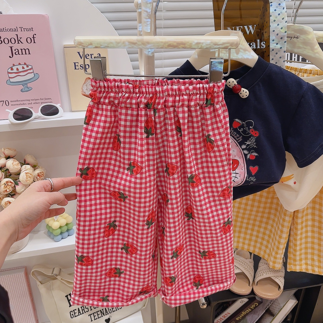 어린이 여름 새로운 어린이 캐주얼 만화 자수 반팔 체크 무늬 바지 세트 소녀 세련된 패션 반팔 티셔츠