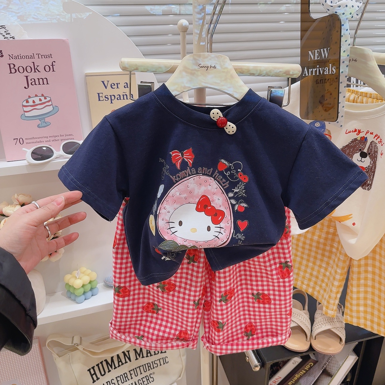 어린이 여름 새로운 어린이 캐주얼 만화 자수 반팔 체크 무늬 바지 세트 소녀 세련된 패션 반팔 티셔츠스토어 가기