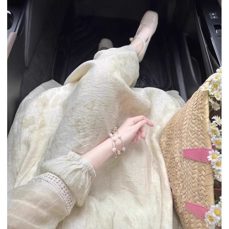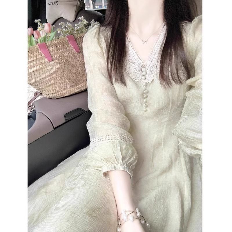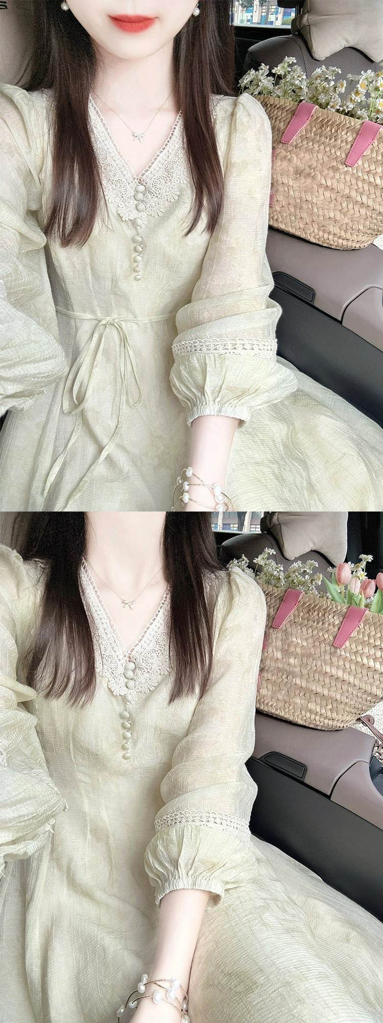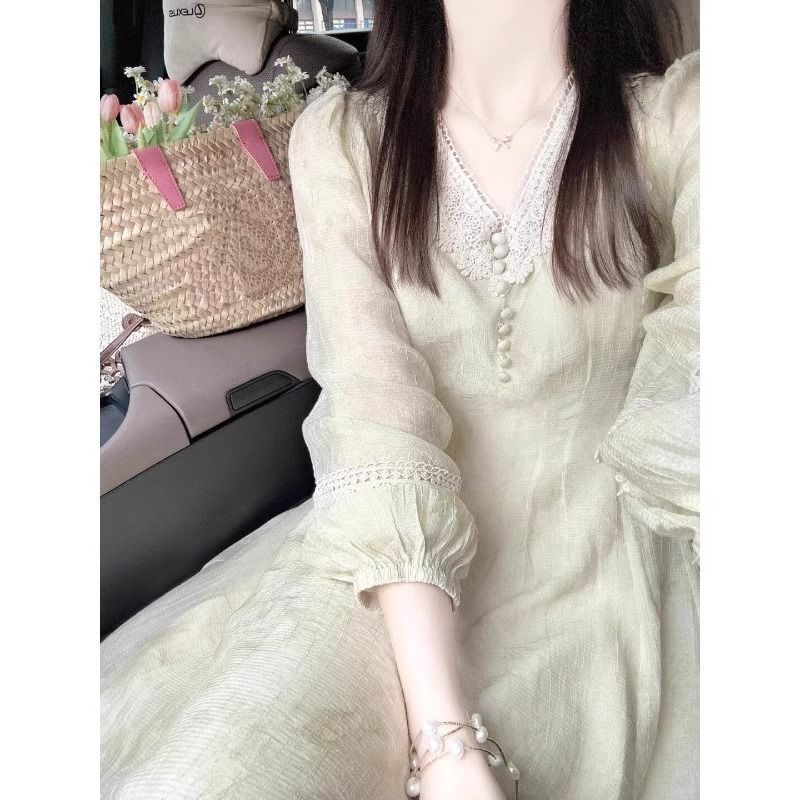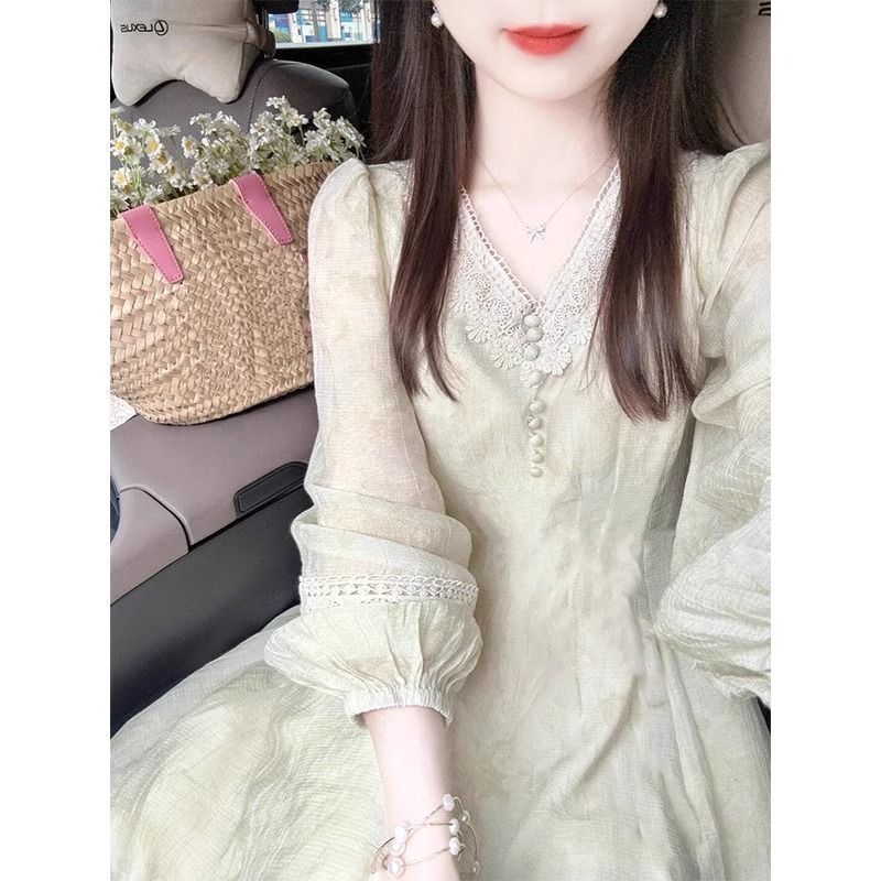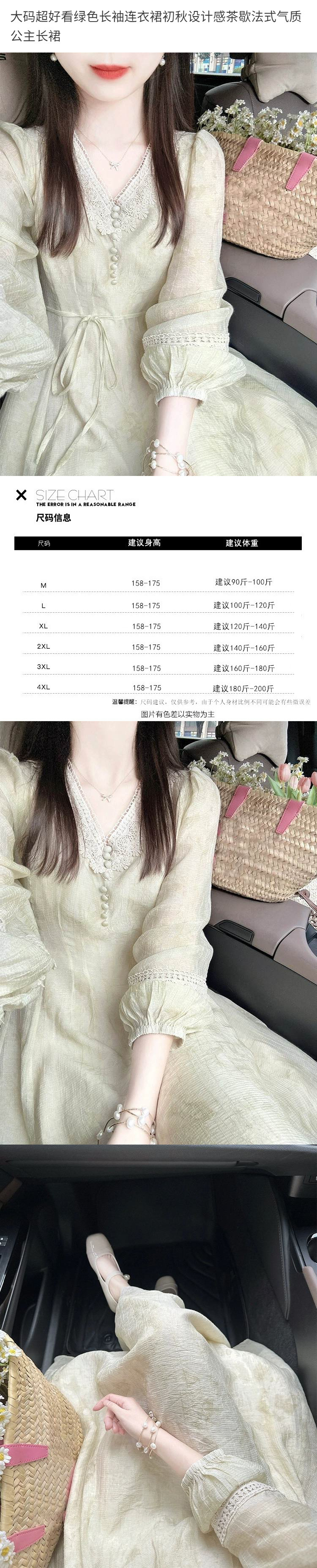 플러스 사이즈 슈퍼 좋은 녹색 긴 소매 원피스 초기 디자인 차 휴식 프랑스 비행 소매 긴 원피스스토어 가기
