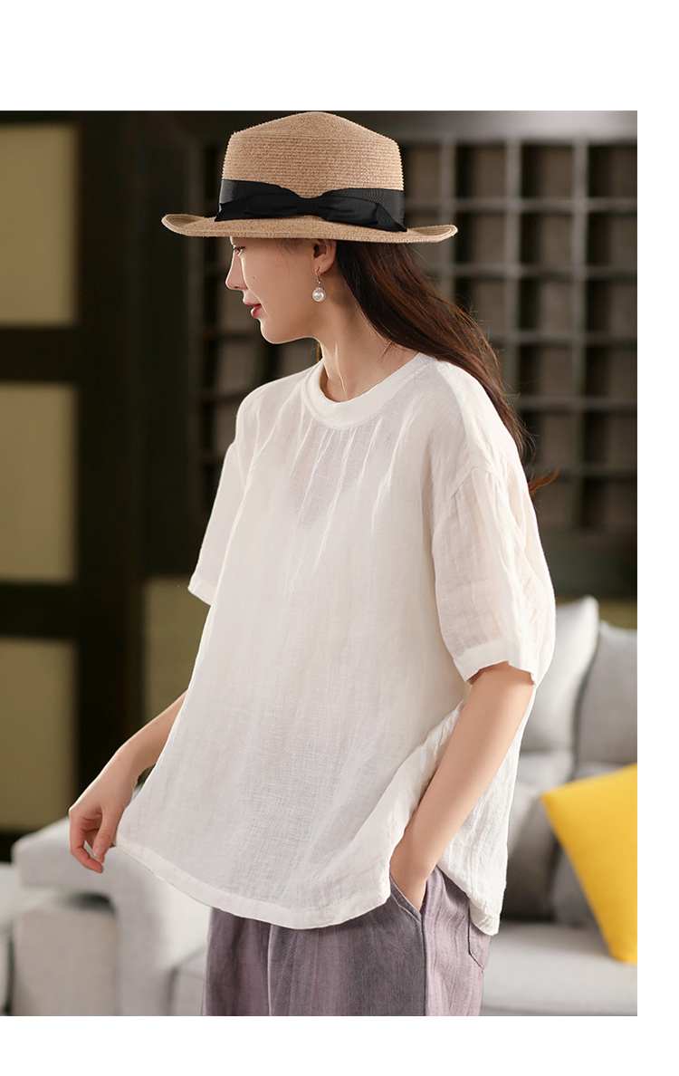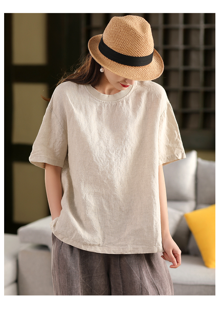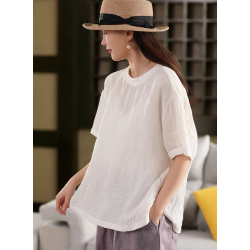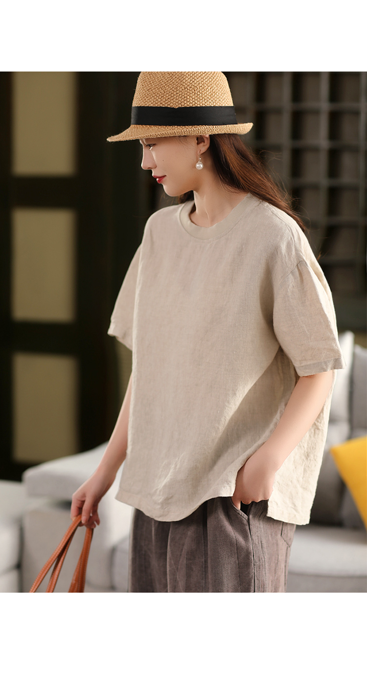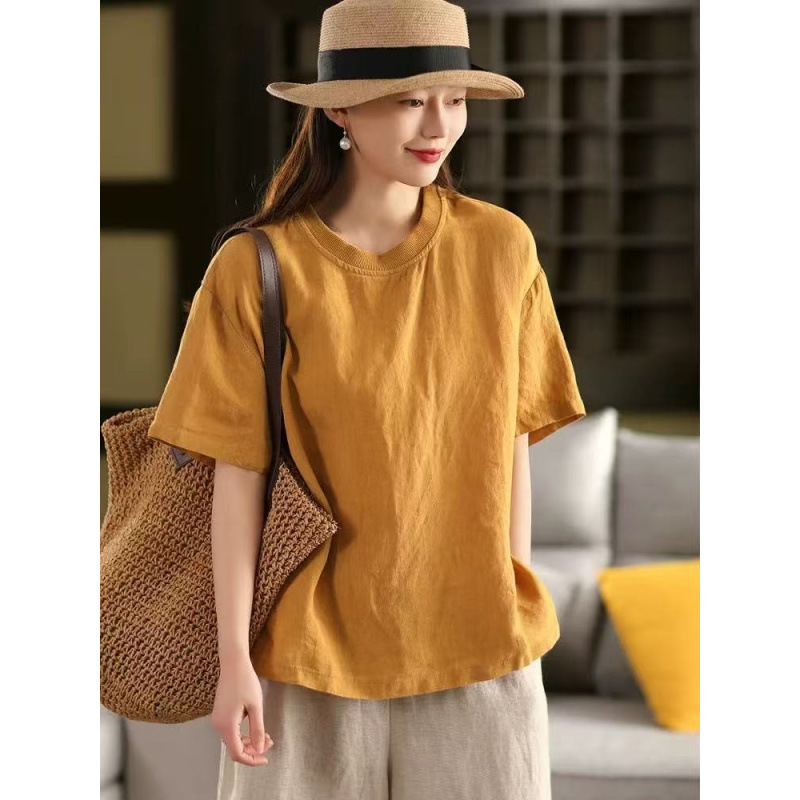 2025 년 여름 뉴 리넨 탑 여성 스티칭 스레드 라운드 넥 반팔 셔츠 캐주얼 풀오버 티셔츠