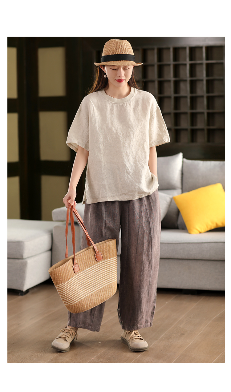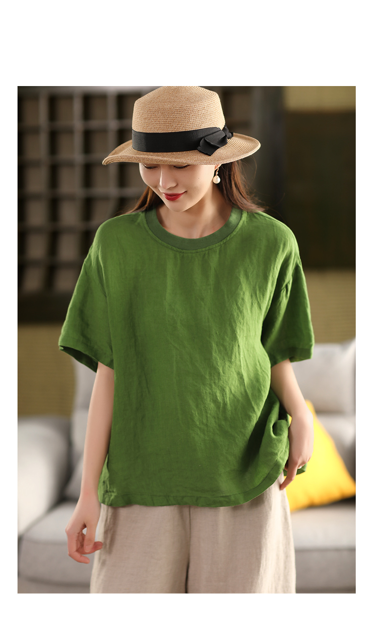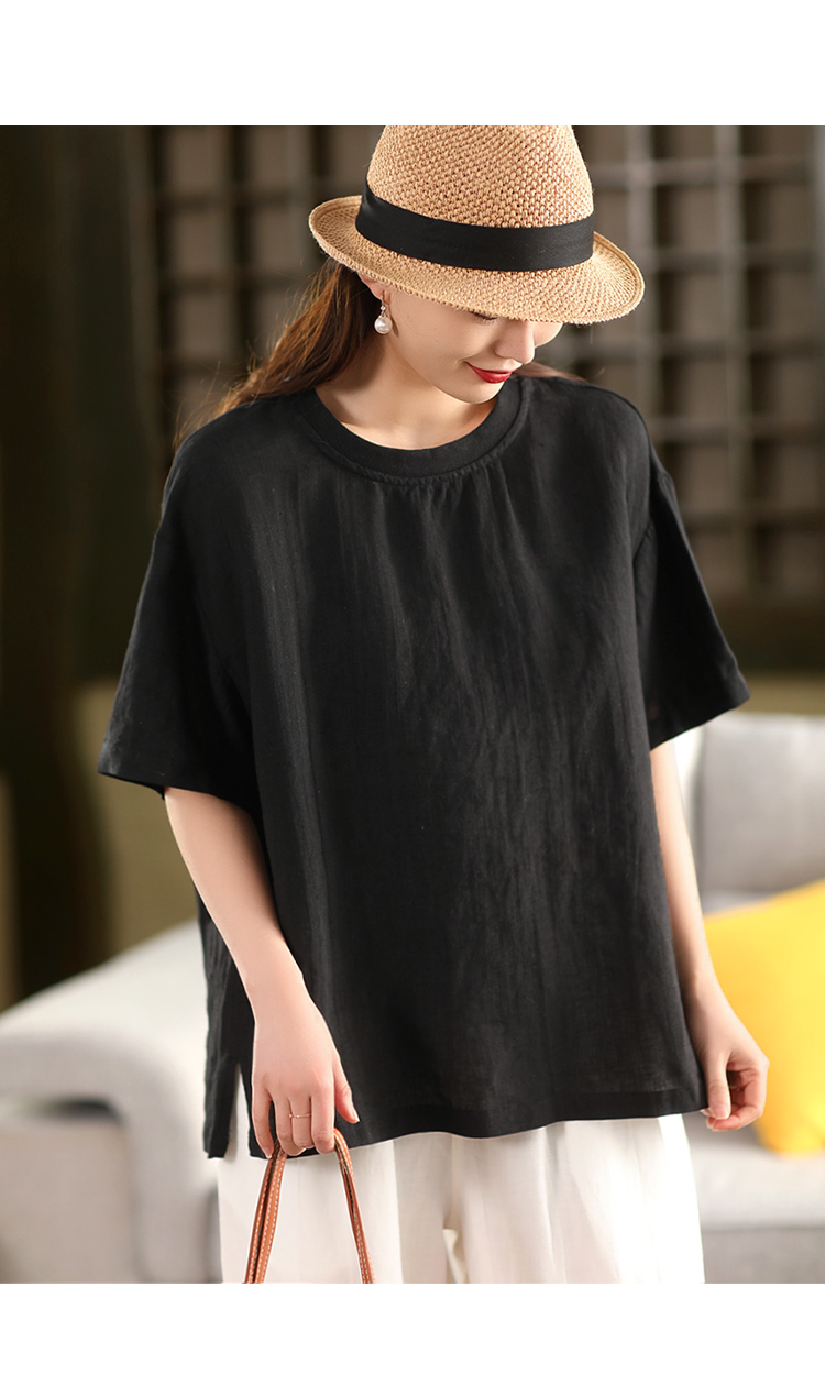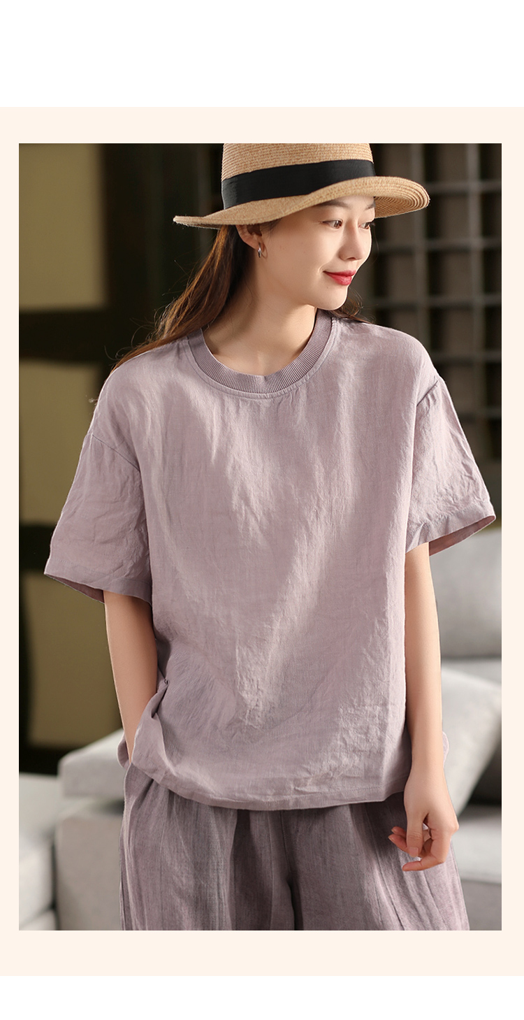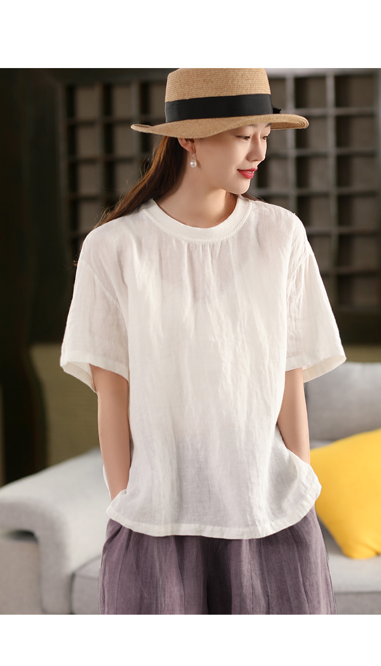 2025 년 여름 뉴 리넨 탑 여성 스티칭 스레드 라운드 넥 반팔 셔츠 캐주얼 풀오버 티셔츠