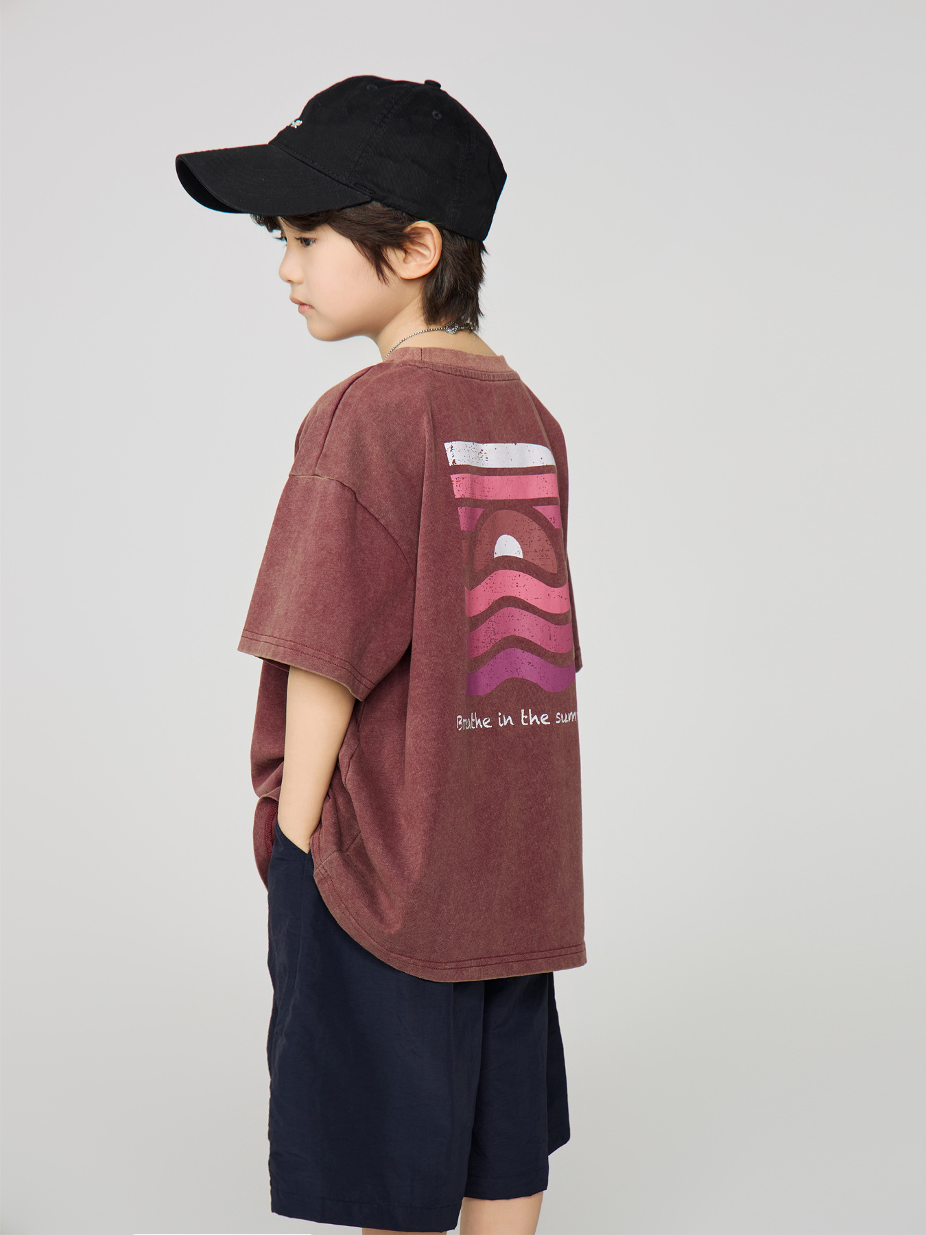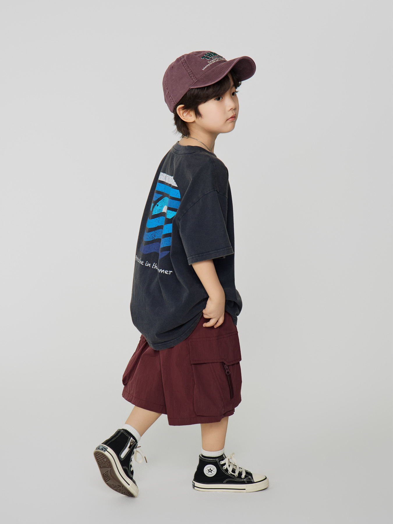 2025 년 여름 새로운 어린이 일본식 캐주얼 레터 인쇄 반팔 남성 중 큰 어린이 튀김 올드 빈티지 티셔츠스토어 가기