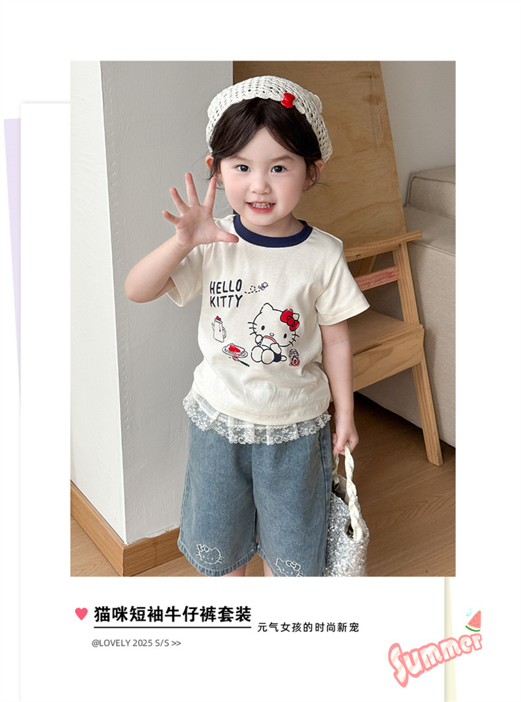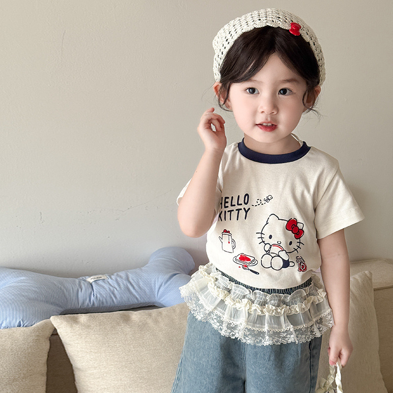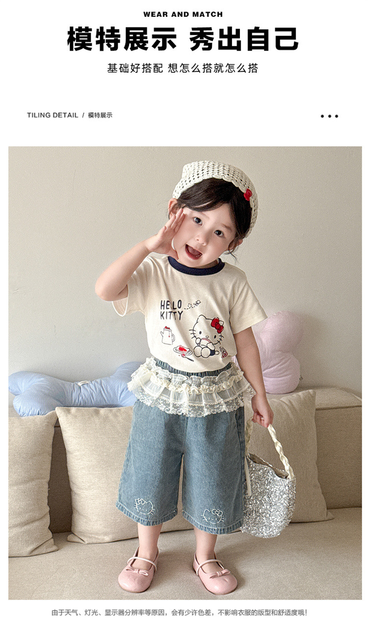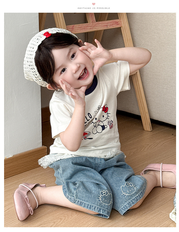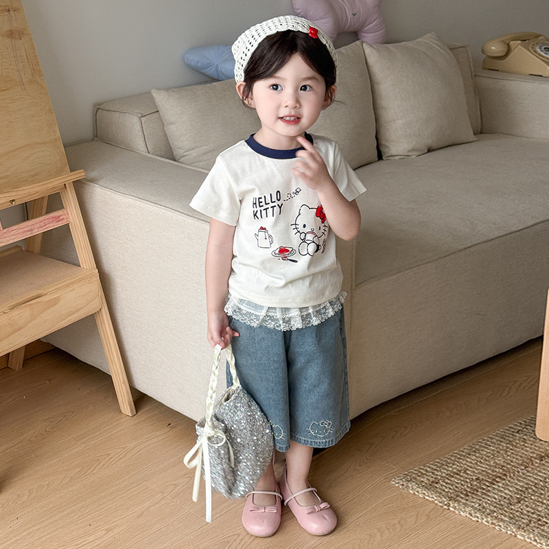아기 소녀의 반팔 티셔츠 세트 여름 얇은 어린이 레이스 청바지 캐주얼 반소매 투피스 여름 패션스토어 가기