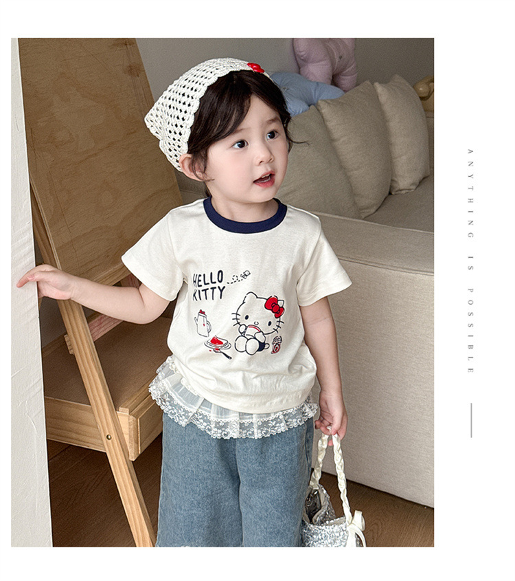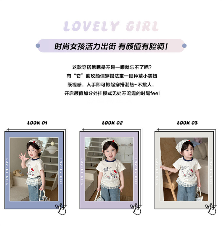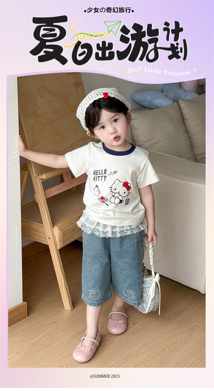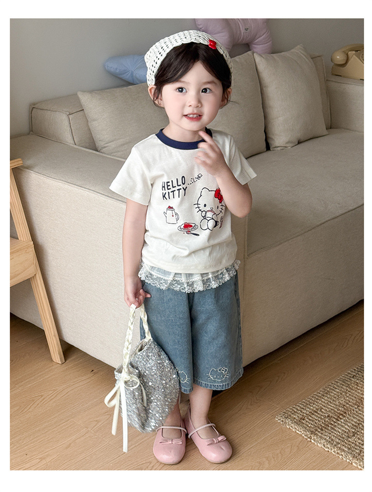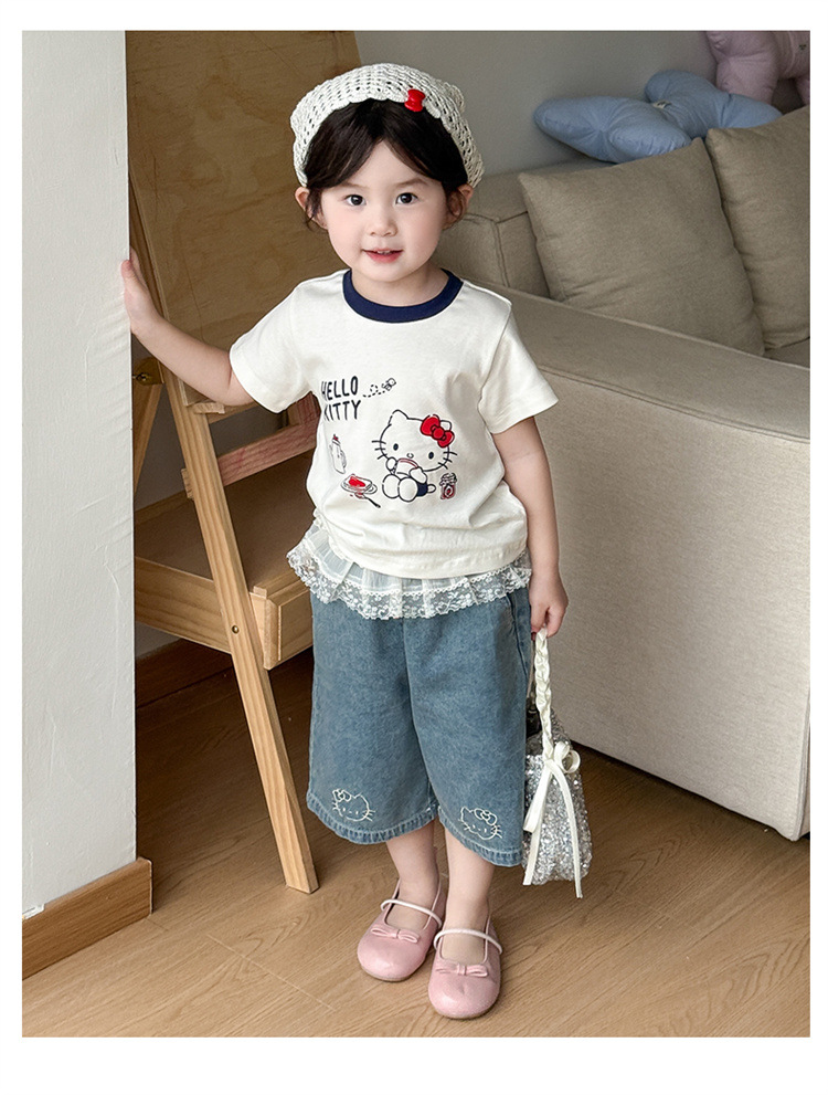 아기 소녀의 반팔 티셔츠 세트 여름 얇은 어린이 레이스 청바지 캐주얼 반소매 투피스 여름 패션스토어 가기
