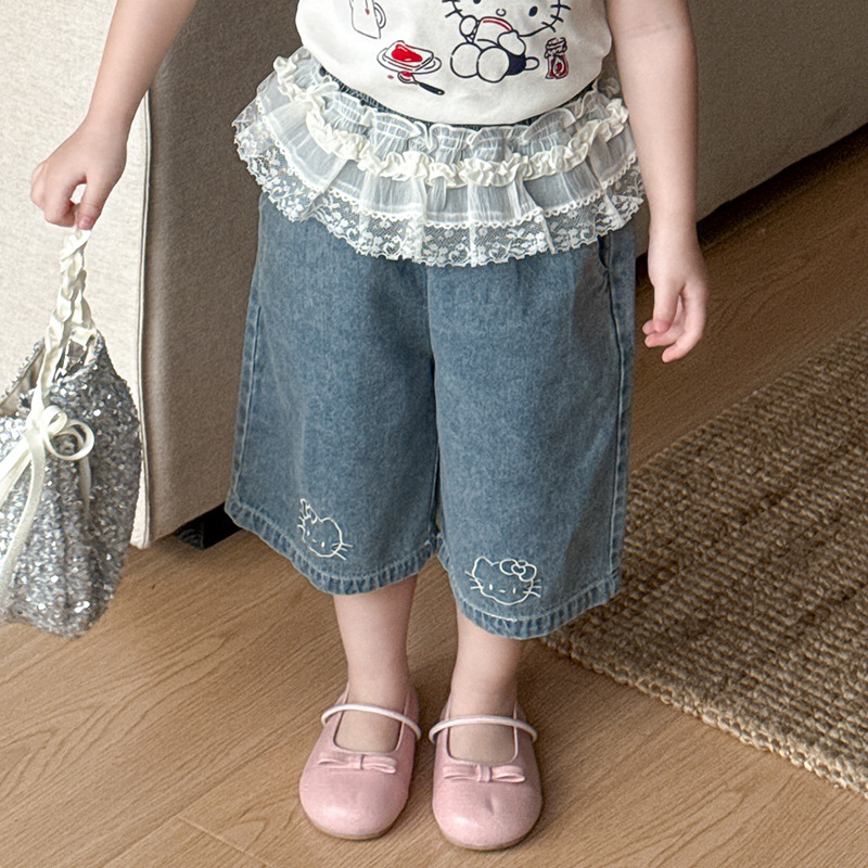 아기 소녀의 반팔 티셔츠 세트 여름 얇은 어린이 레이스 청바지 캐주얼 반소매 투피스 여름 패션