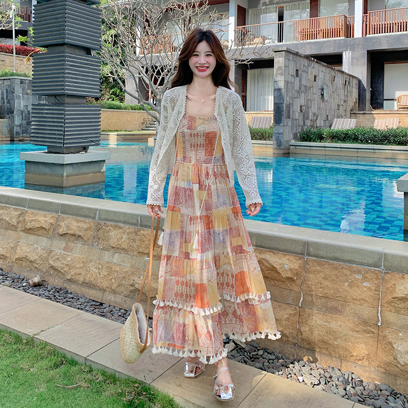 리얼 샷 보헤미안 스트랩 도파민 원피스 긴 2025 뉴 홀리데이 스타일 비치 원피스 할로우 카디건
