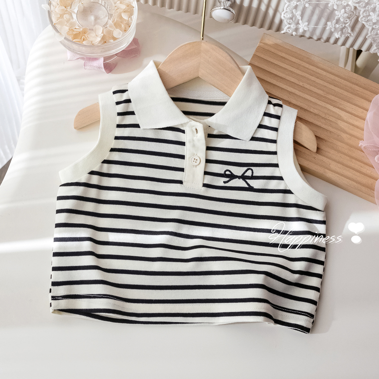 여자 여름 조끼 세련 된 줄무늬 대조 민소매 티셔츠 여성의 보물 한국 스타일 유행 활 자수 폴로 셔츠