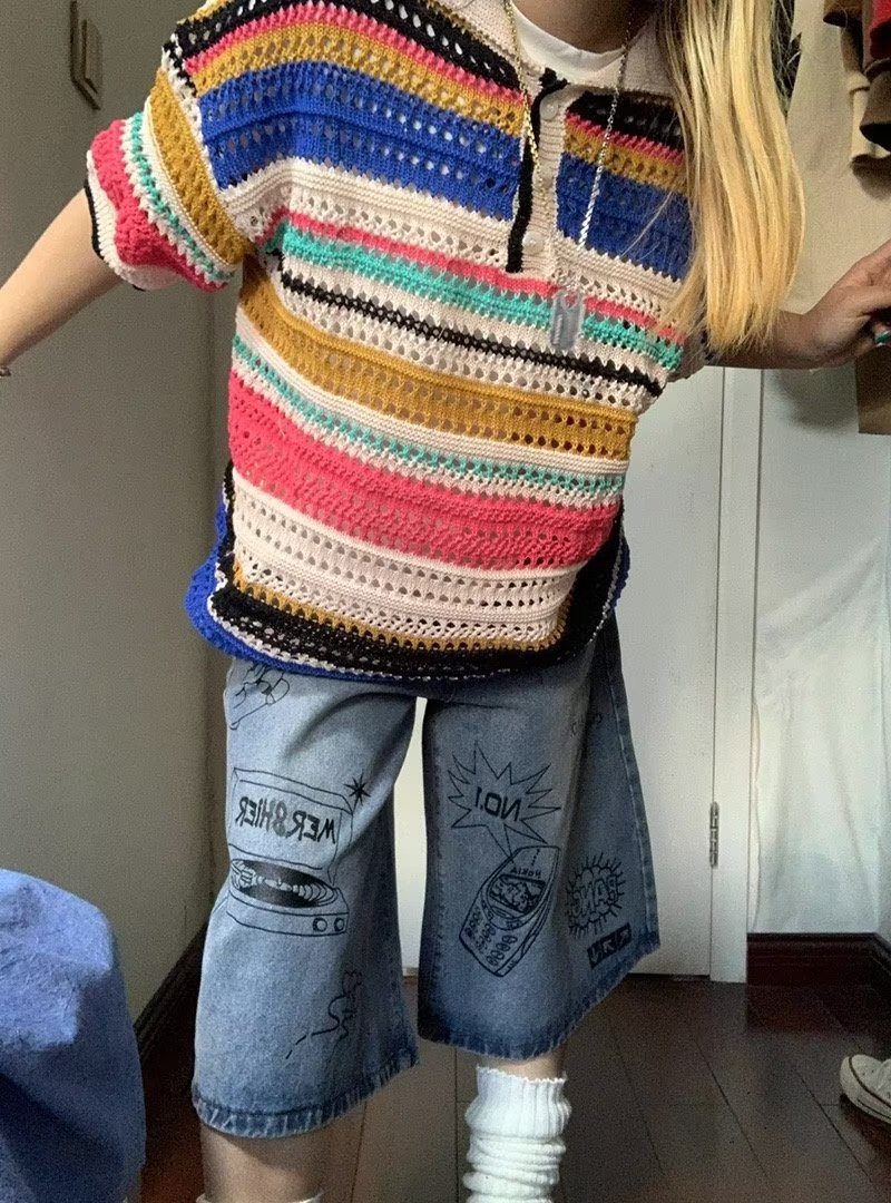새로운 느슨한 스트라이프 싱글 피스 스트리트 커플 남성과 여성 스웨터 트렌디 5부 소매 여성 풀오버 여름스토어 가기