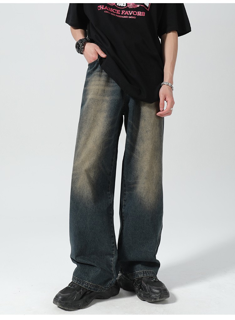 대외 무역 미국 하이 스트리트 레트로 워시 진한 파란색 청바지 남성용 스트레이트 루즈 슬림 캐주얼 바이브 바지 남성용스토어 가기