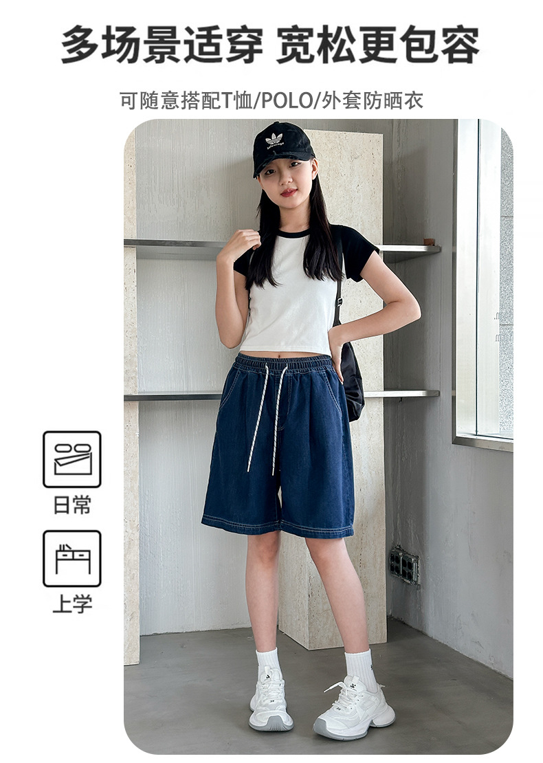 여자 데님 반바지 외복 2025 여름 새 스타일 중대형 어린이 느슨한 바지 어린이 5 점 바지 학생용 한국 스타일