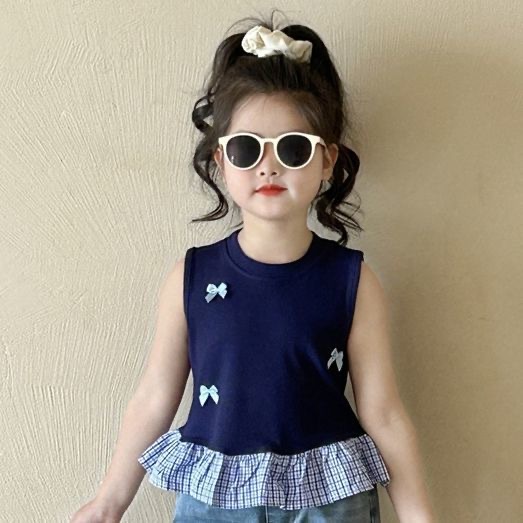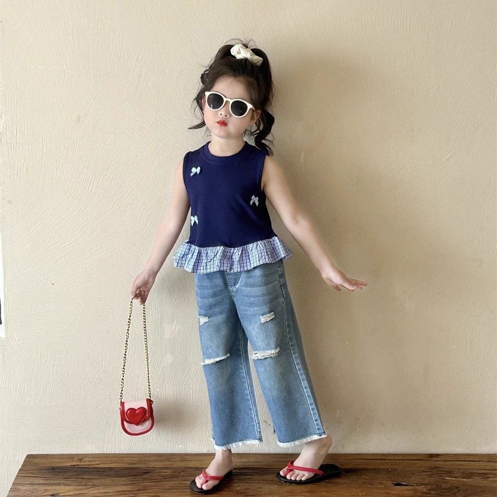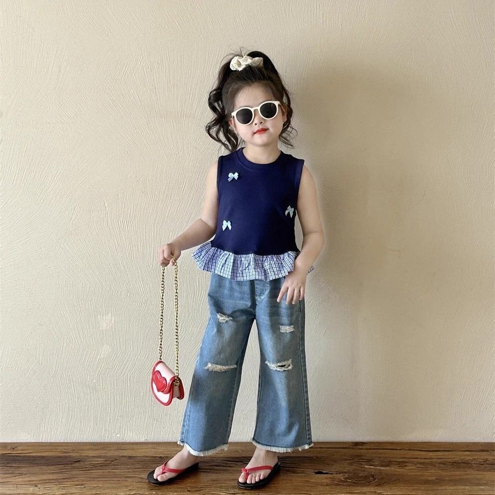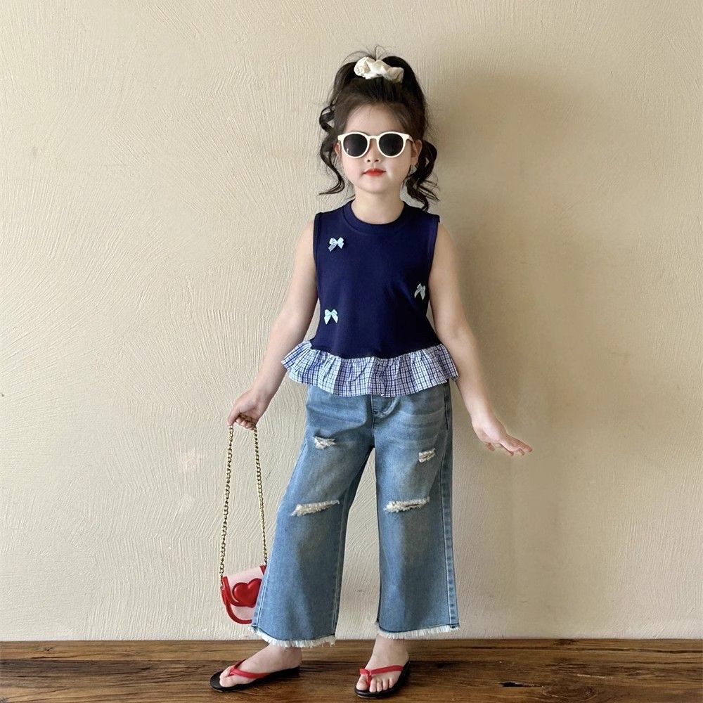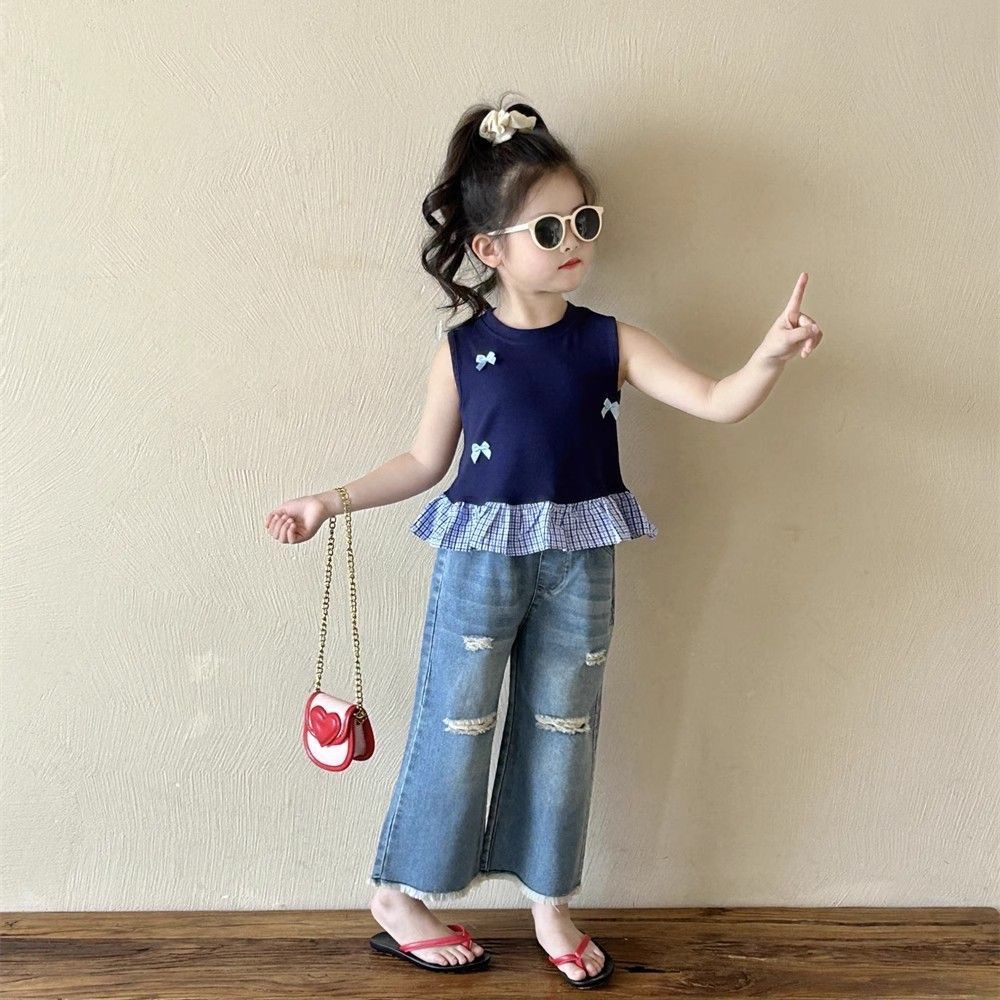 소녀 여름 세트 2025 새로운 도착 웨스턴 스타일 아기 소녀의 격자 무늬 레이스 보우 조끼 데님 넓은 다리 바지