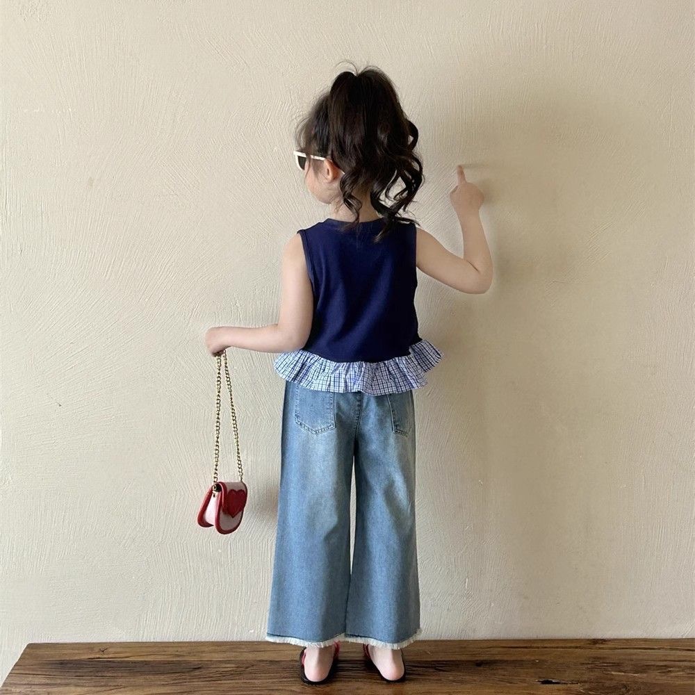 소녀 여름 세트 2025 새로운 도착 웨스턴 스타일 아기 소녀의 격자 무늬 레이스 보우 조끼 데님 넓은 다리 바지스토어 가기