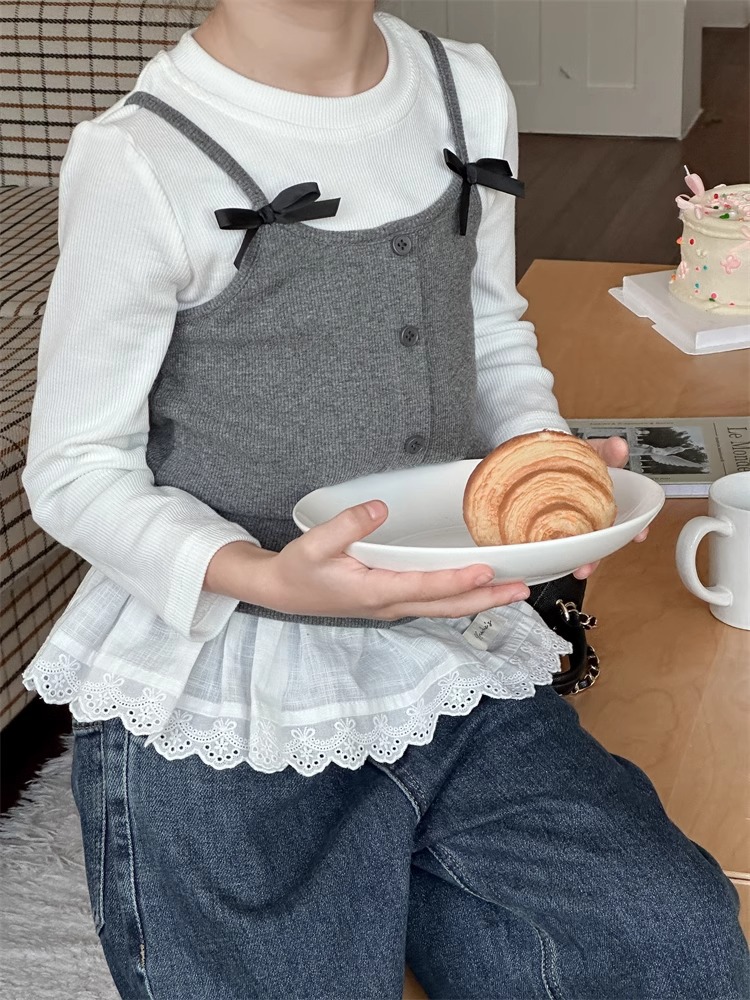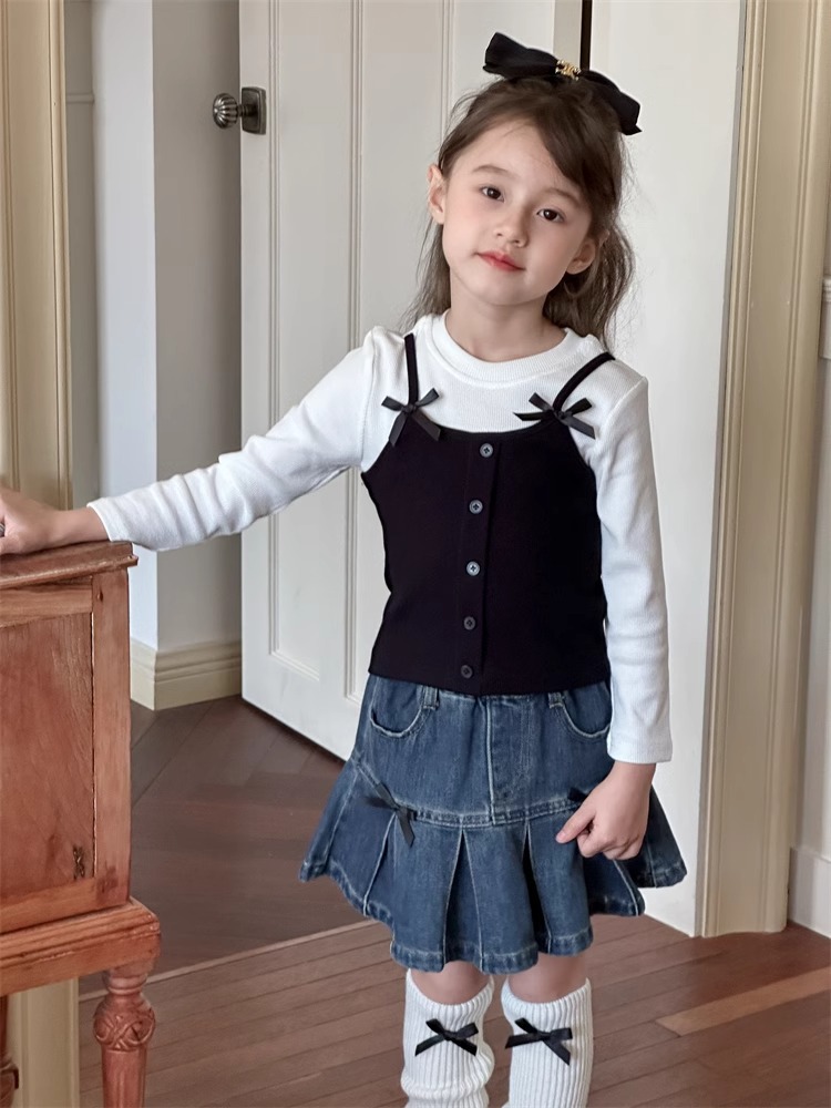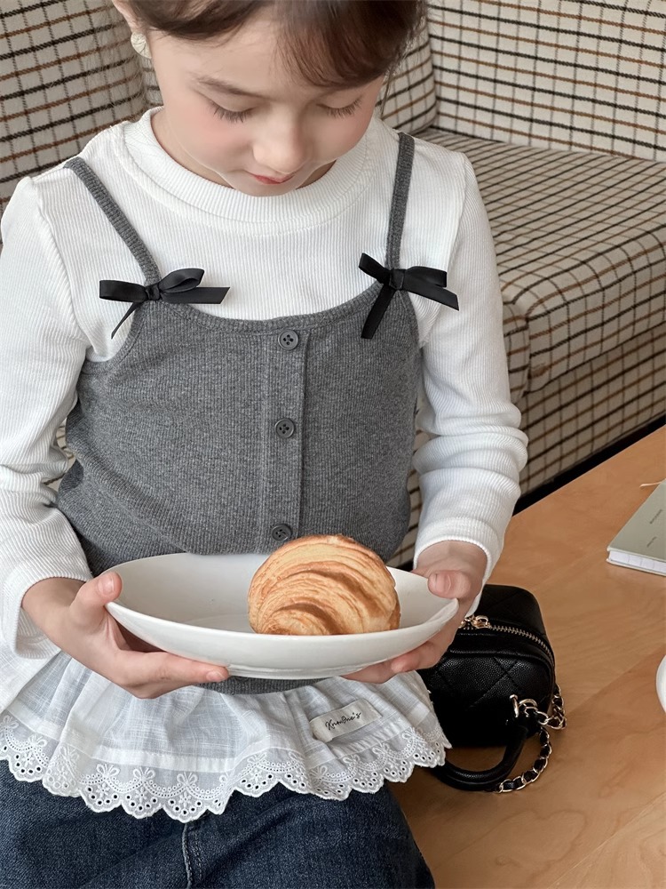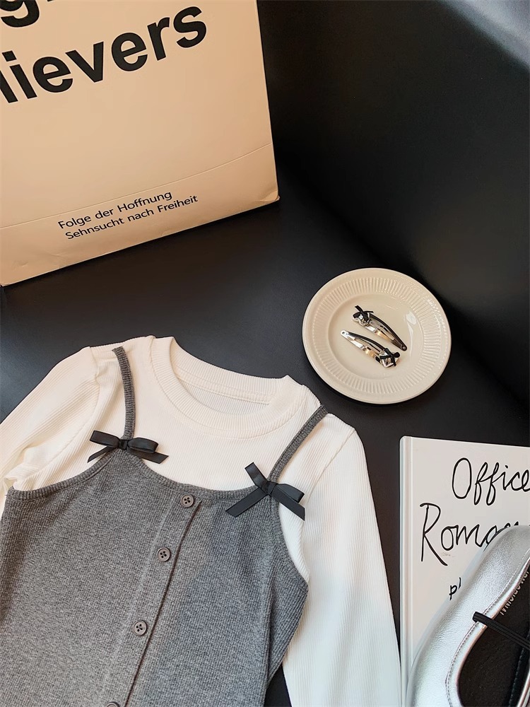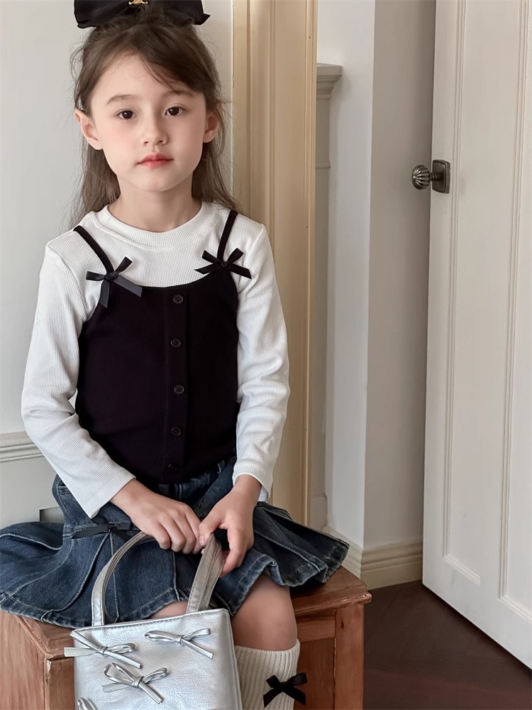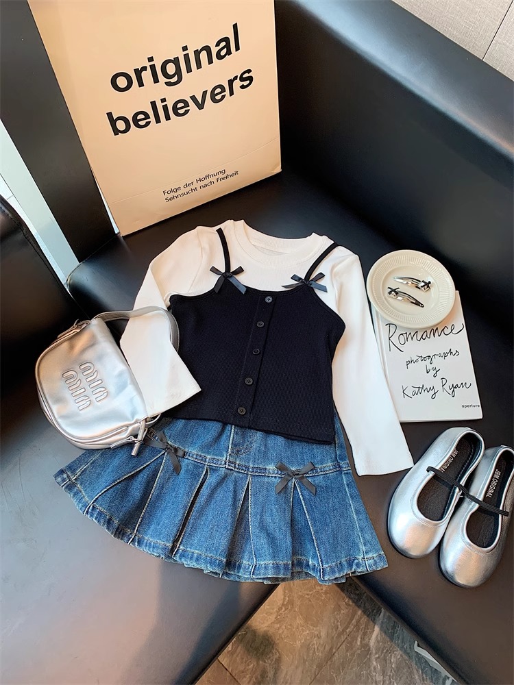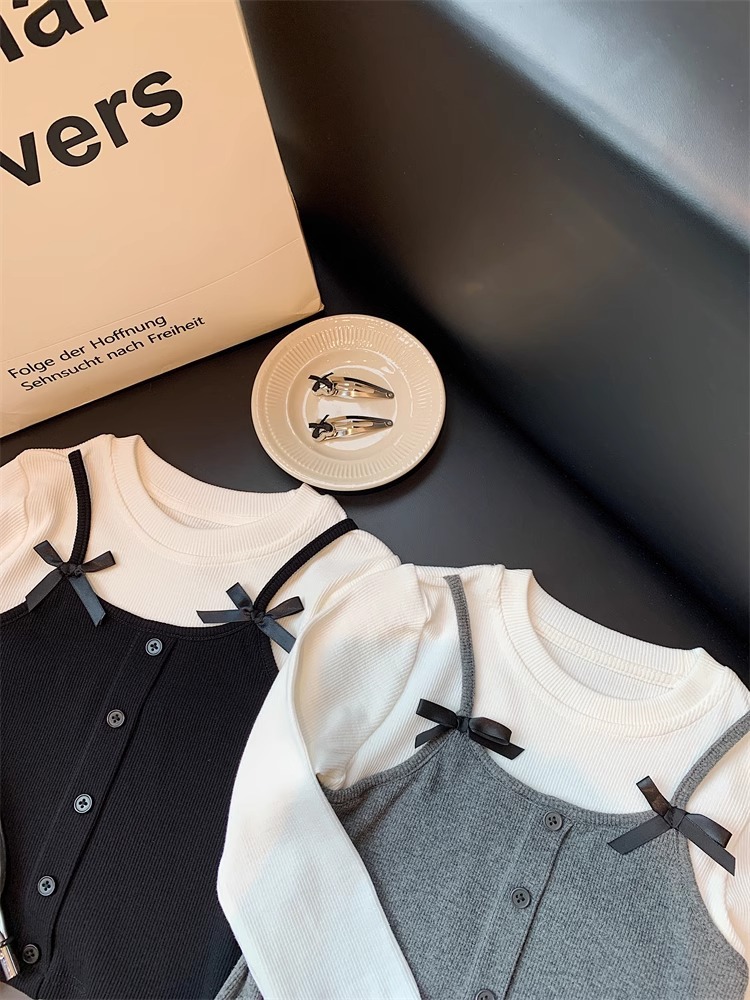 소녀 긴팔 보토밍 셔츠 얇은 스커트 봄 · 가을 소녀 쌓인 스트랩 바느질 가짜 투피스 한국식 스커트 아동복스토어 가기