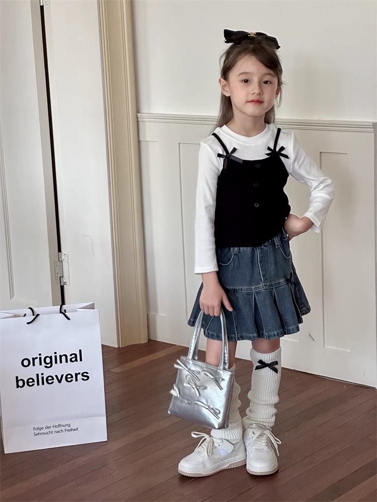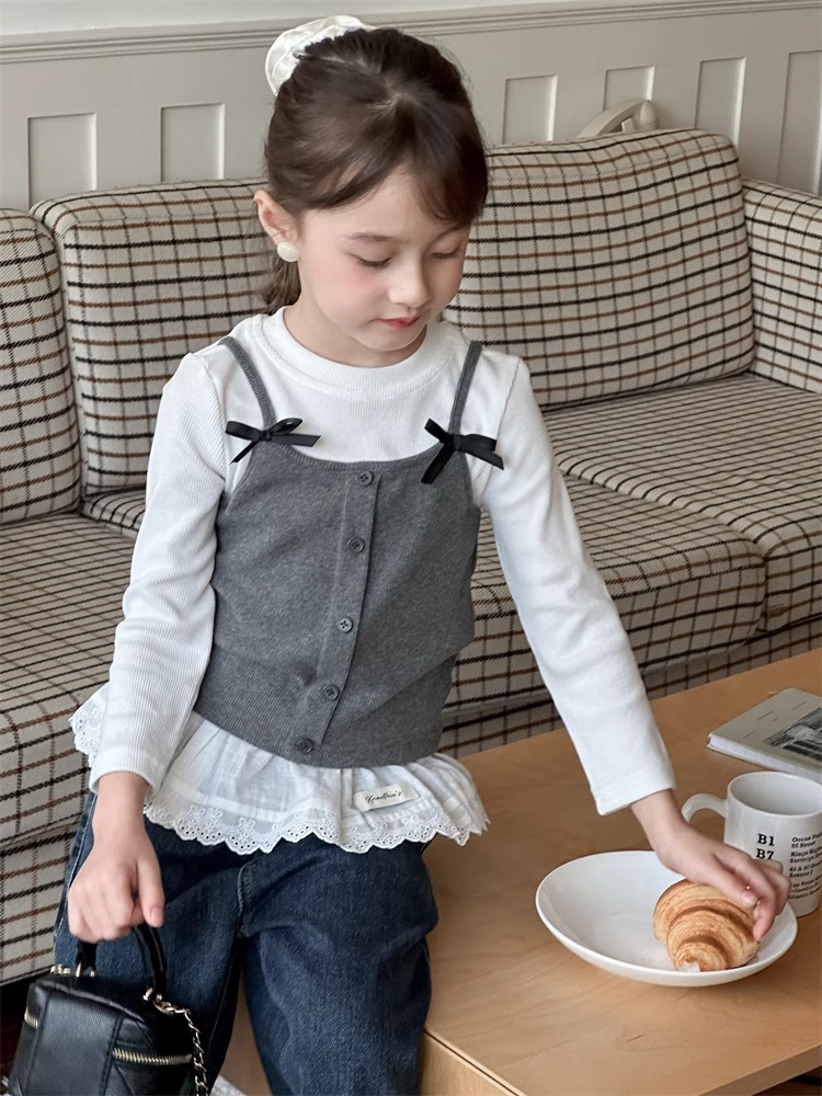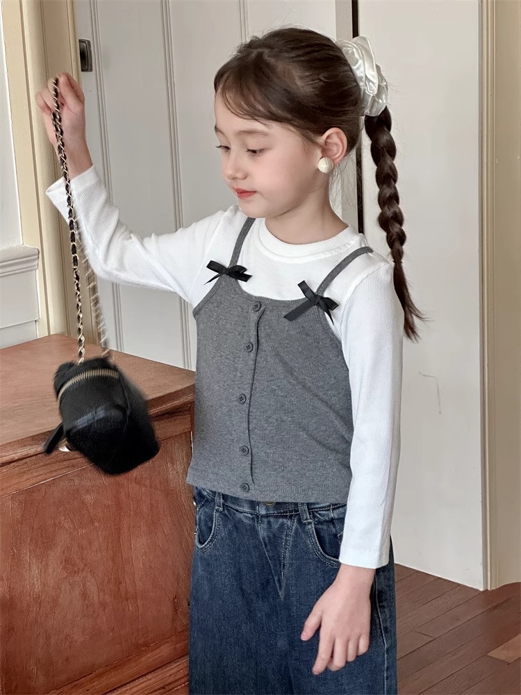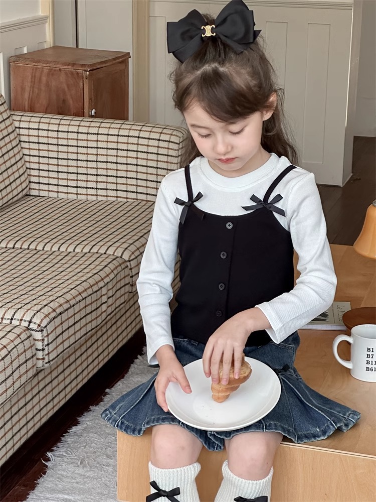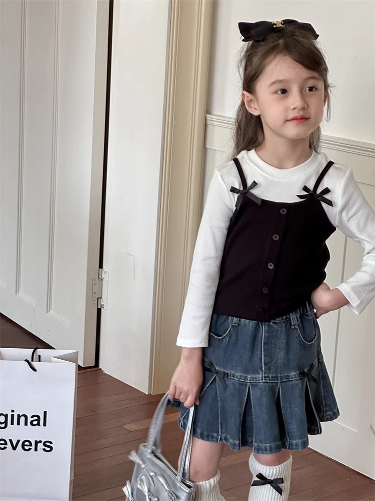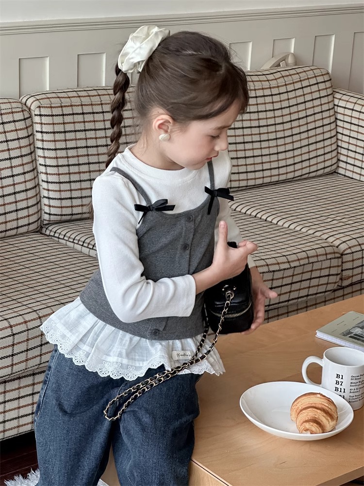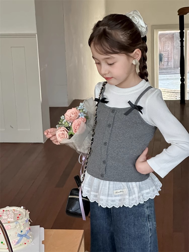 소녀 긴팔 보토밍 셔츠 얇은 스커트 봄 · 가을 소녀 쌓인 스트랩 바느질 가짜 투피스 한국식 스커트 아동복스토어 가기