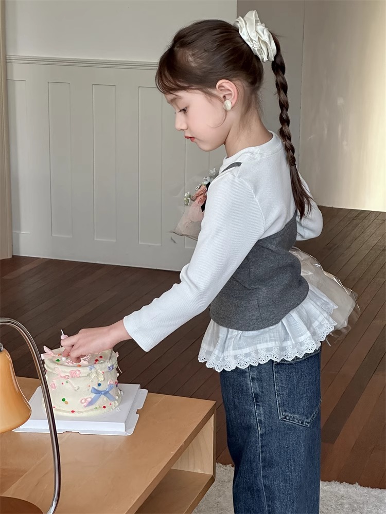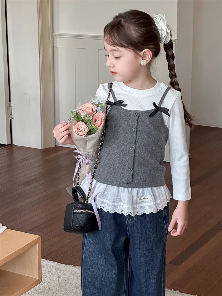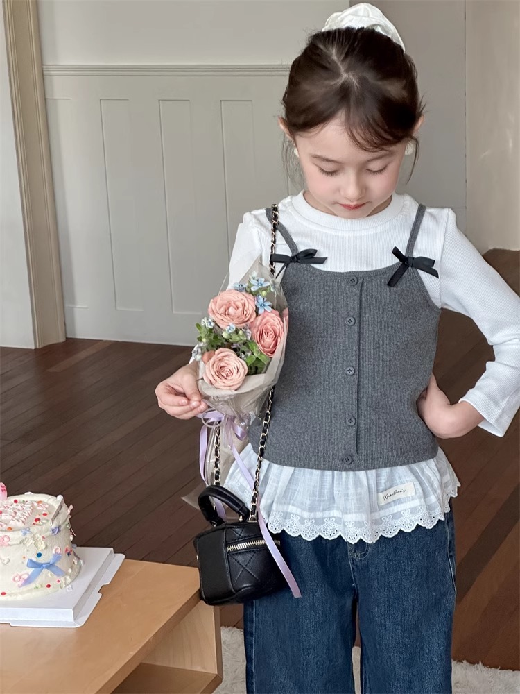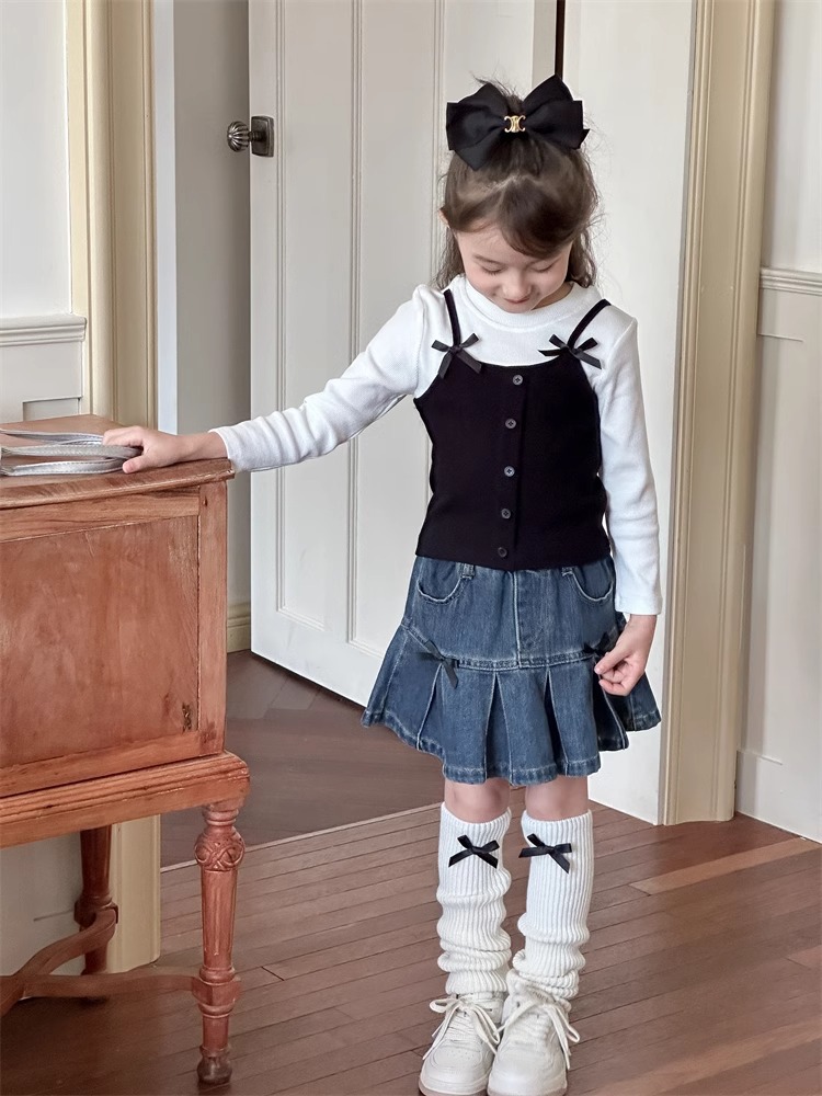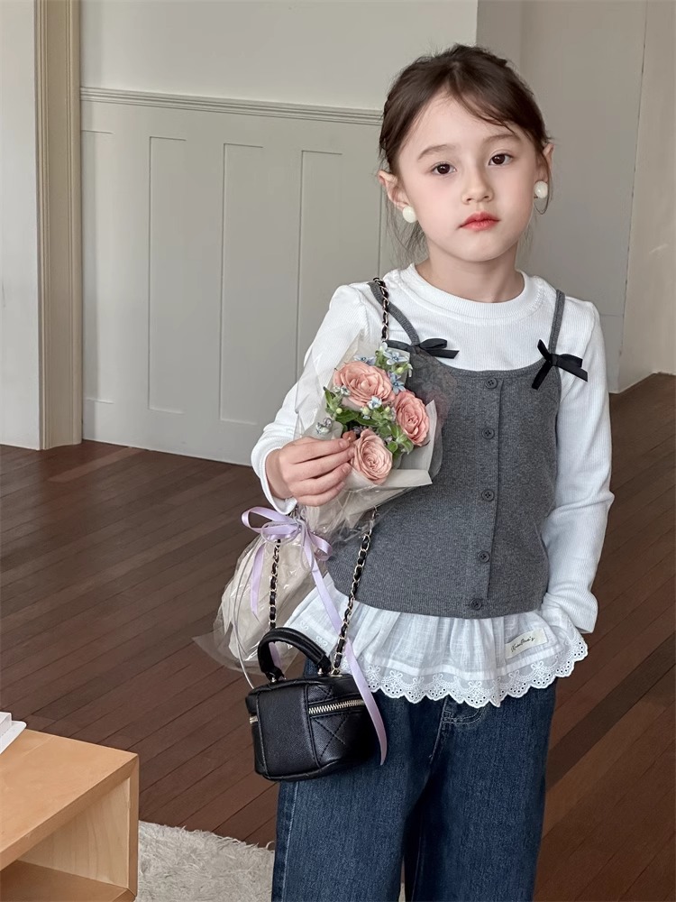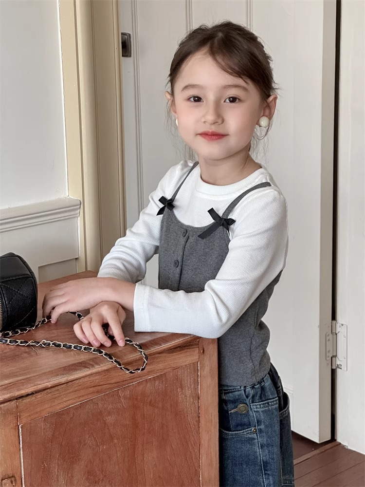 소녀 긴팔 보토밍 셔츠 얇은 스커트 봄 · 가을 소녀 쌓인 스트랩 바느질 가짜 투피스 한국식 스커트 아동복스토어 가기
