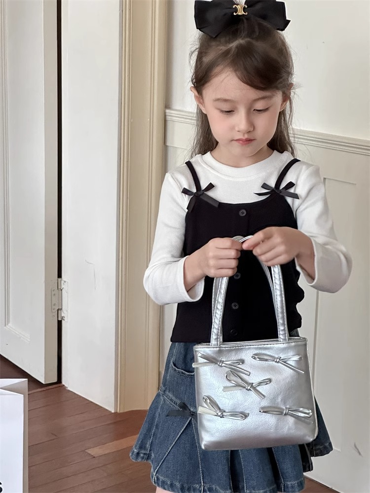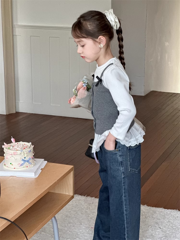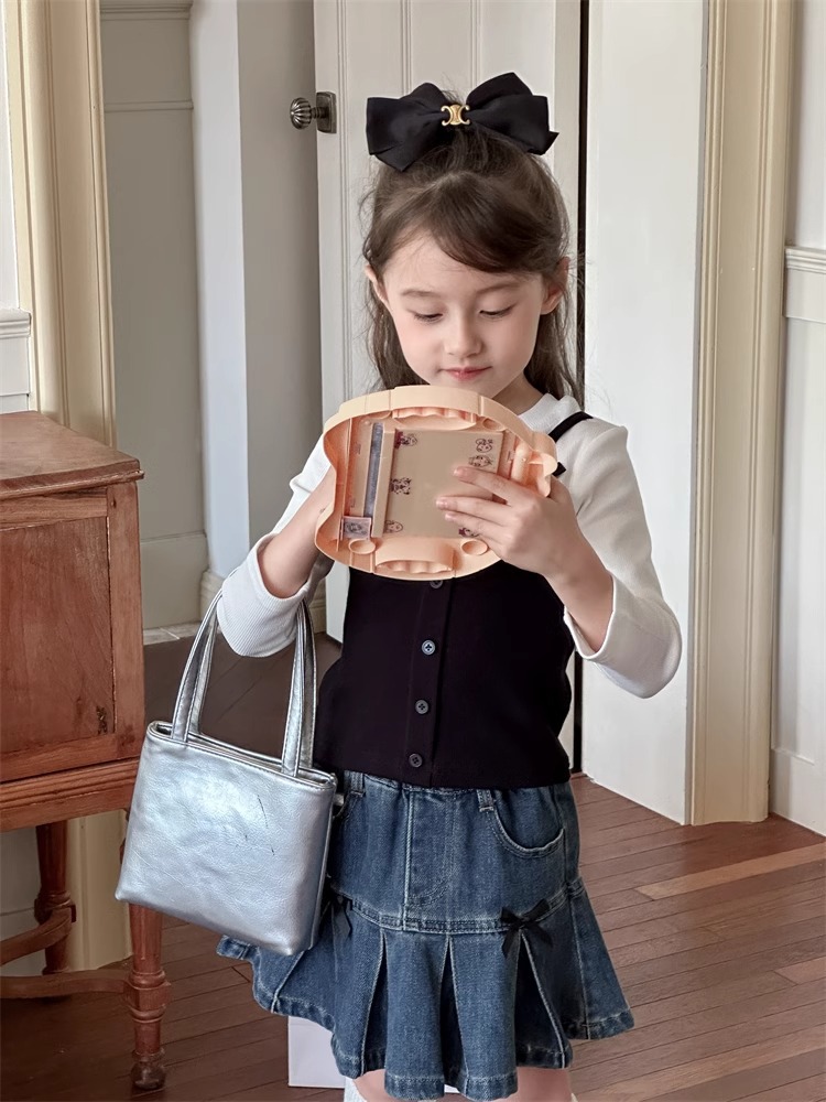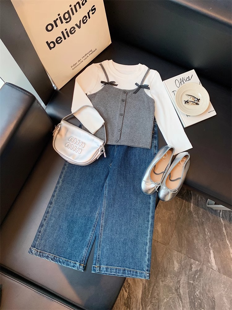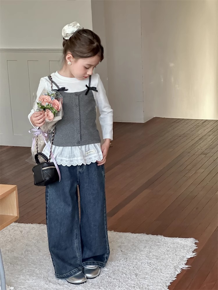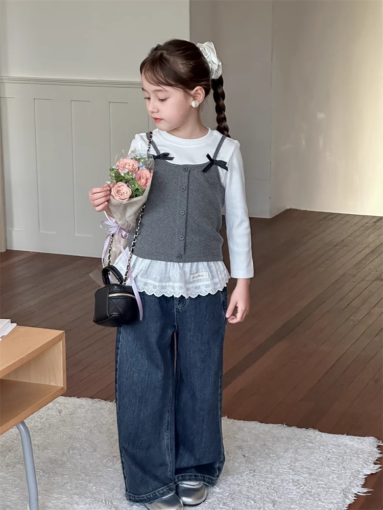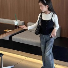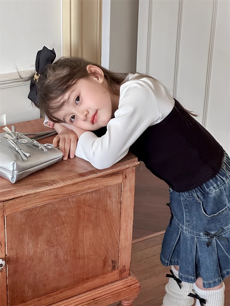 소녀 긴팔 보토밍 셔츠 얇은 스커트 봄 · 가을 소녀 쌓인 스트랩 바느질 가짜 투피스 한국식 스커트 아동복스토어 가기