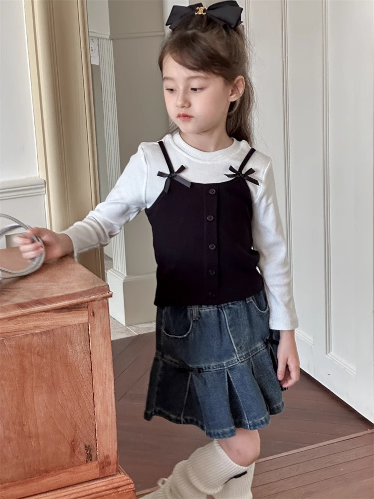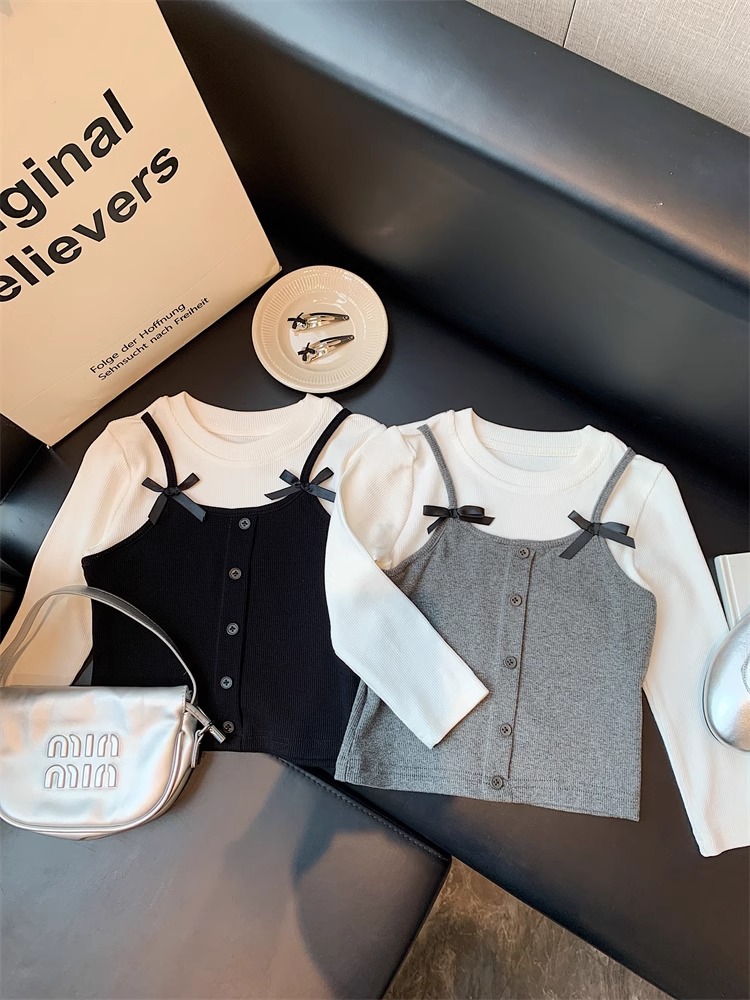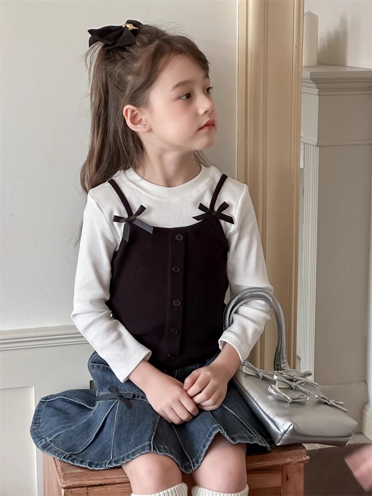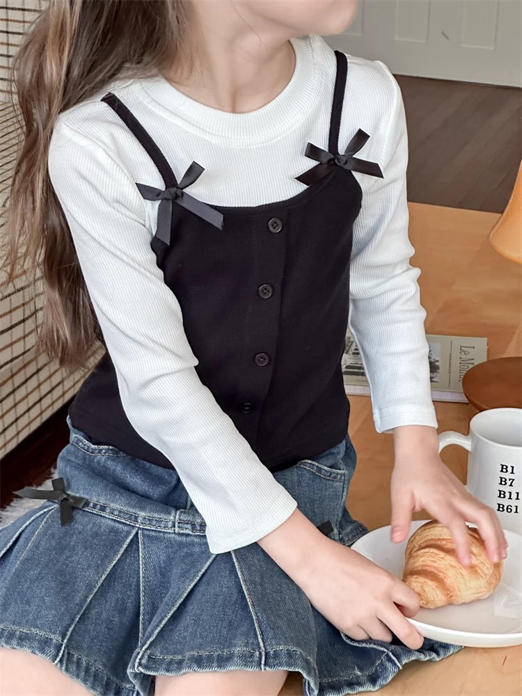 소녀 긴팔 보토밍 셔츠 얇은 스커트 봄 · 가을 소녀 쌓인 스트랩 바느질 가짜 투피스 한국식 스커트 아동복