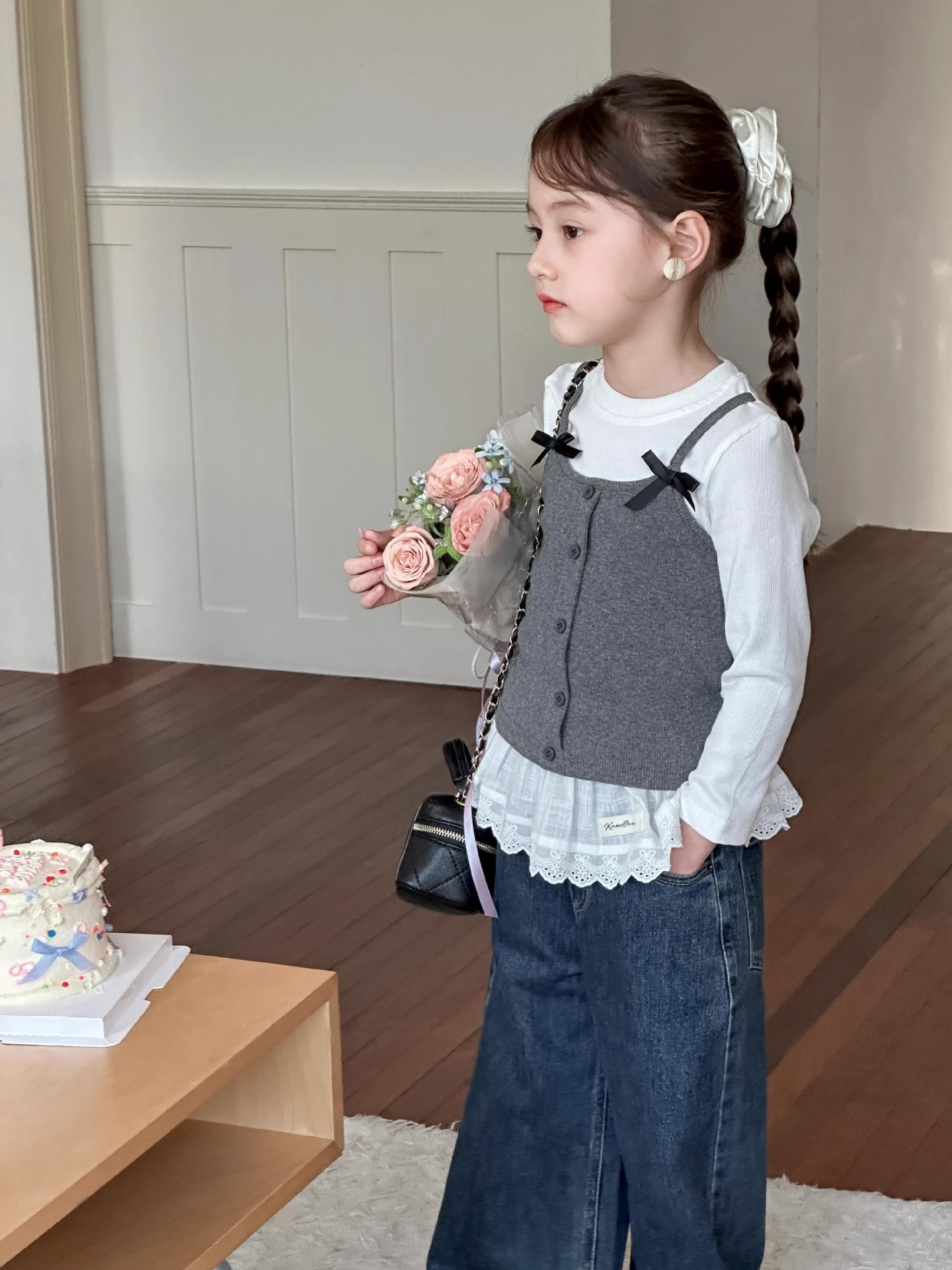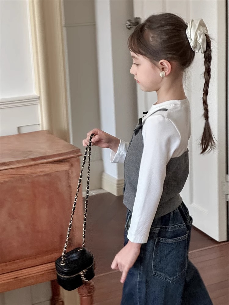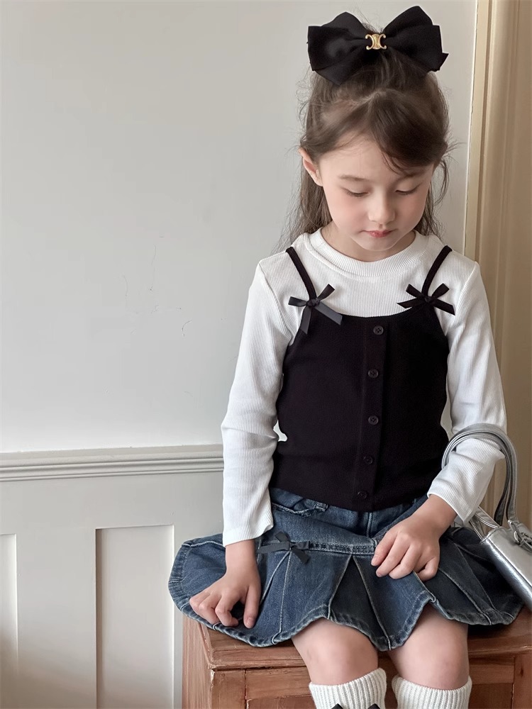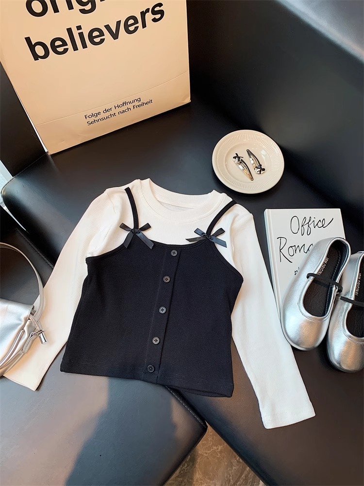 소녀 긴팔 보토밍 셔츠 얇은 스커트 봄 · 가을 소녀 쌓인 스트랩 바느질 가짜 투피스 한국식 스커트 아동복