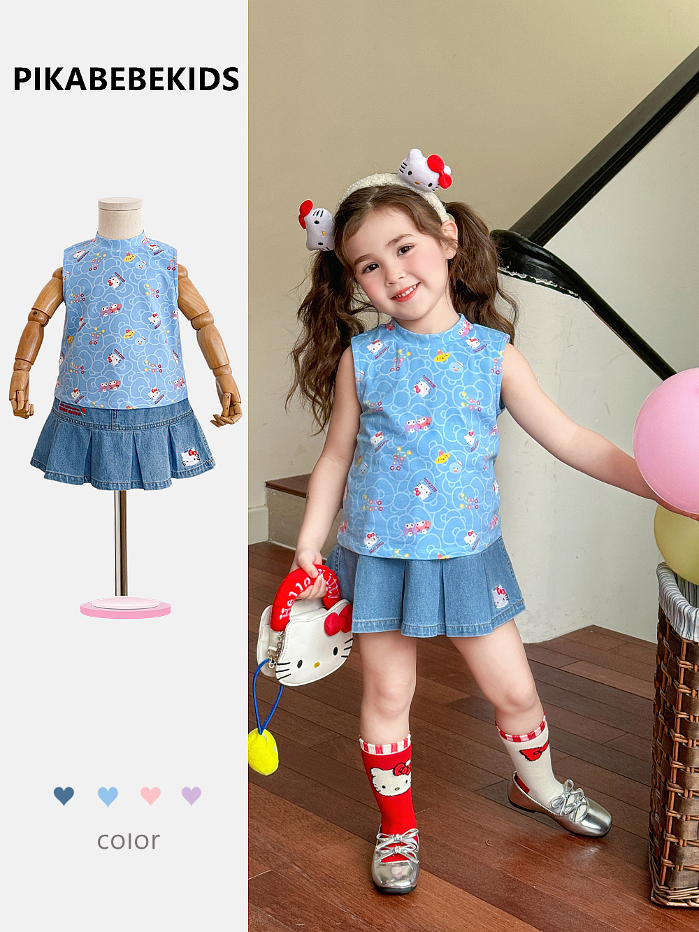 HELLOKT 여아 여름 아동 만화 귀여운 상의 데님 스커트 투피스 세트